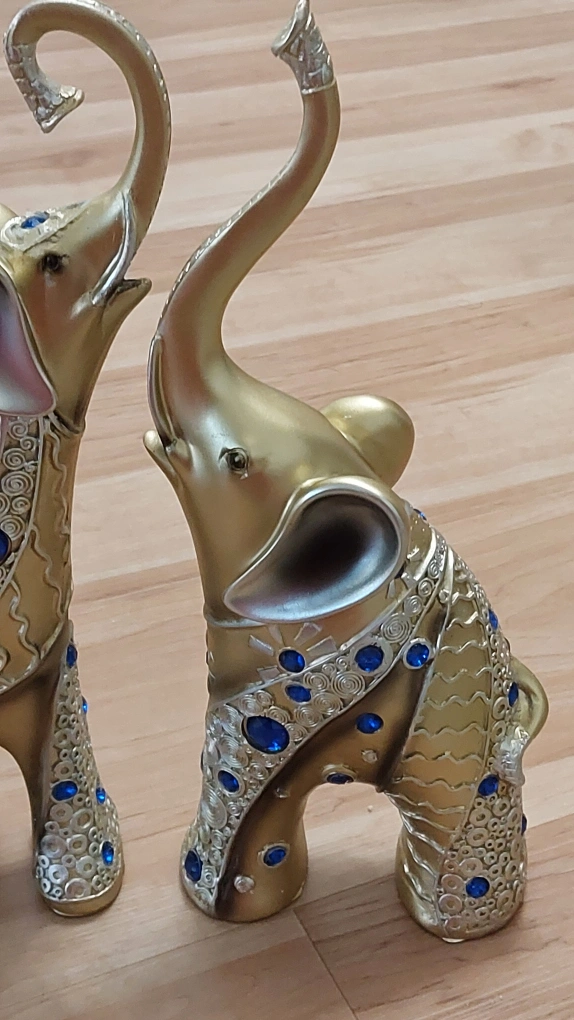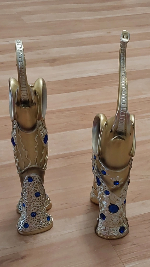 A set of two gold and blue elephant figurines. The elephants are intricately decorated with detailed carvings and blue rhinestones. Each elephant has a raised trunk. Smoke free and pet free home Kindly note all sales are final and no return or refund Please check my other listings aswell😊