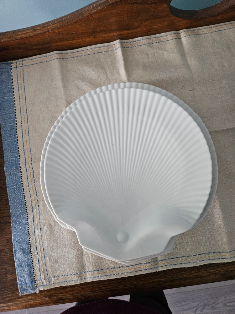 Three white ceramic plates that are shaped like a scallop shell. Used as serving pieces for seafood. $5 for all 3. Pick up only in Malton area of Mississauga (Airport Rd and Morningstar Dr)