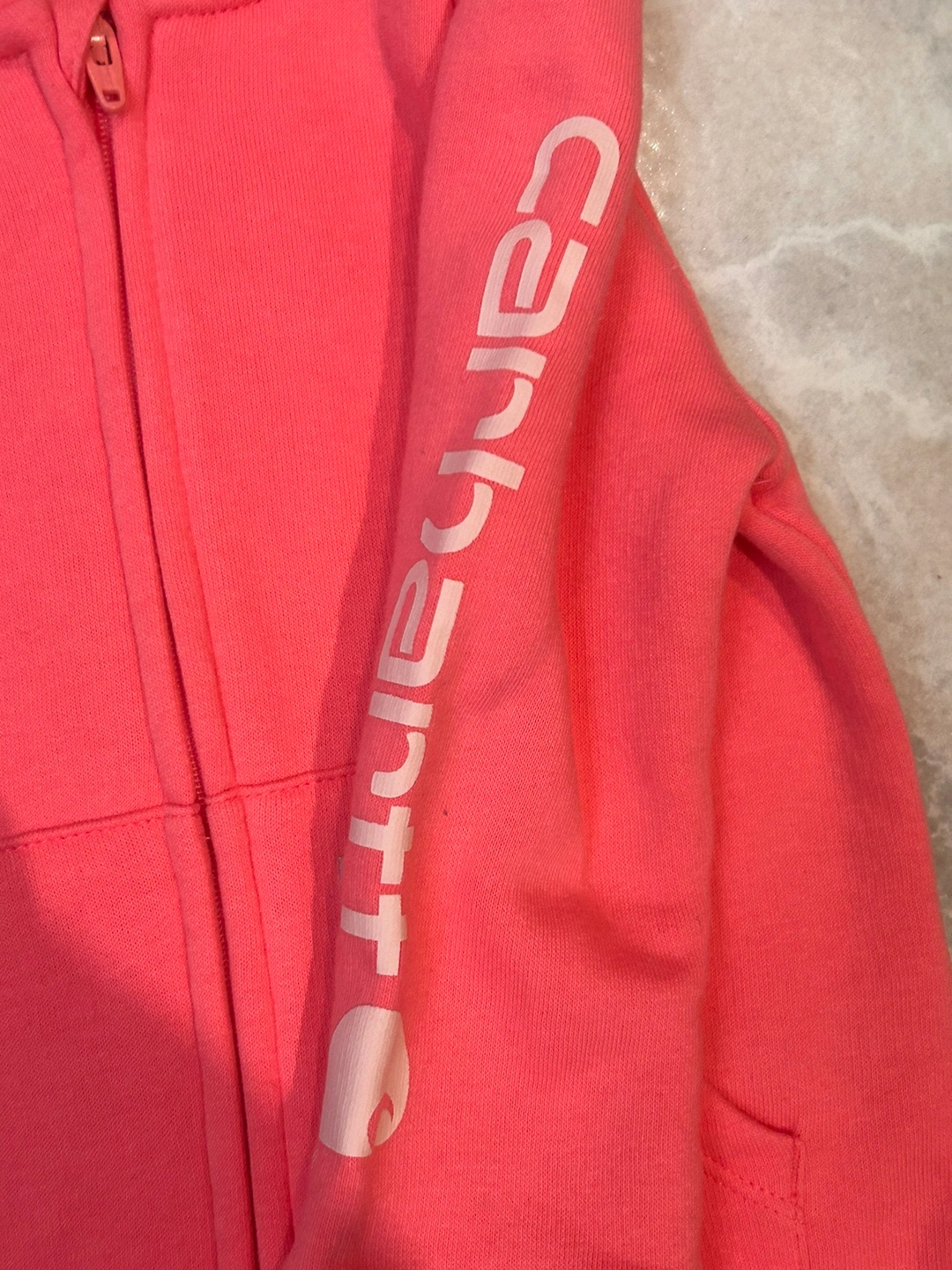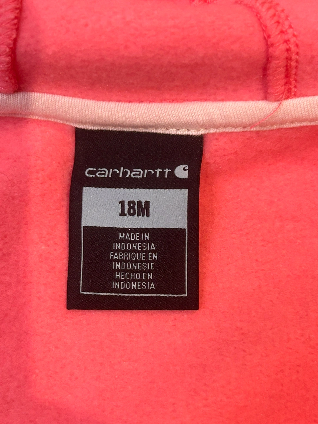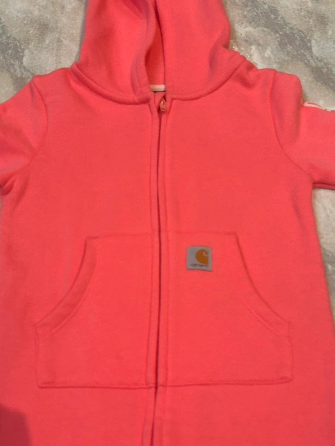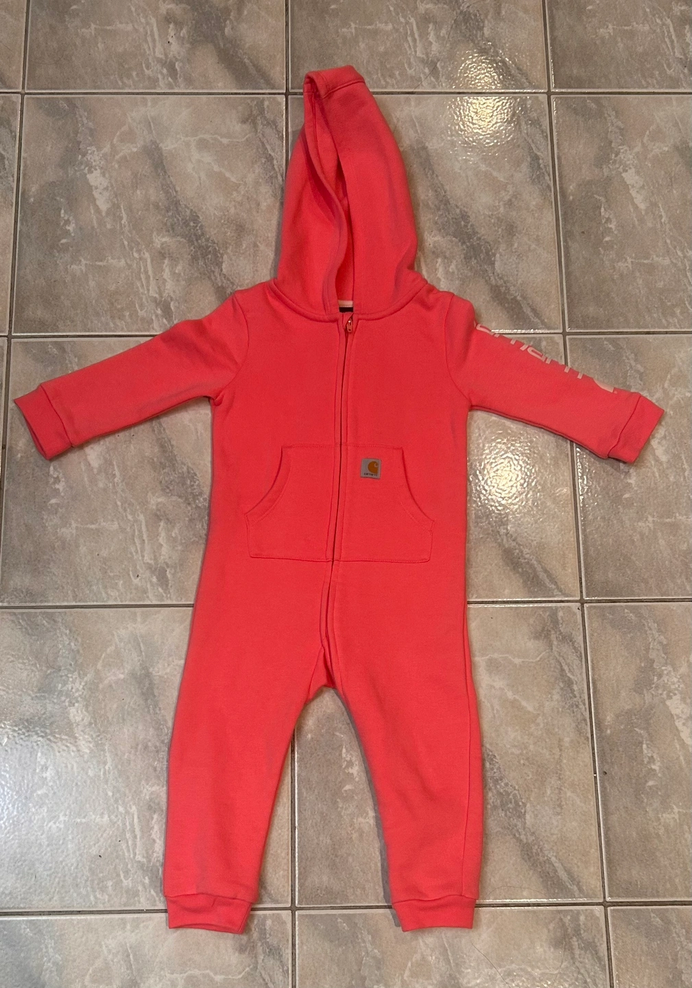 This is a pink Carhartt 18-month zip-up jumpsuit. It features a hood, a front pocket, and a Carhartt logo patch on the front. The jumpsuit is brand new without tags.