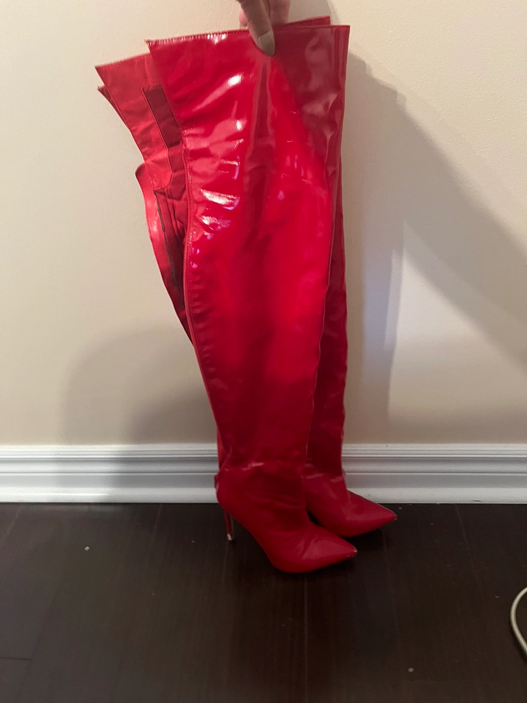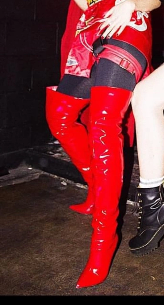 Red vegan thigh high boots with a stiletto heel. Size 6 with Back zipper closure.
