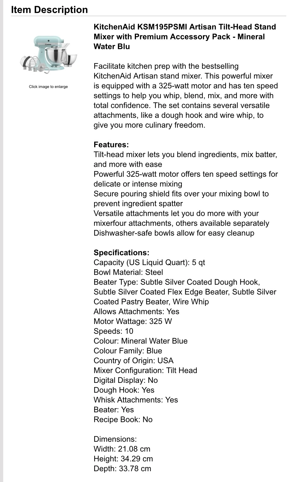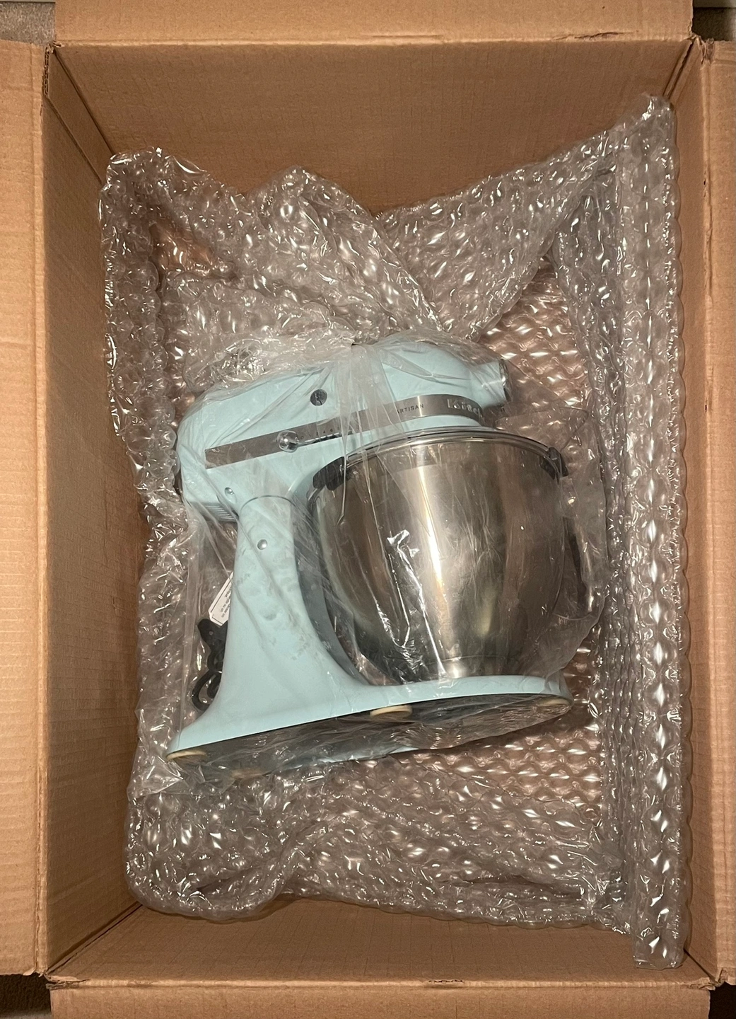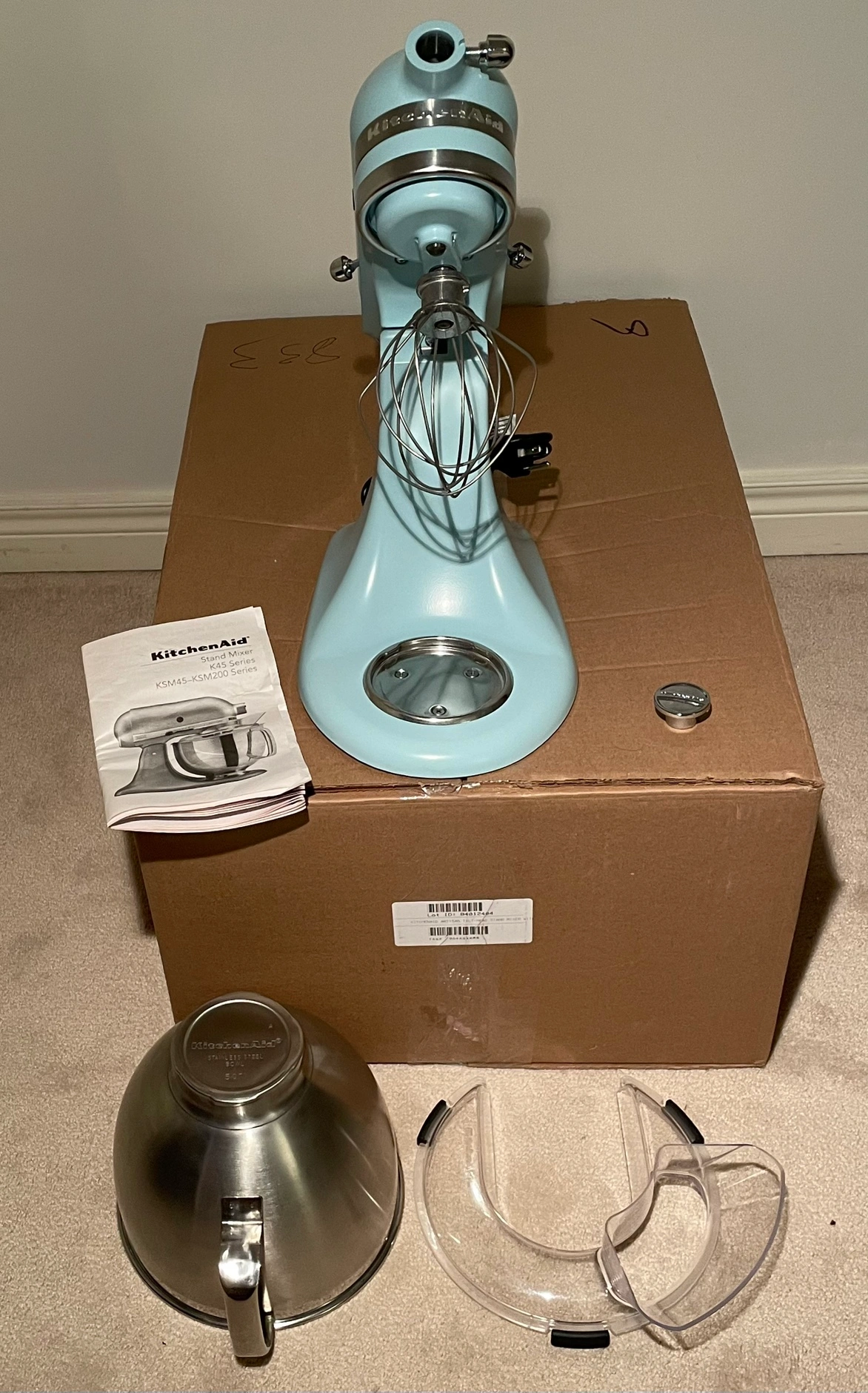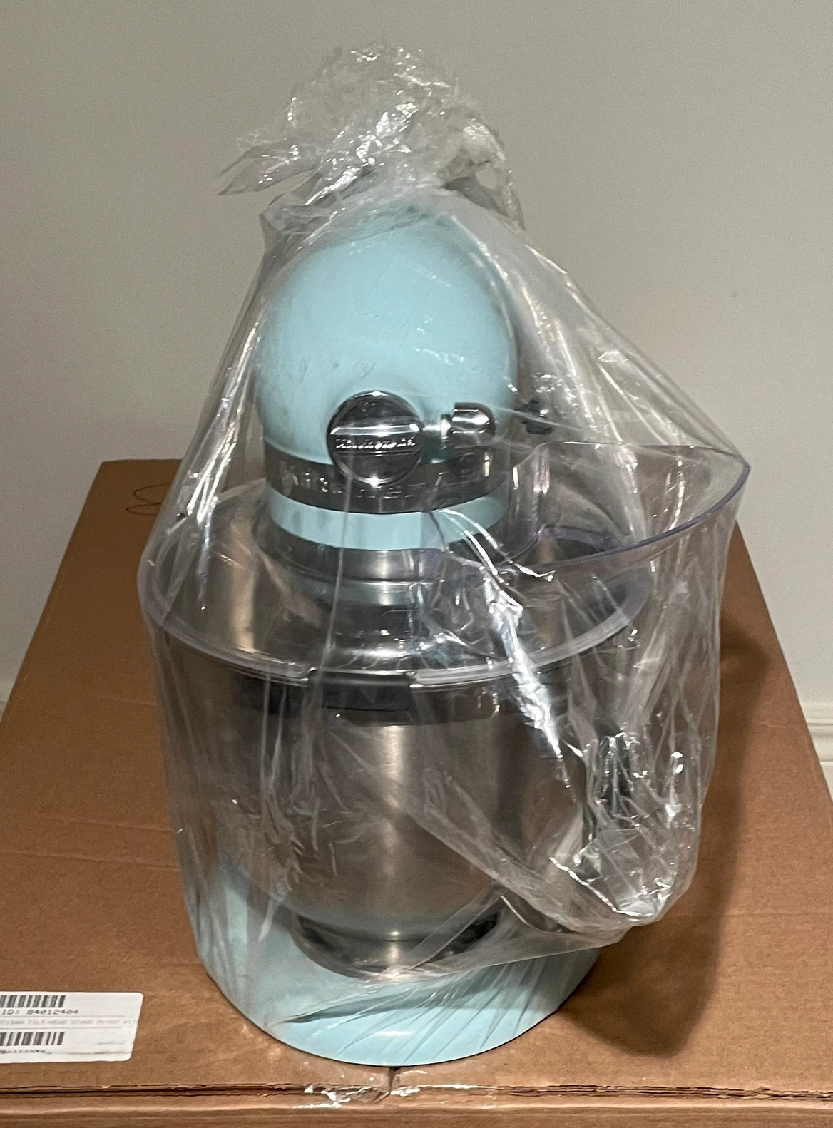 NEW - Store Display! MSRP $544.99 + tax BEST OFFER or FIRST COME! (Offers below $250 will not get a response) Items Included: KitchenAid KSM195PSMI Artisan Tilt-Head Stand Mixer 5Qt - 325-Watt - Mineral Water Blue Manuals Wire Whip Pouring shield 5qt Bowl Items not included: 3.5 Bowl Subtle Silver Coated Dough Hook Subtle Silver Coated Flex Edge Beater Subtle Silver Coated Pastry Beater Unit has been tested and is fully functional. Unit is in excellent condition, minor scuffs. OEM box not included. Pay via Cash, Credit, e-transfer, crypto, Apple Pay, & MORE! **Delivery and Shipping is possible depending on location and small fee. Delivery and shipping fees must be paid in advance by you regardless of purchase** https://www.kitchenaid.ca/en_ca/countertop-appliances/stand-mixers/tilt-head-stand-mixers/p.artisan-series-tilt-head-stand-mixer-with-premium-accessory-pack.ksm195psmi.html Caveat emptor It is the duty of the buyer to inspect, test, and agree to our products prior to completing transaction. You accept full responsibility of the product the second money exchanges hands even if you choose to not test and inspect. If the unit is factory sealed and you decide to break the seal to inspect and test, you agree to complete the sale as long as the product inside is in adequate condition.