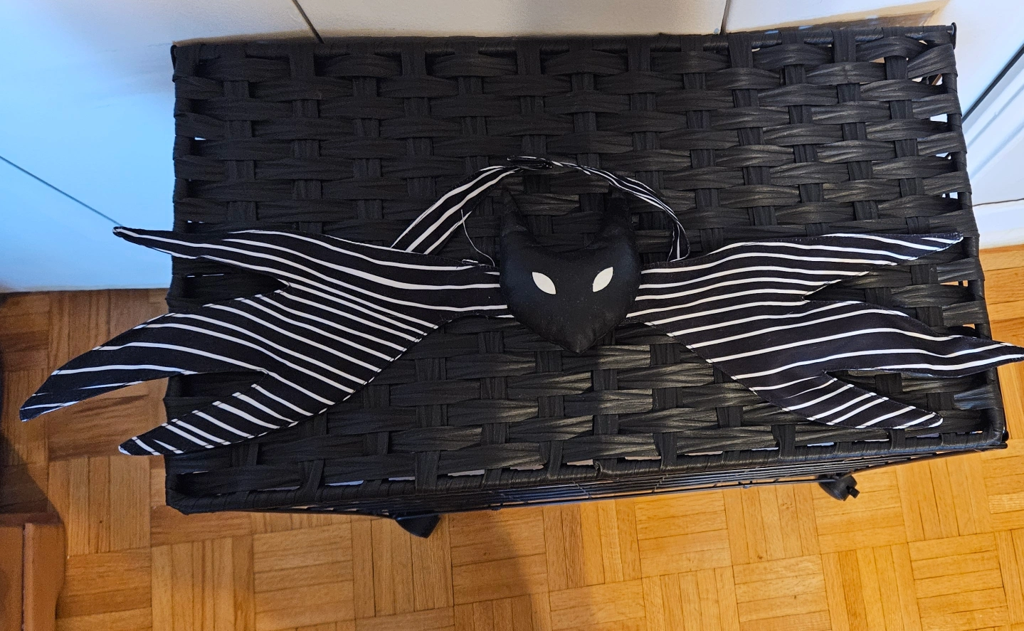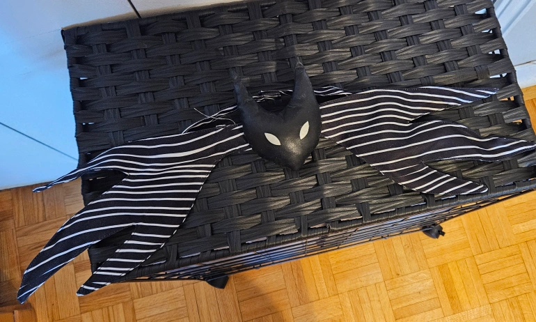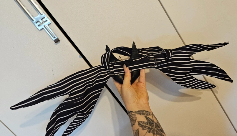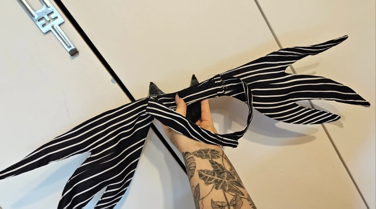 This is the iconic neck piece of Jack Skellington from The Nightmare Before Christmas. They are made of black and white striped fabric. They are perfect for any Halloween costume or cosplay. there are bendable arms inside of the long pieces to shape any way you want it. The neck piece is velcro and can come out. I bought off Etsy 2 years ago for $30 only has been used 2 times. This piece sells on Amazon for $40 after fees and shipping pick up only* (no meet ups/drop offs)