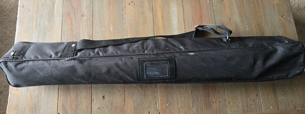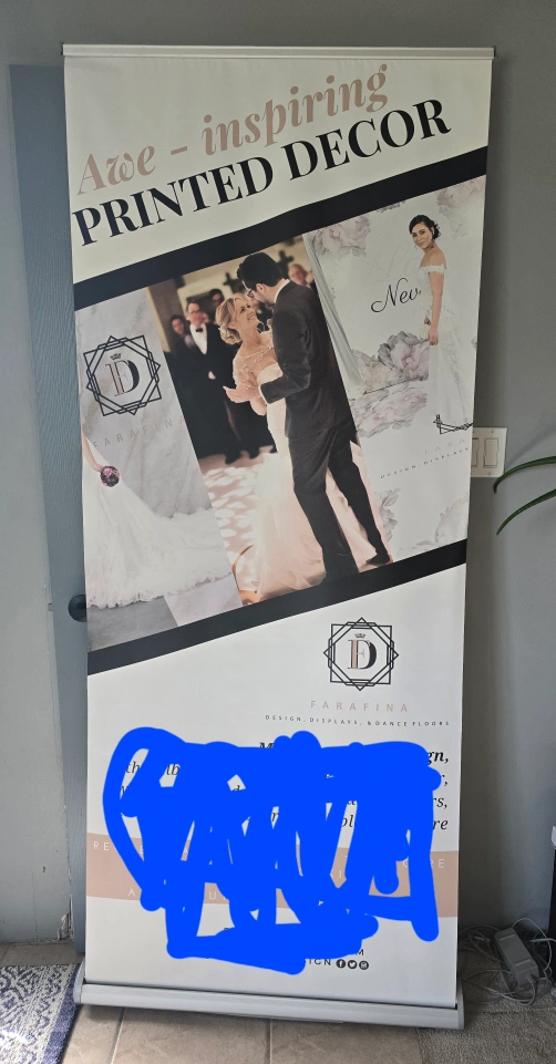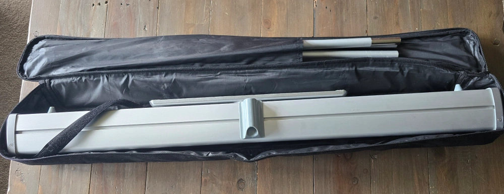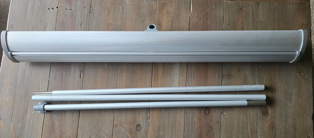This is a retractable banner stand with a carrying case. It features a silver frame and comes with poles for assembly. 33 x 82 inches.