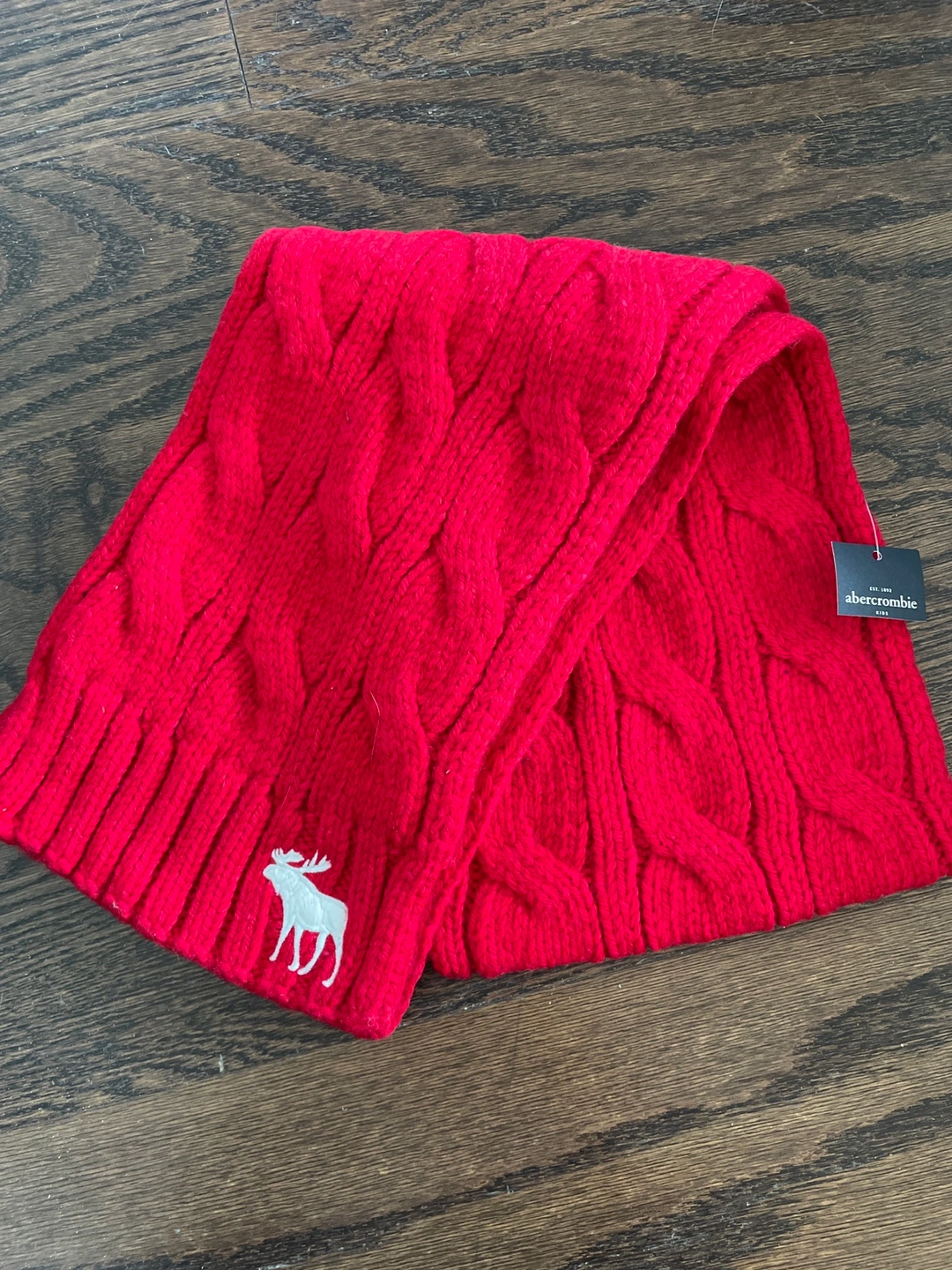 Brand new with tag on. Red knit scarf with white moose logo.