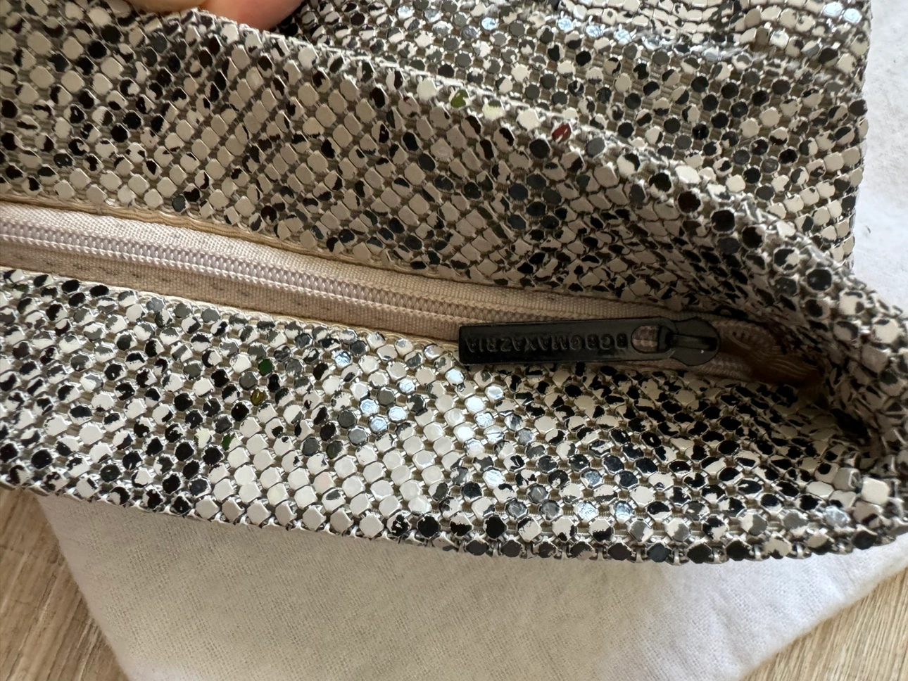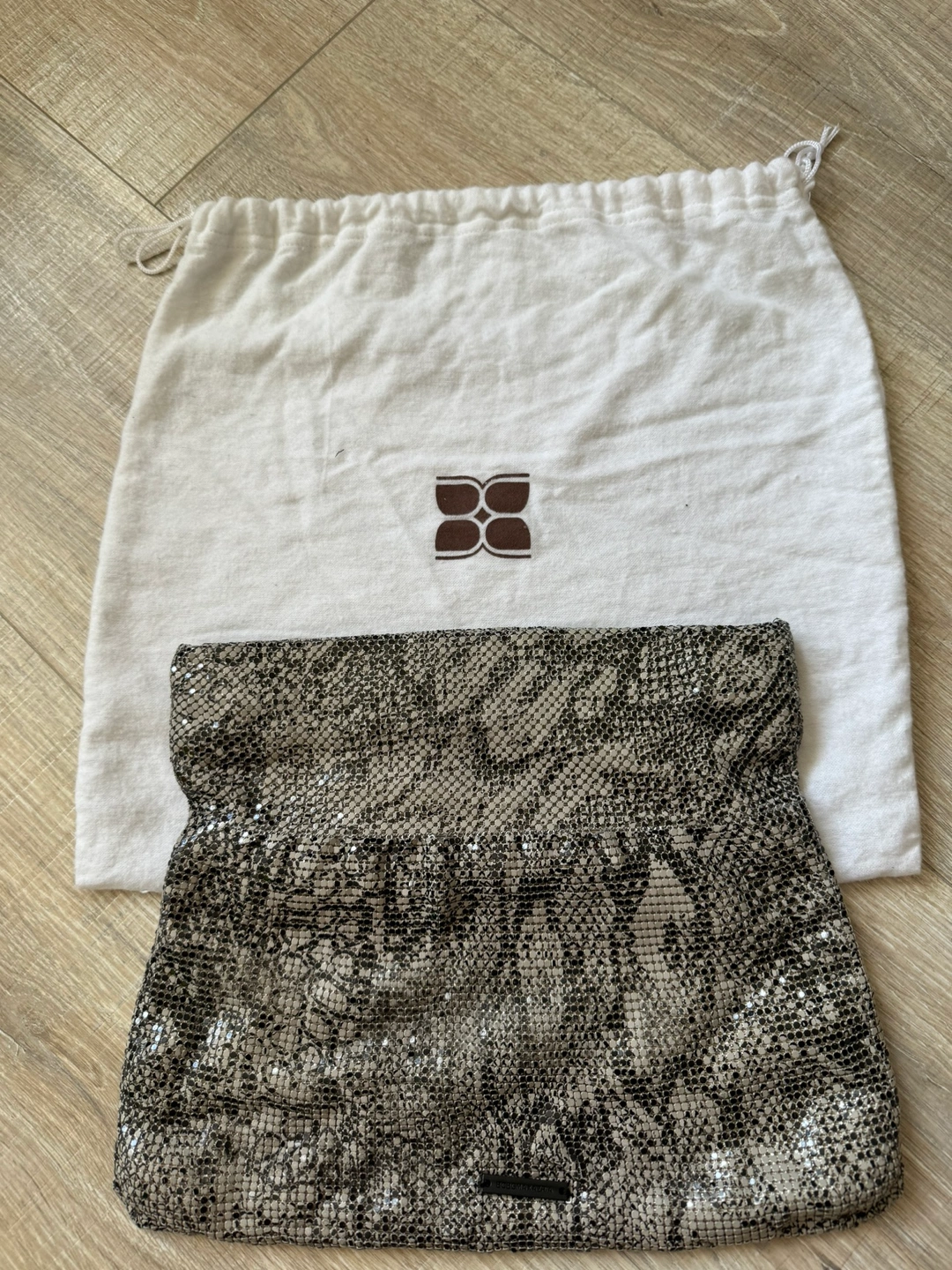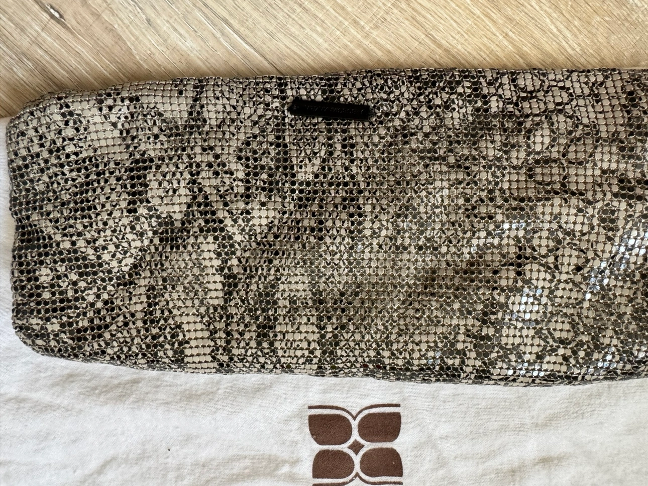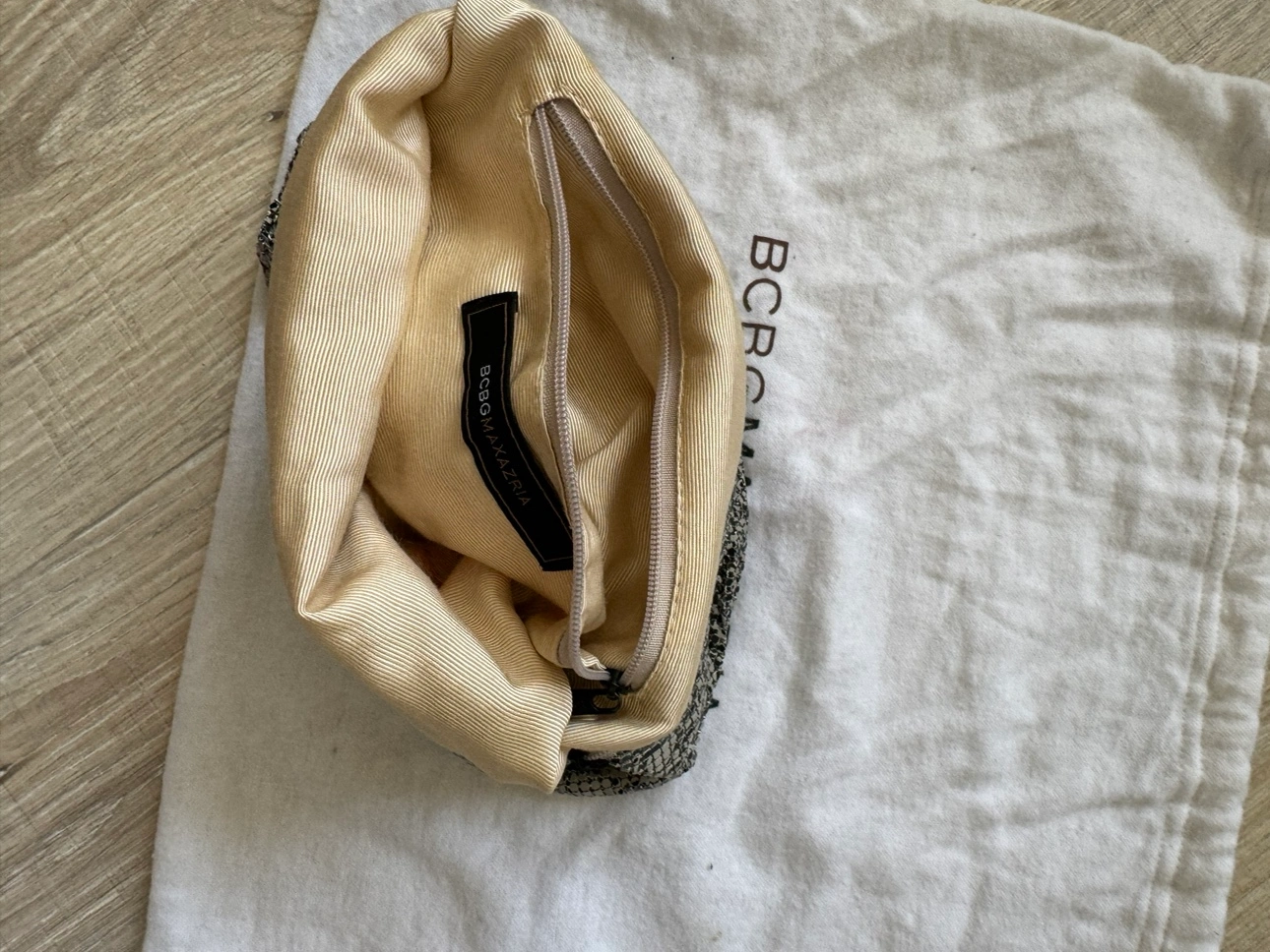 This is an imitation snake skin BCBG Max Azria clutch. The clutch has a zipper closure. Comes with a dust bag.