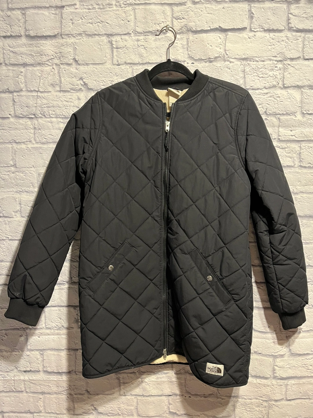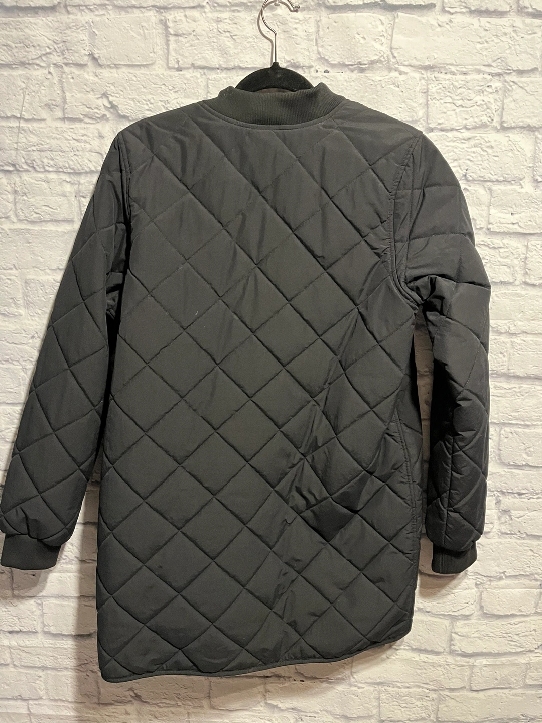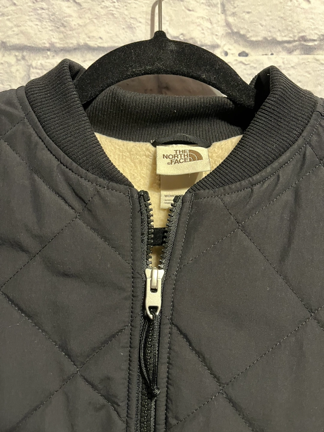 Black quilted bomber jacket with a warm fleece lining. It features a zipper closure and two front pockets, water resistant. The jacket is in very good condition, only worn a few times - outside like new, Sherpa lining has some slight wear. Retail was $250. Pick up only.
