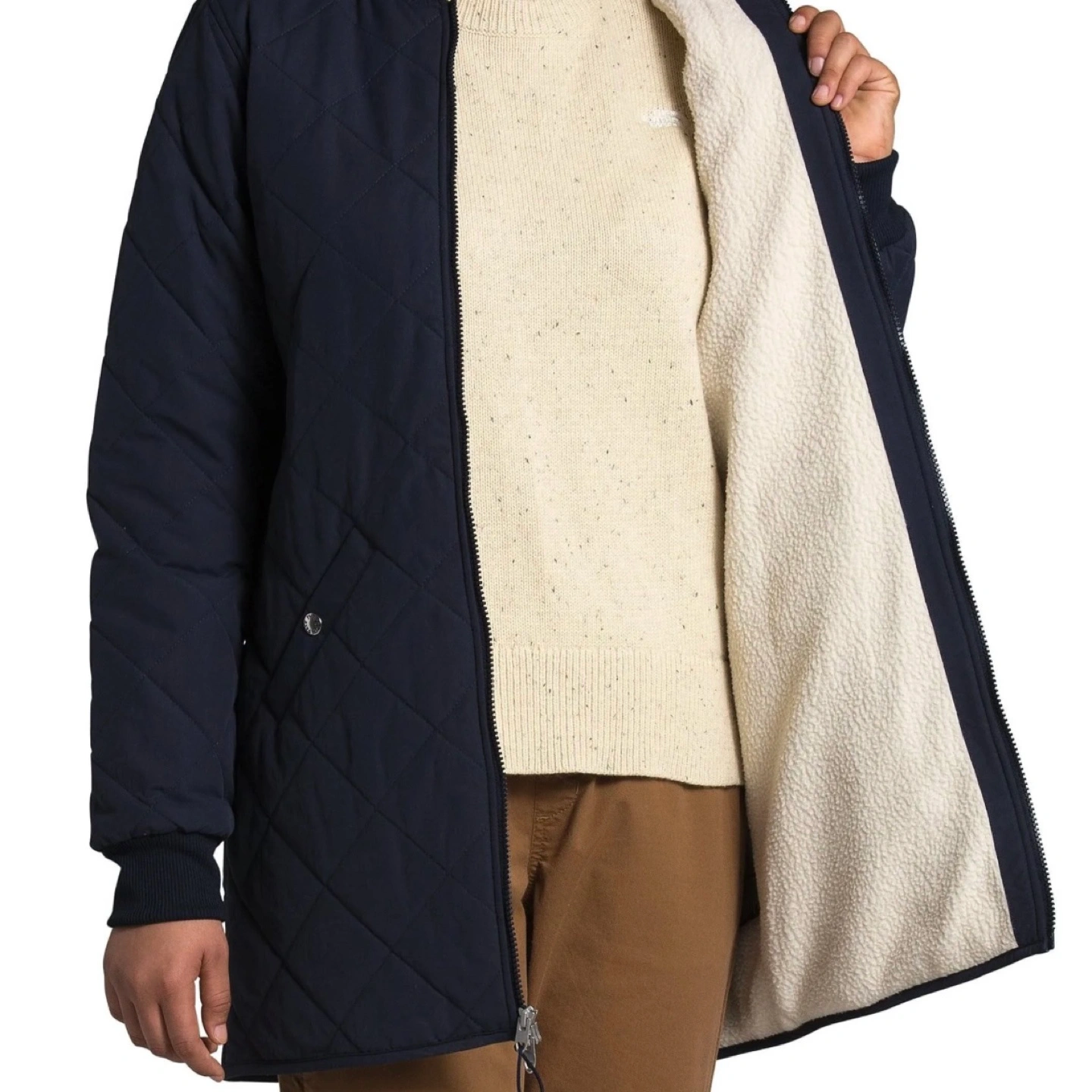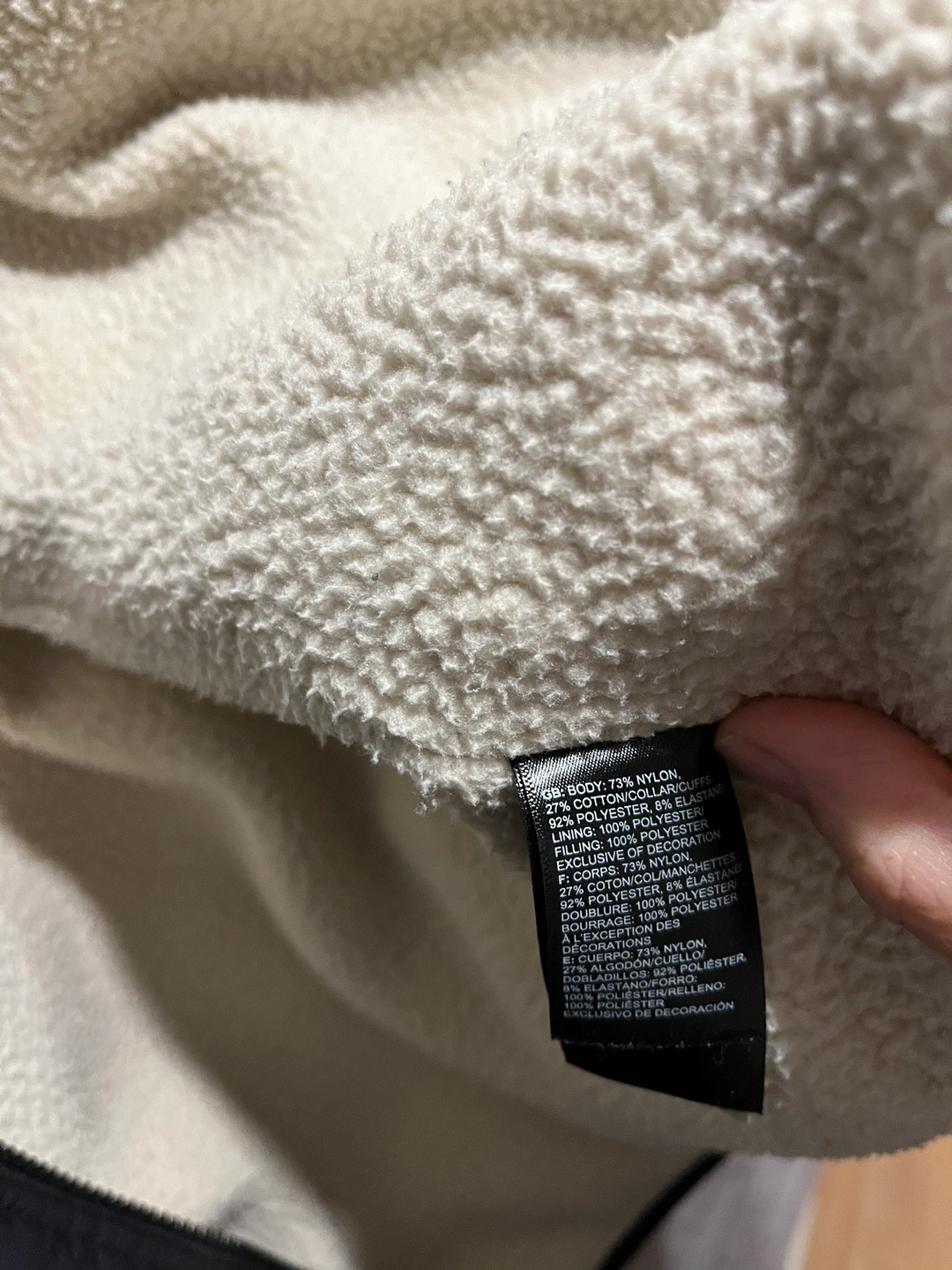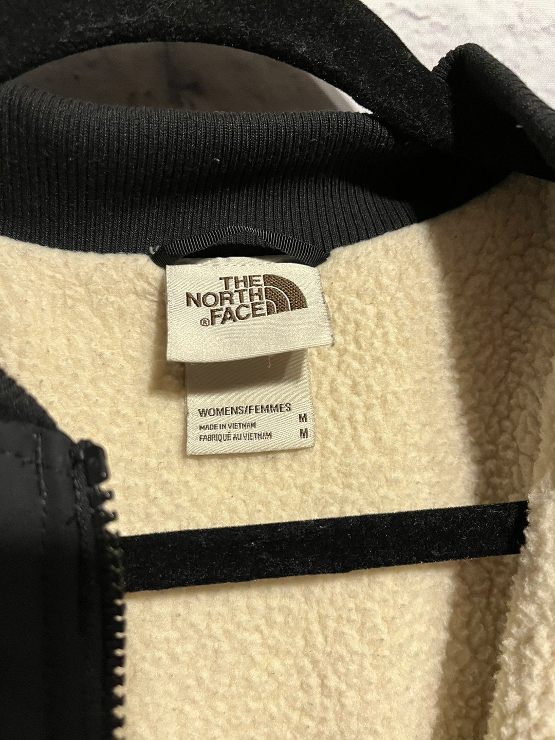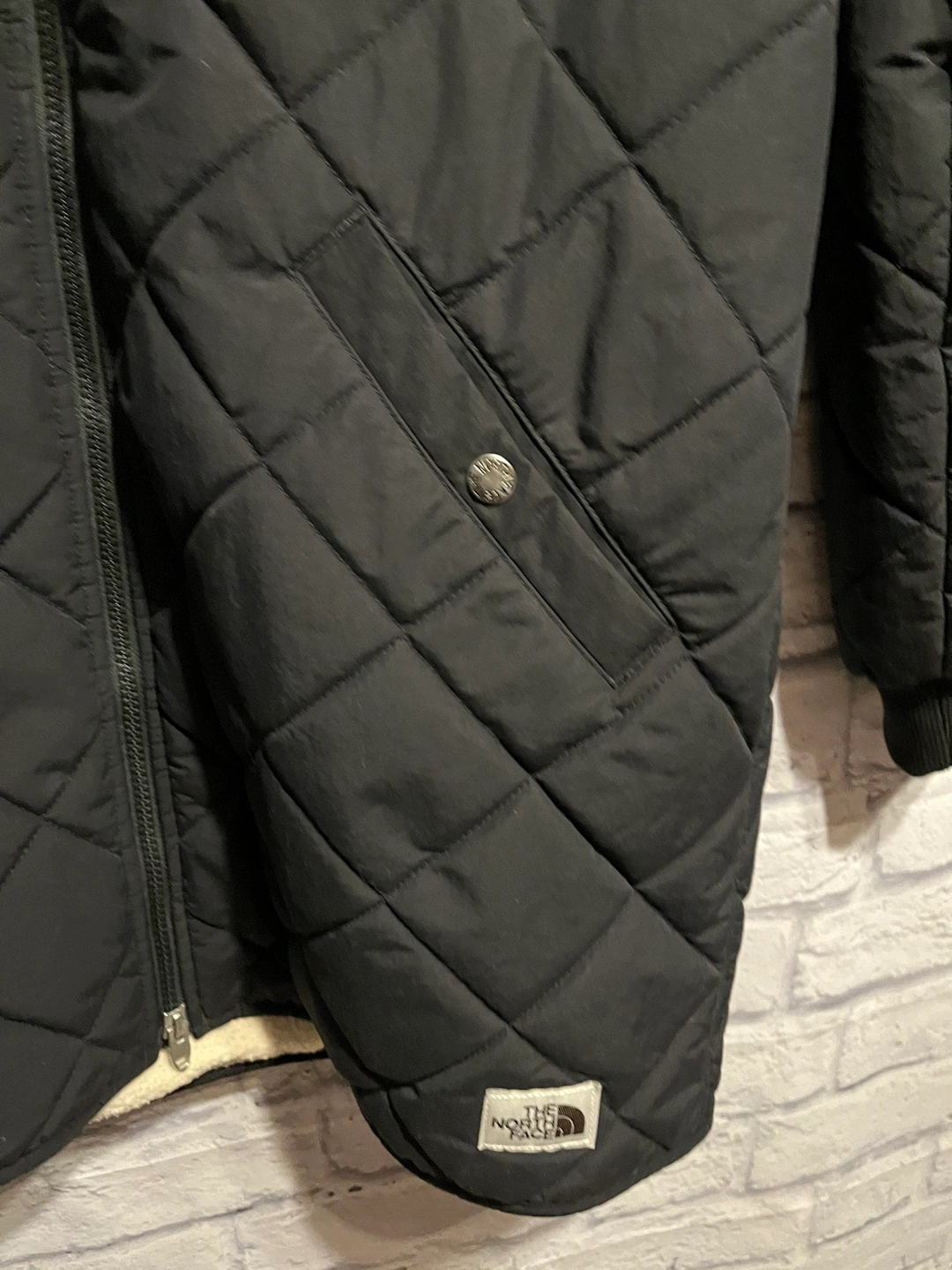 Black quilted bomber jacket with a warm fleece lining. It features a zipper closure and two front pockets, water resistant. The jacket is in very good condition, only worn a few times - outside like new, Sherpa lining has some slight wear. Retail was $250. Pick up only.