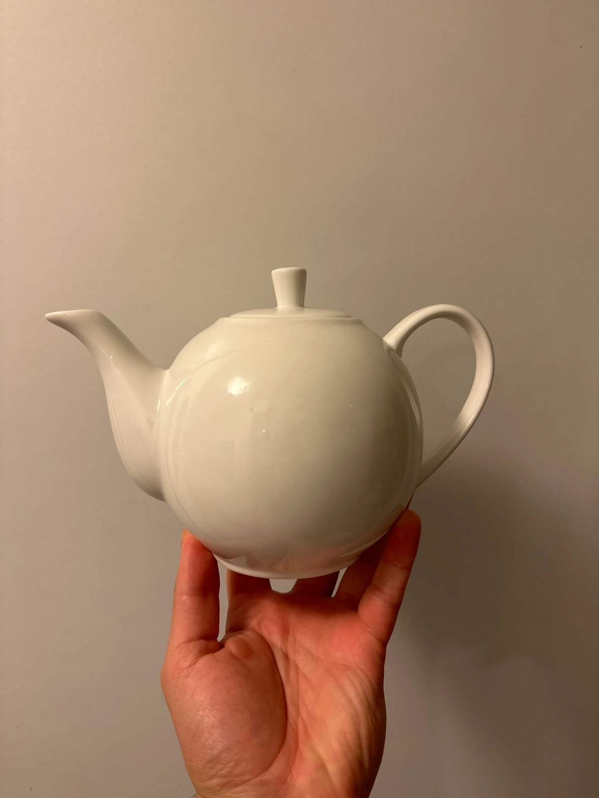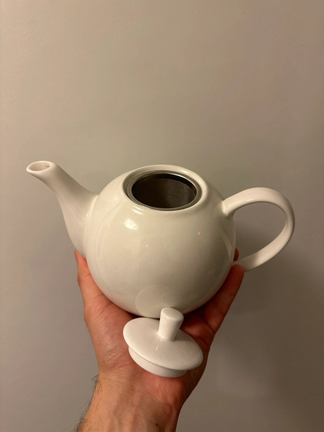 A white teapot with a built-in infuser for loose leaf tea. It comes with a lid and a separate removable infuser basket. #freecycle
