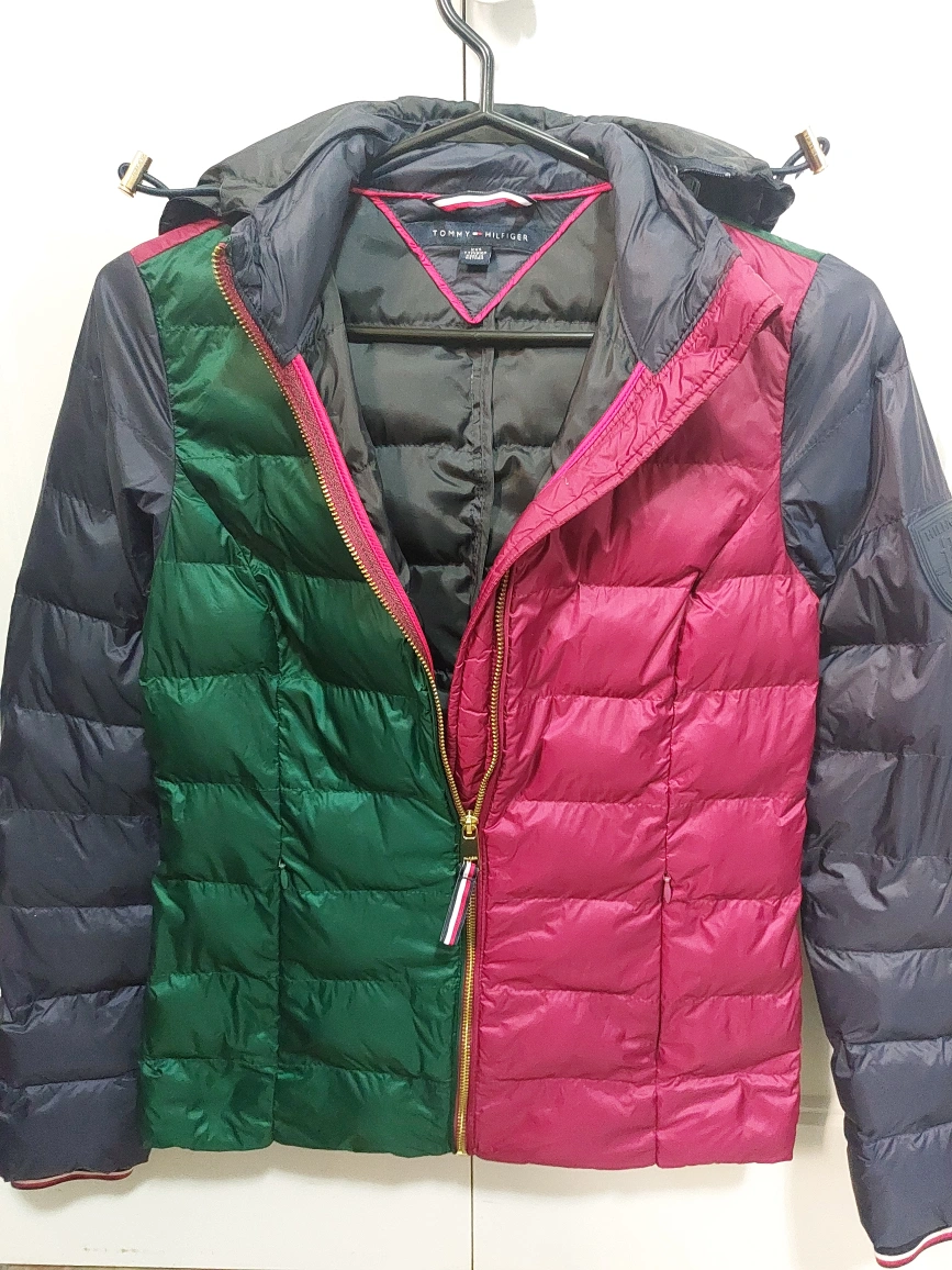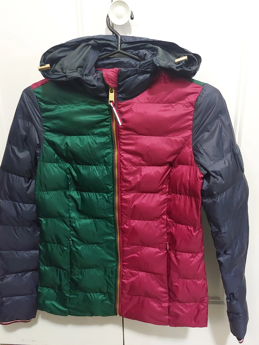 Women’s puffer jacket with a hood, barely used. The jacket is a multicoloured design with a navy blue, green, and red colour scheme. It has a zipper closure. I am selling because it doesn't fit. Amazing quality 👌.