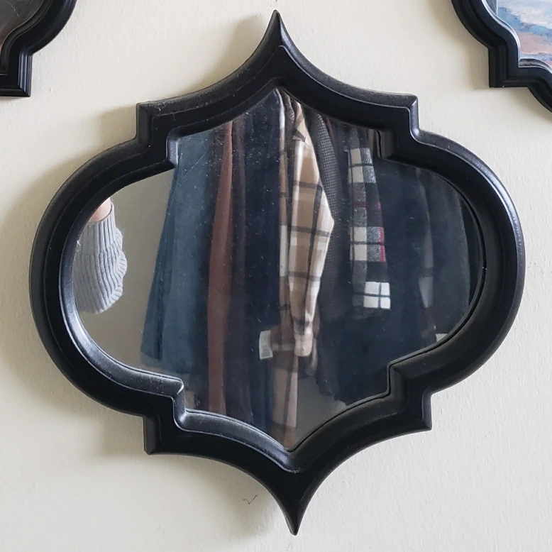 A black ornate mirror with a beveled glass surface. Shrink wrapped for easy transport.
