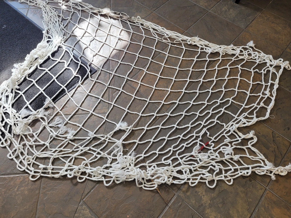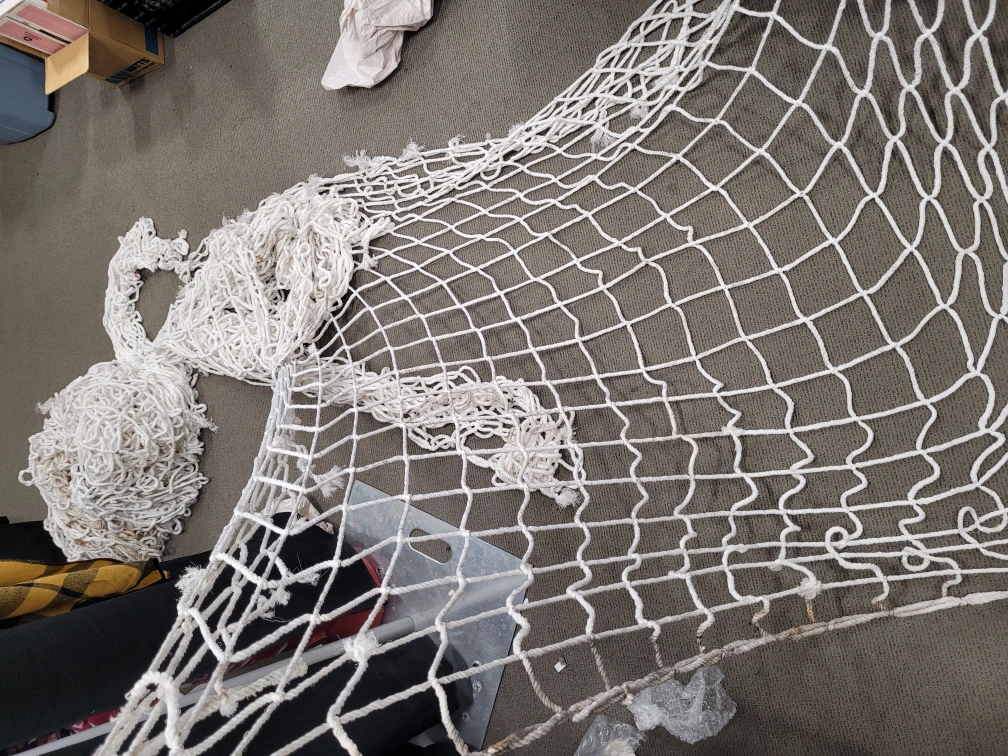 White cargo net, i have a couple as is. It is made of thick rope. It is in used condition, the rope is frayed in a couole spots from being cut into 2... i think It could be used for storage or decoration. It is a great size for a variety of uses.Must pickup. Please. no etransfer or long holds. this is a cash price. bring cash. $10 a piece This is in storage and I will meet you there. I can access the building during 8 to 430 Monday to Friday. No one is there outside of those times.