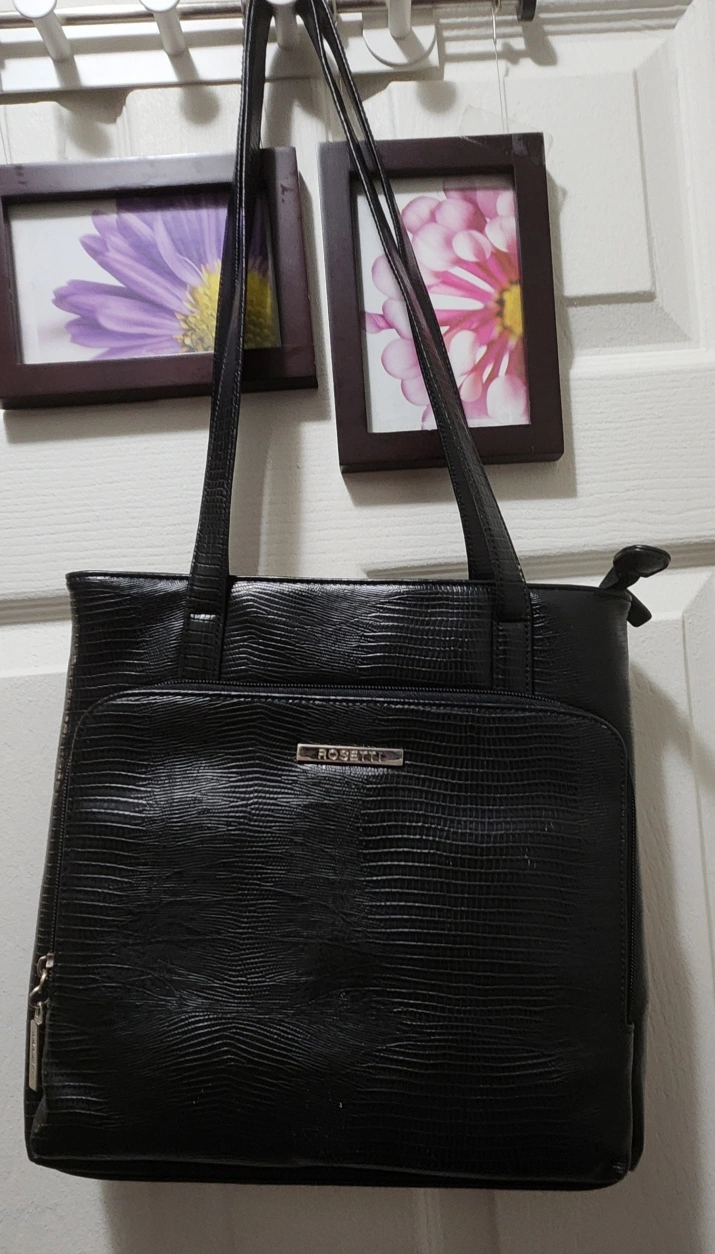 Large black leather tote bag with a zipper closure and a front pocket. It has a small silver nameplate on the front of the bag.