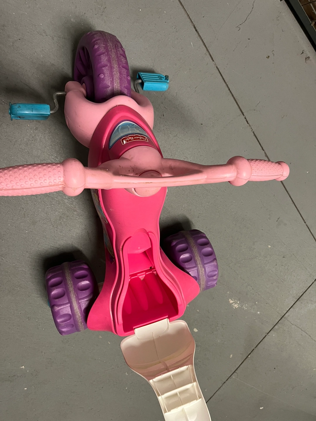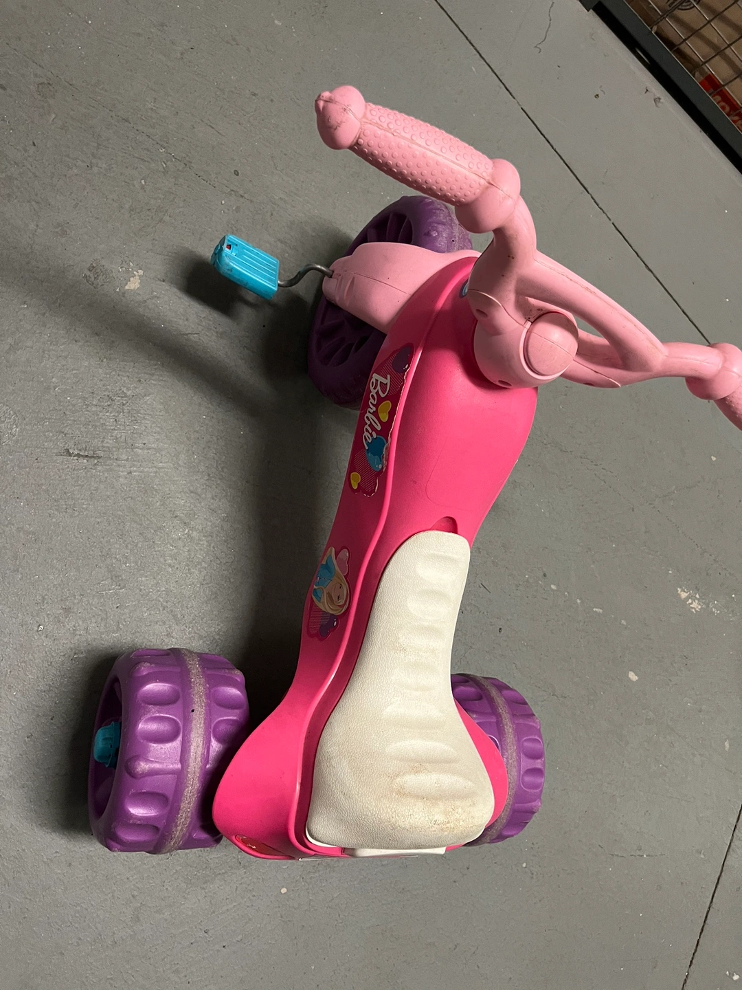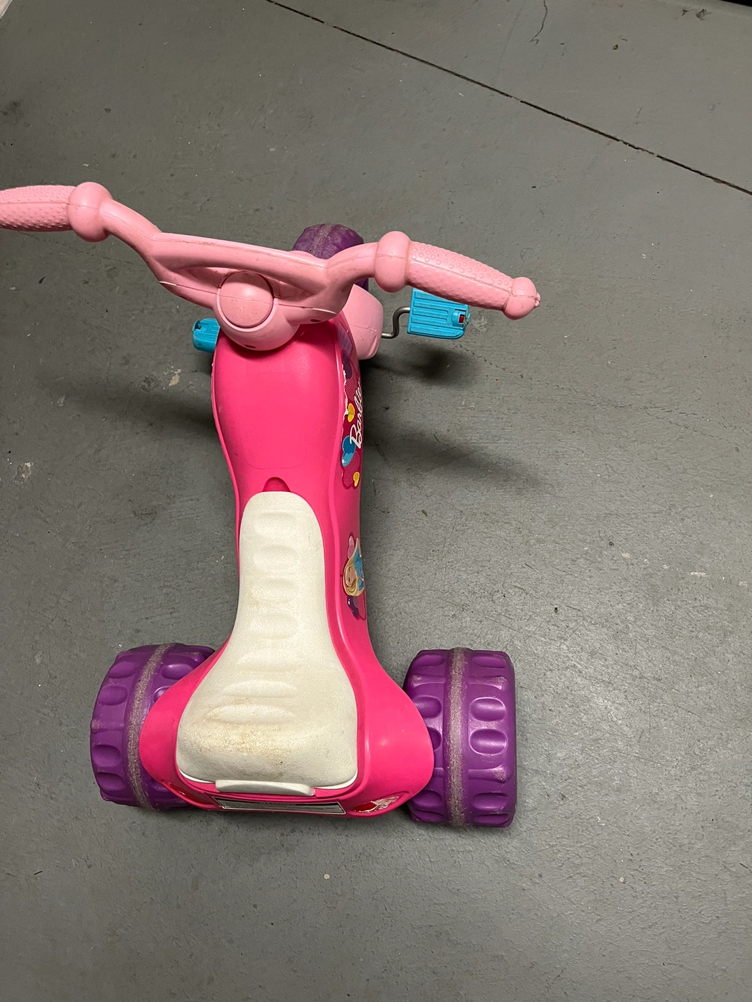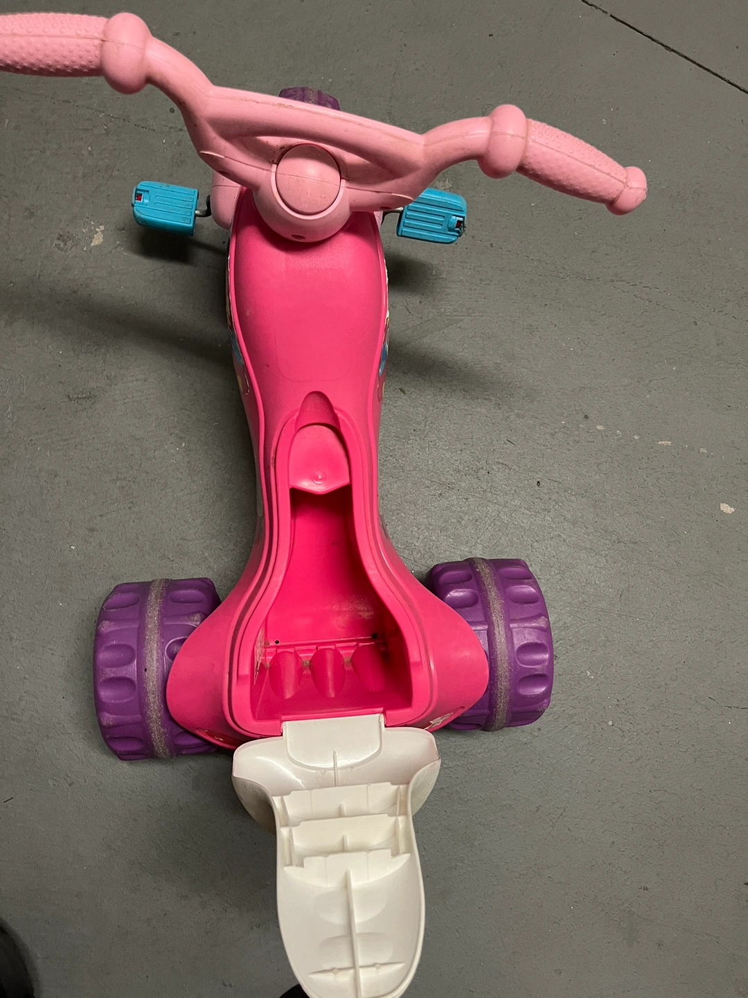 Pink tricycle with purple wheels. The seat has a storage compartment in the back.