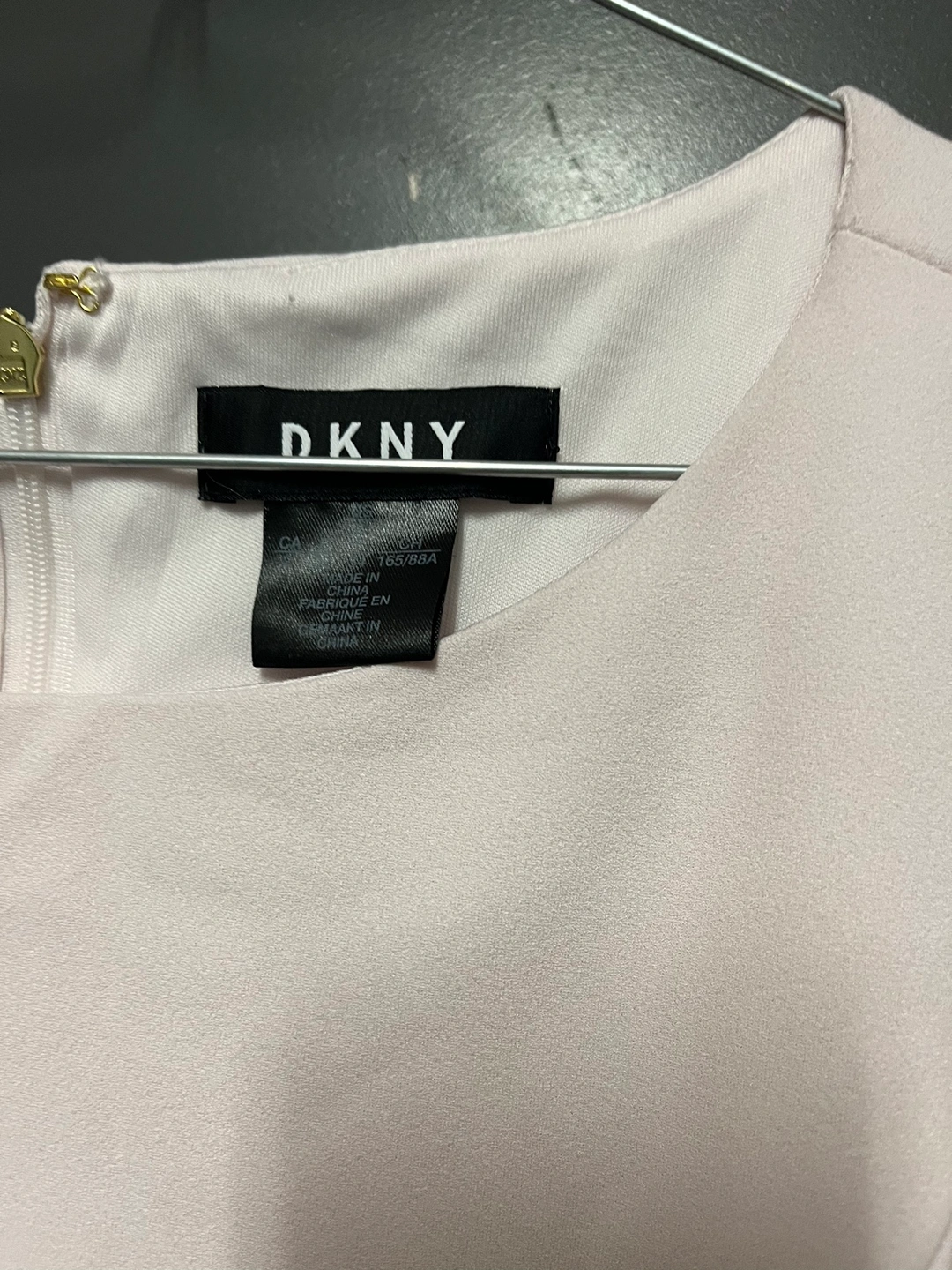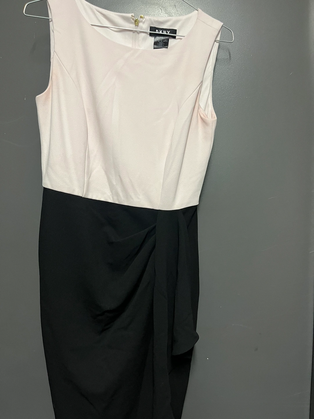 Black and white sleeveless dress with a fitted top and a flowy skirt. The dress is knee-length and has a gold zipper in the back. It has a subtle ruffle detail on the skirt. The dress is size 10.