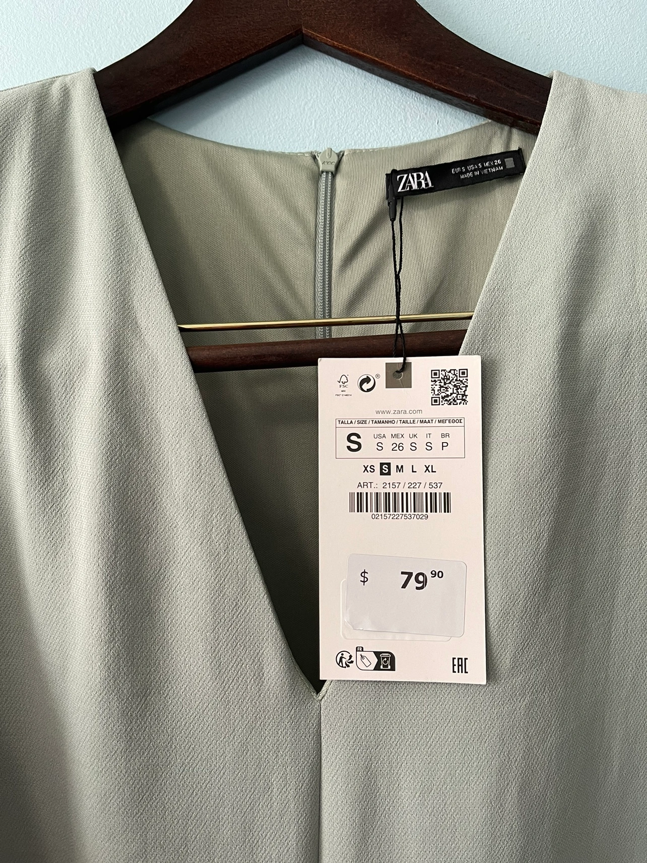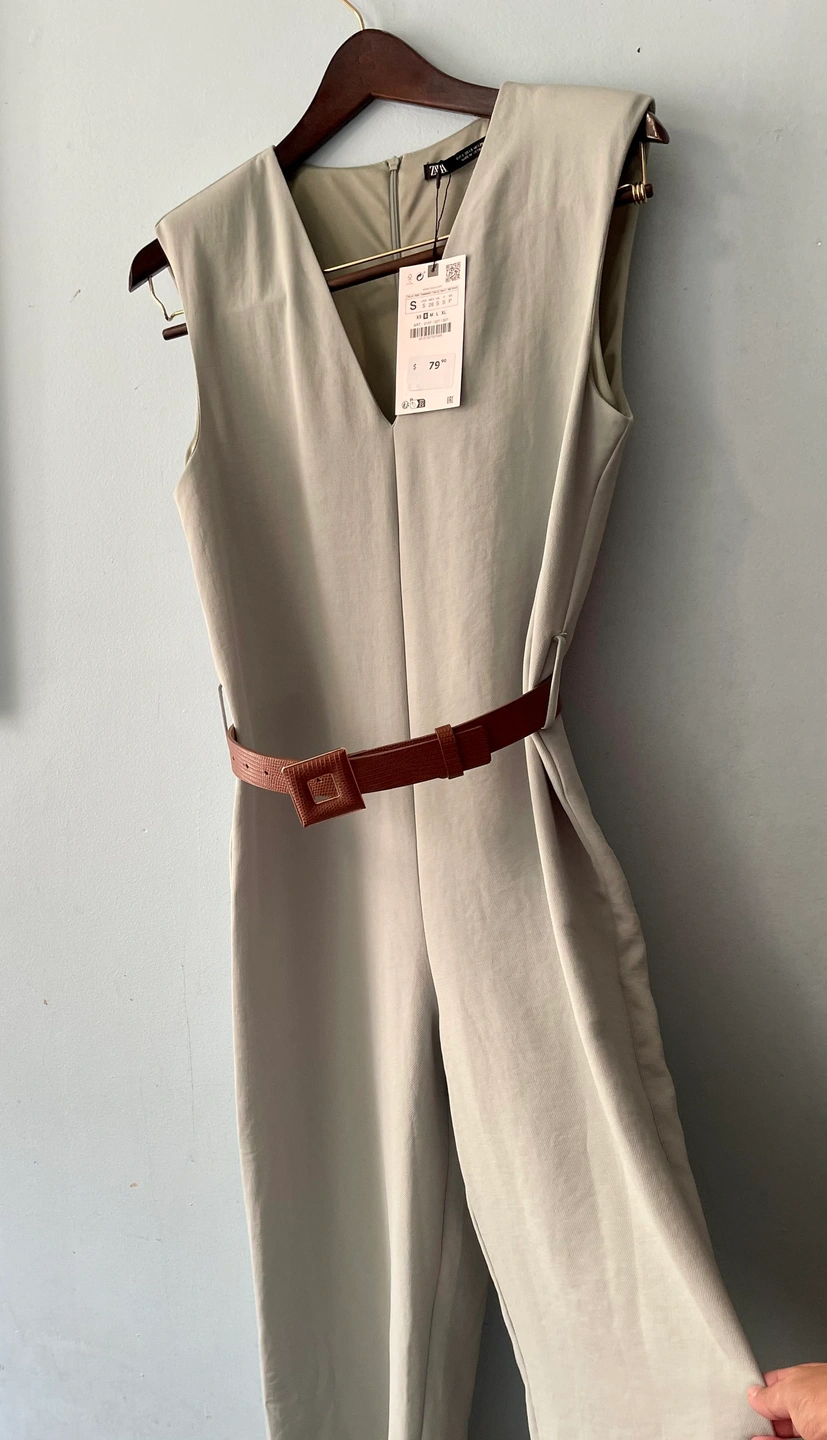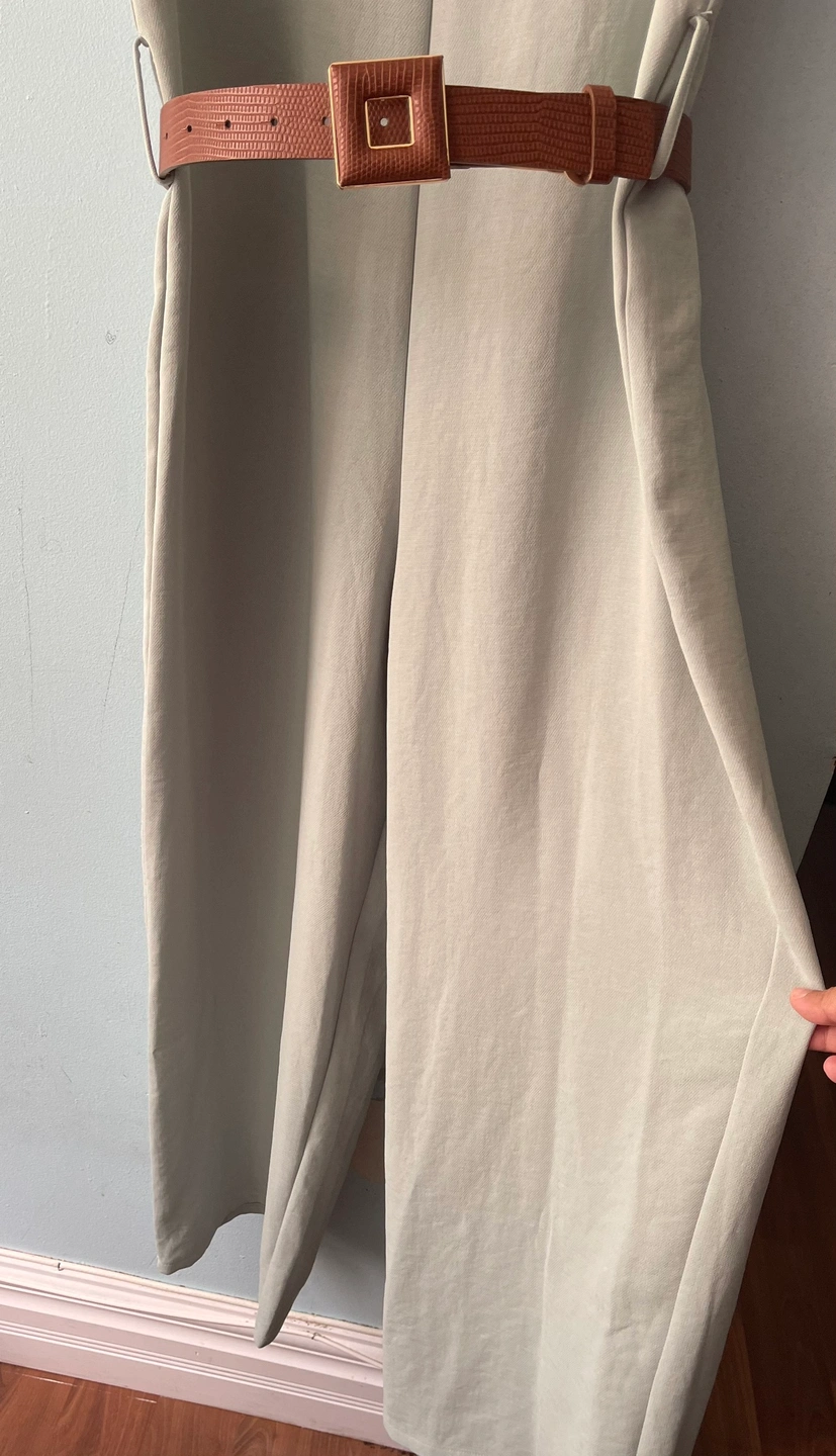 A light green sleeveless jumpsuit with a V-neckline and a brown belt. Brand new with tag. I could not return it because it is already late.