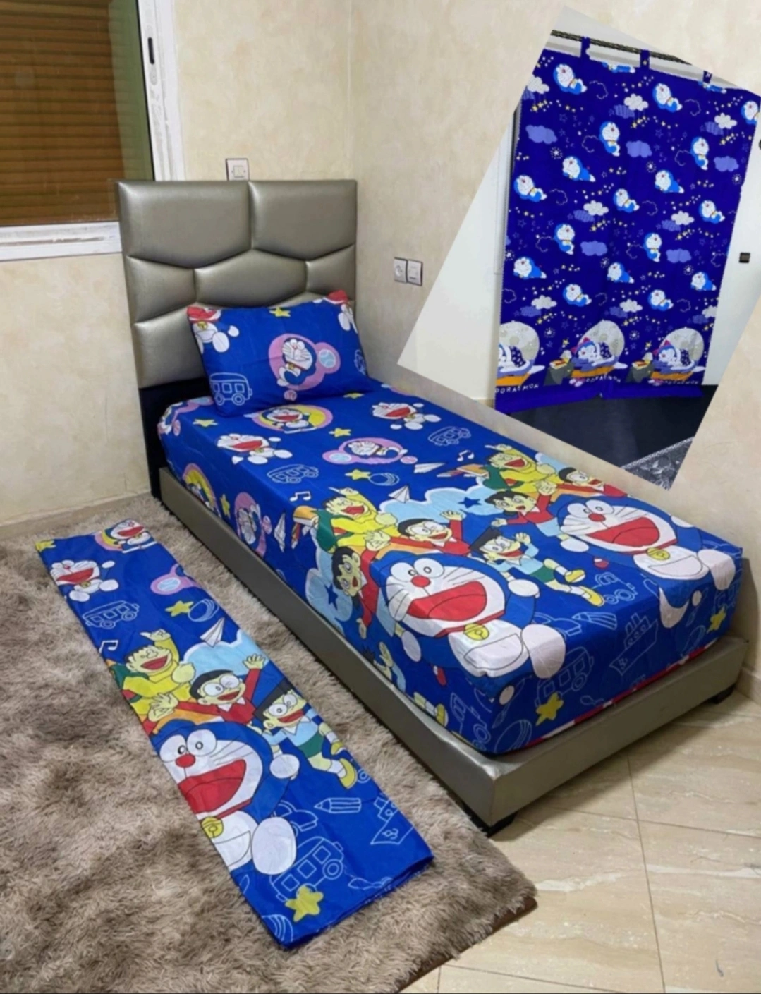 A twin-sized bed set with a fitted sheet, flat sheet, pillowcase, and curtain. The set features a blue and white design with Doraemon characters.