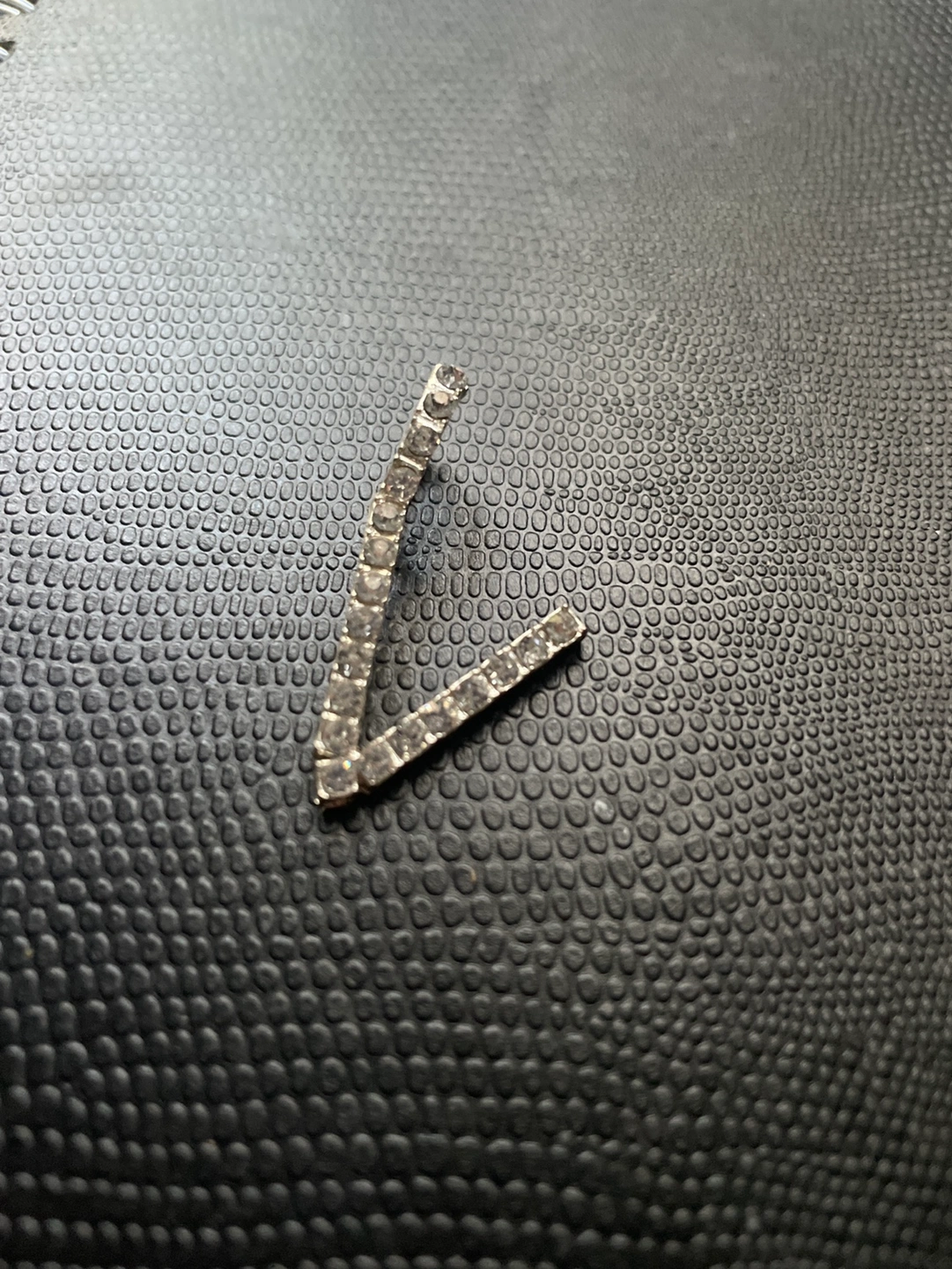 A silver charm in the shape of the letter V. It is accented with clear rhinestones. The charm has a loop at the top for attaching to a necklace or bracelet.