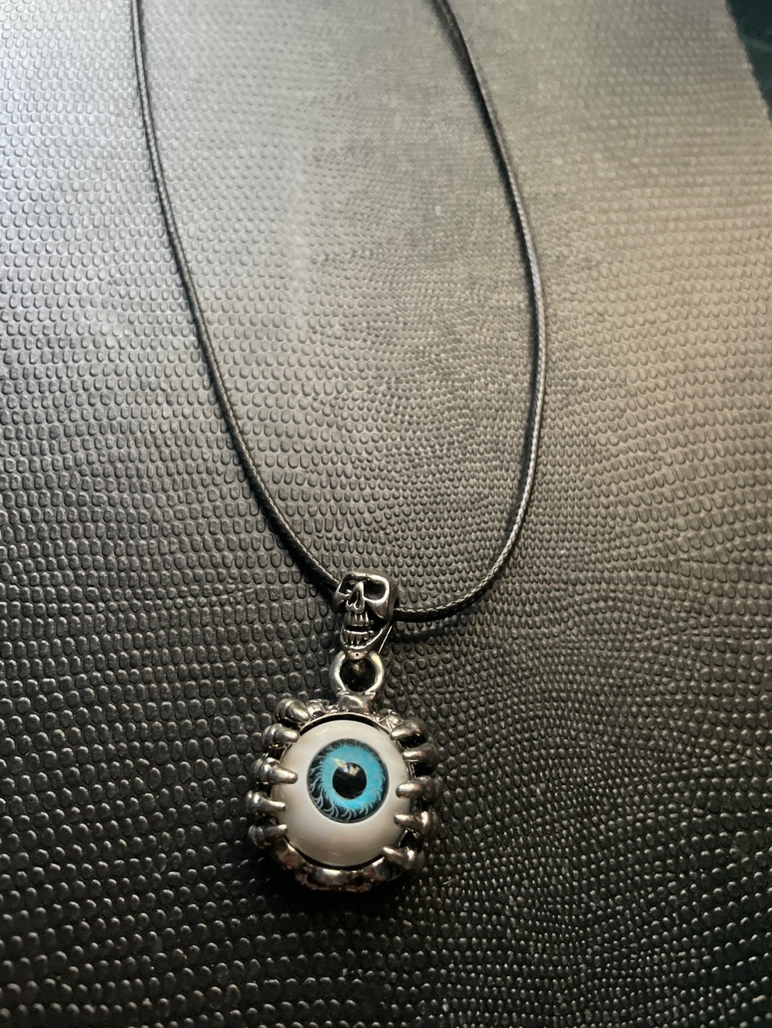 A silver eye pendant on a black cord. The eye is surrounded by metal claws. The pendant hangs on a thin black cord. The cord does not appear to be adjustable. It is approximately 18 inches in length. There is a small silver skull charm on the end of the cord.