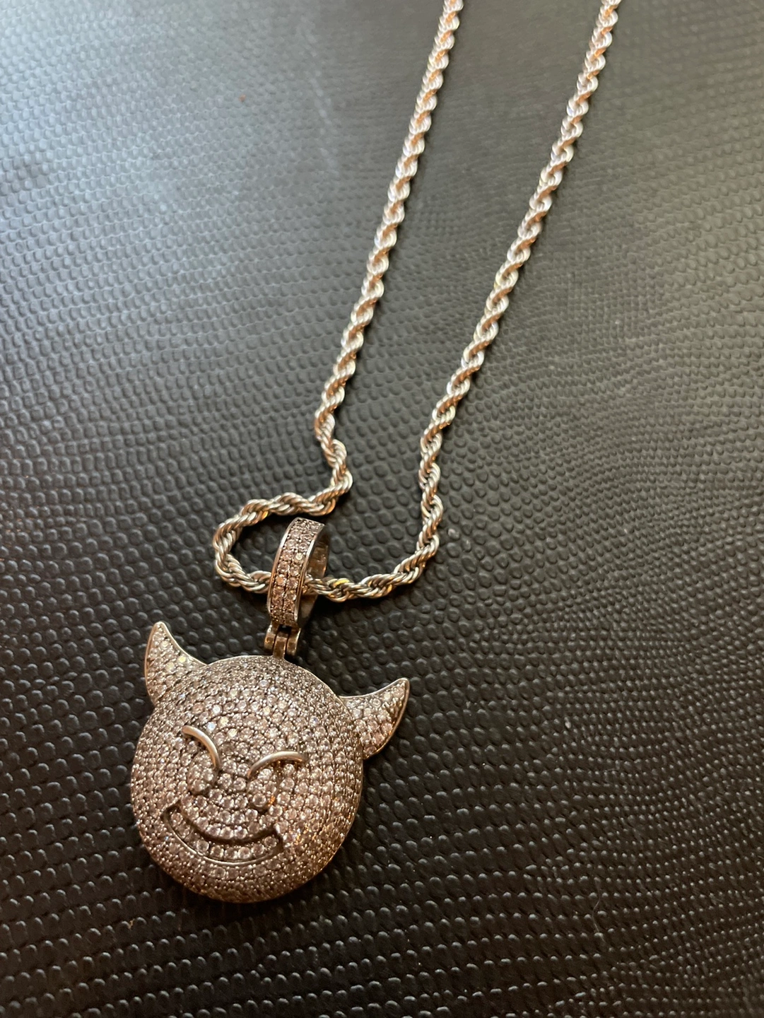 A silver chain necklace with a devil emoji pendant covered in rhinestones.