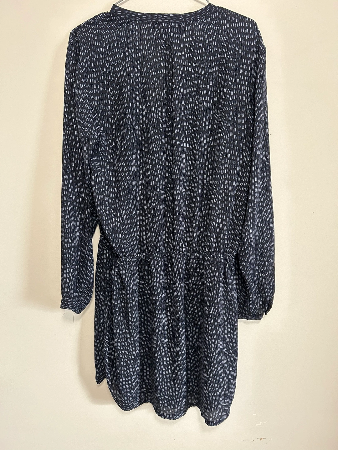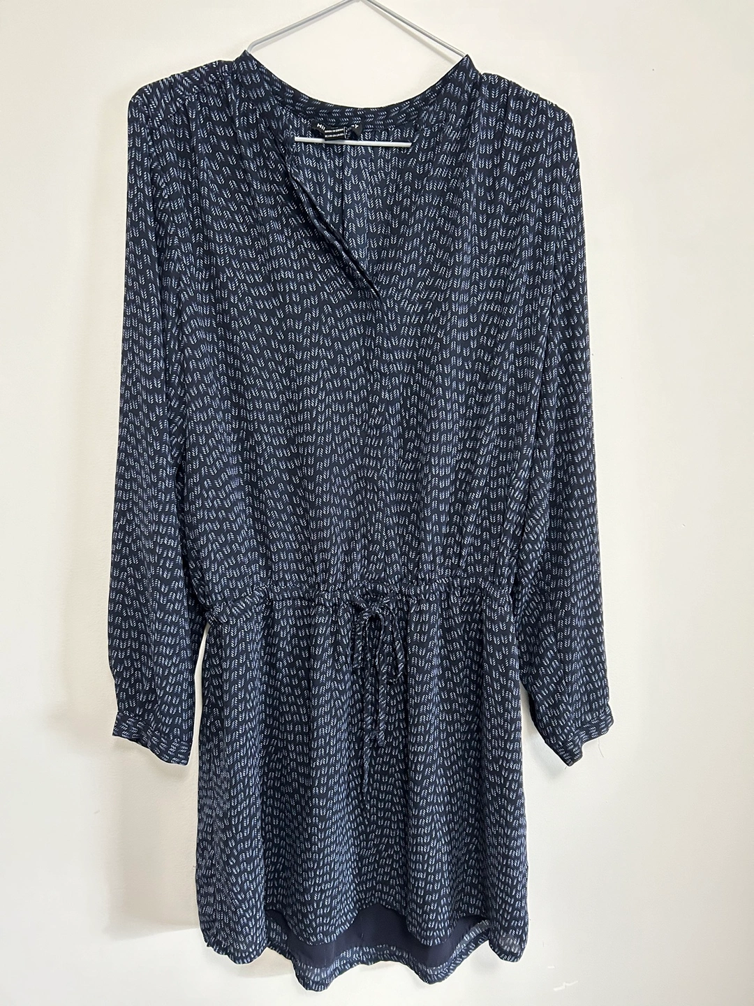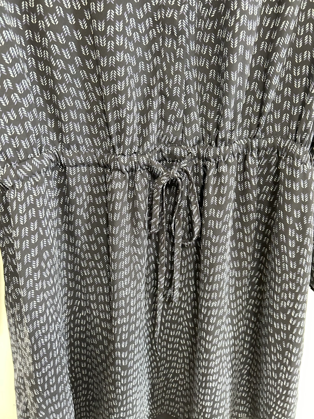 Long sleeved dress with a tie at the waist. The dress is a size Medium. It has a black and white floral print. The dress is made of 100% polyester and has a black lining.