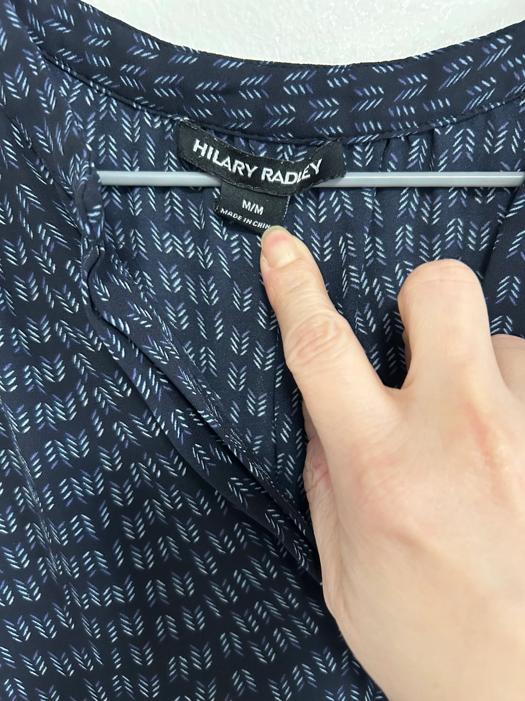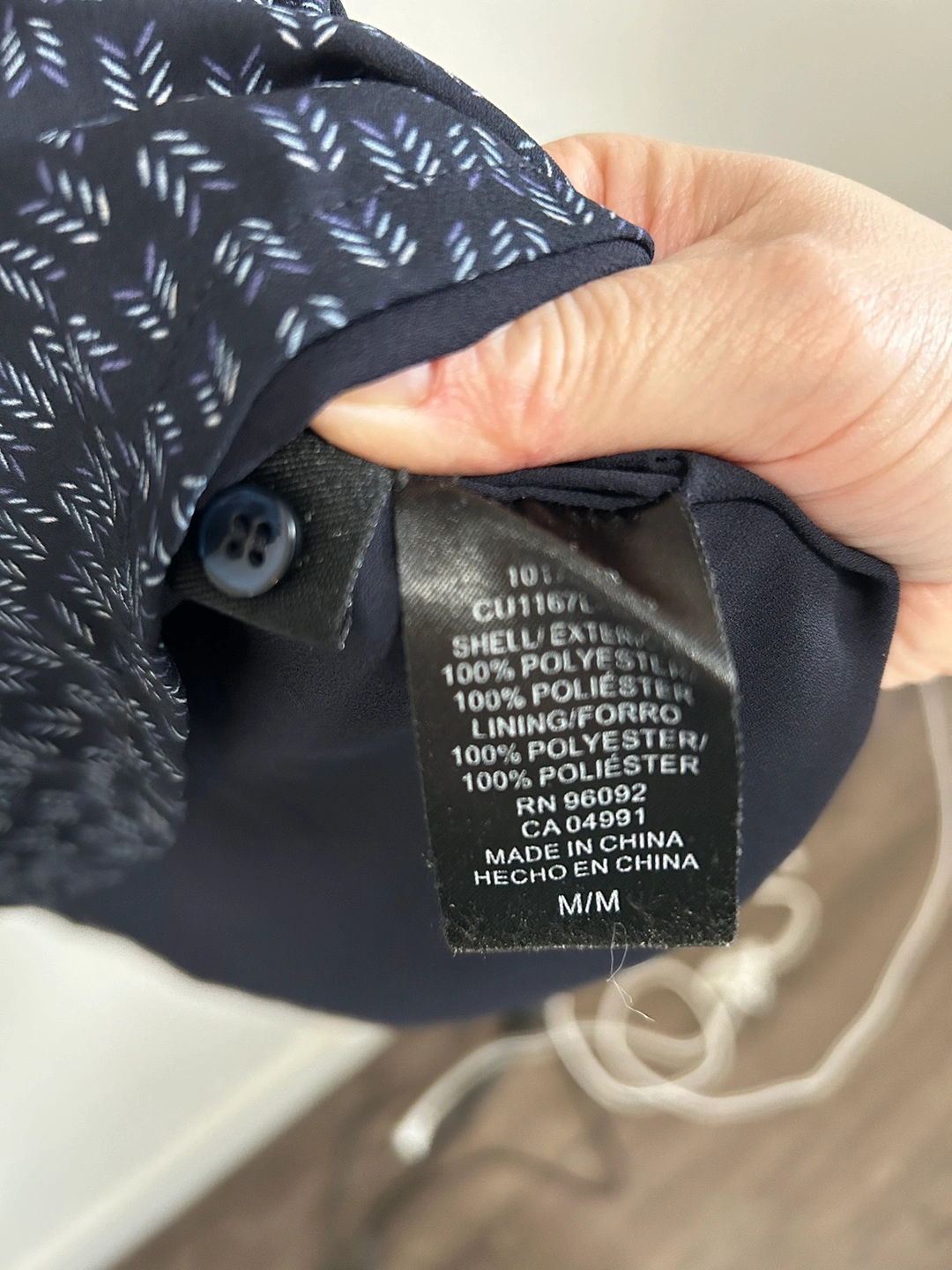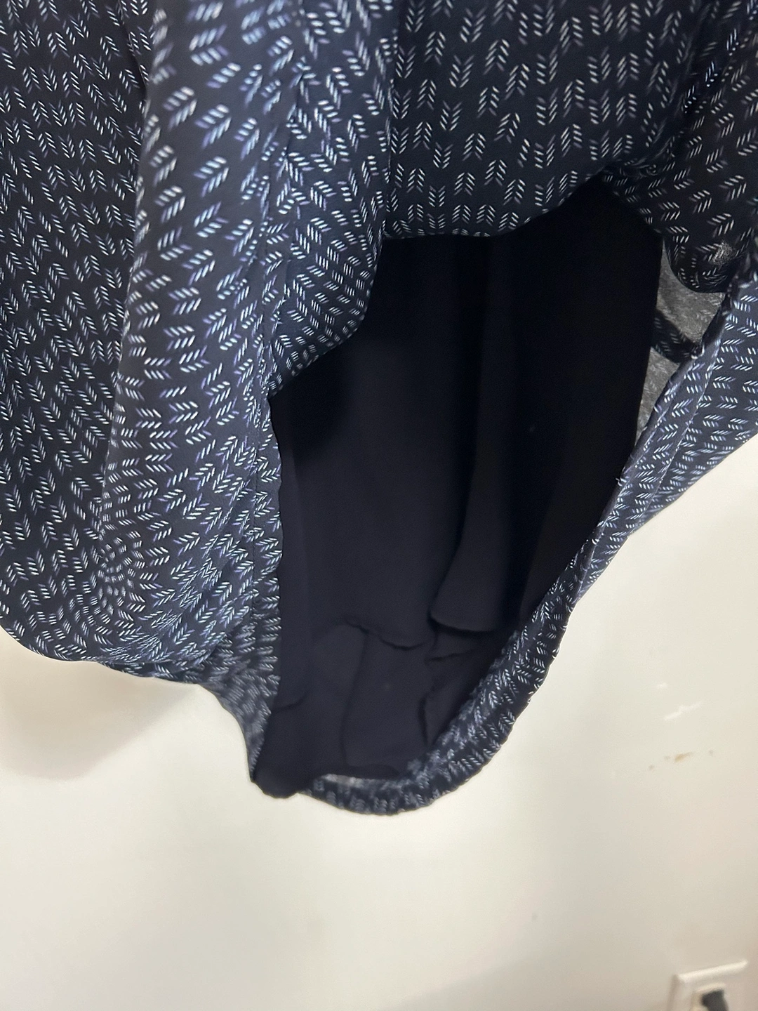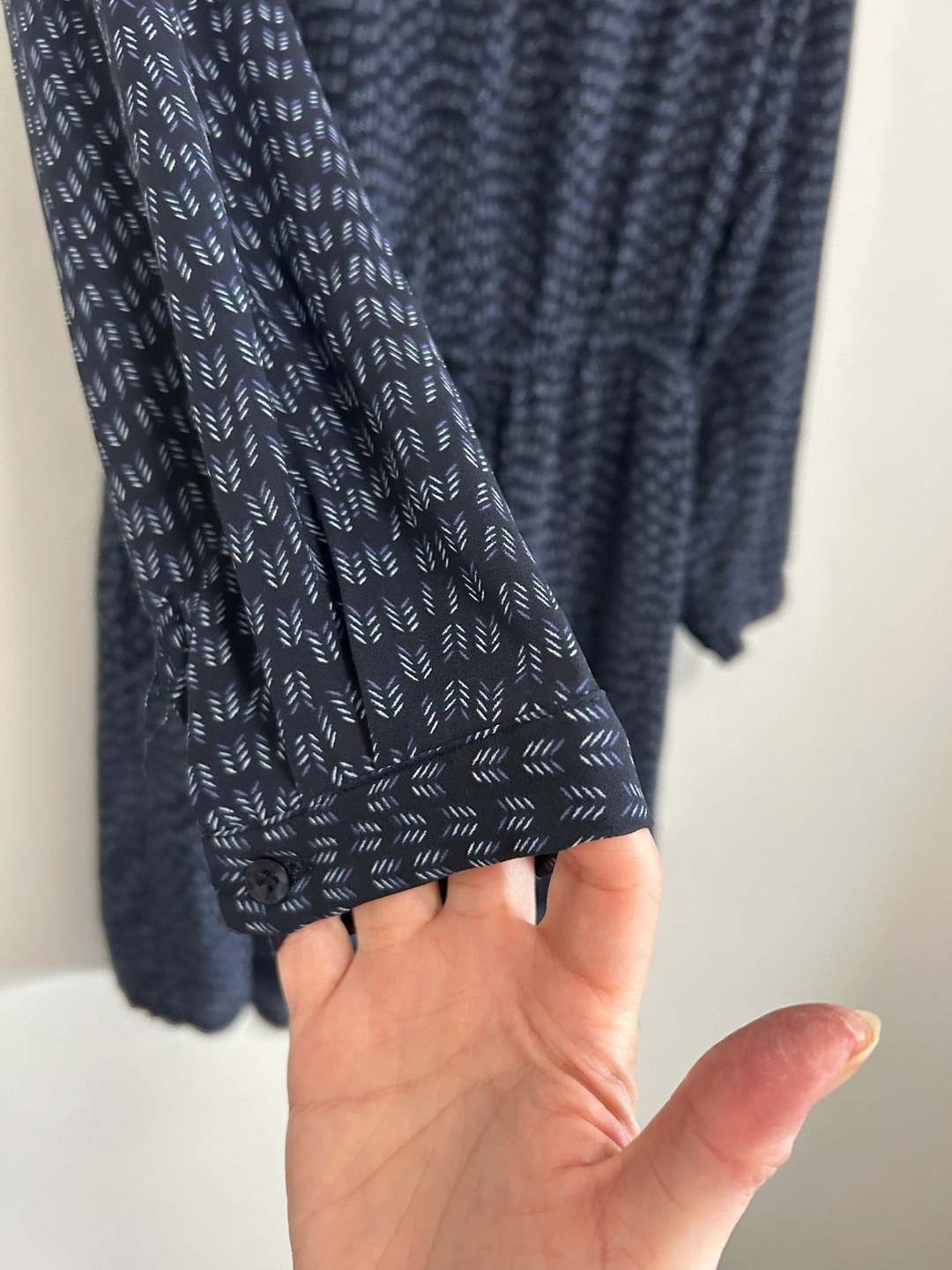 Long sleeved dress with a tie at the waist. The dress is a size Medium. It has a black and white floral print. The dress is made of 100% polyester and has a black lining.