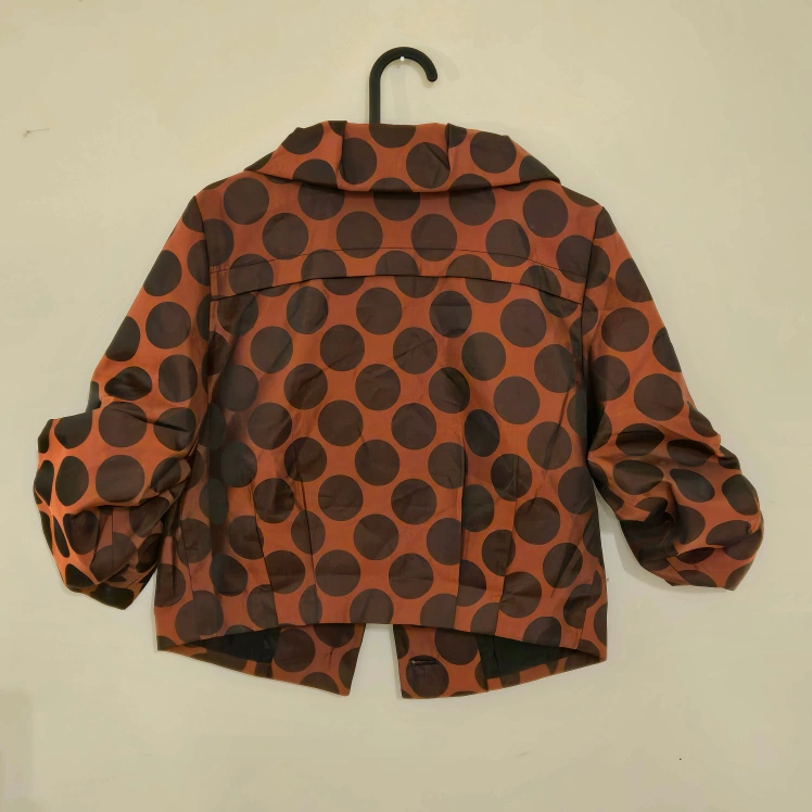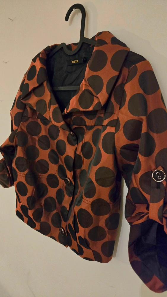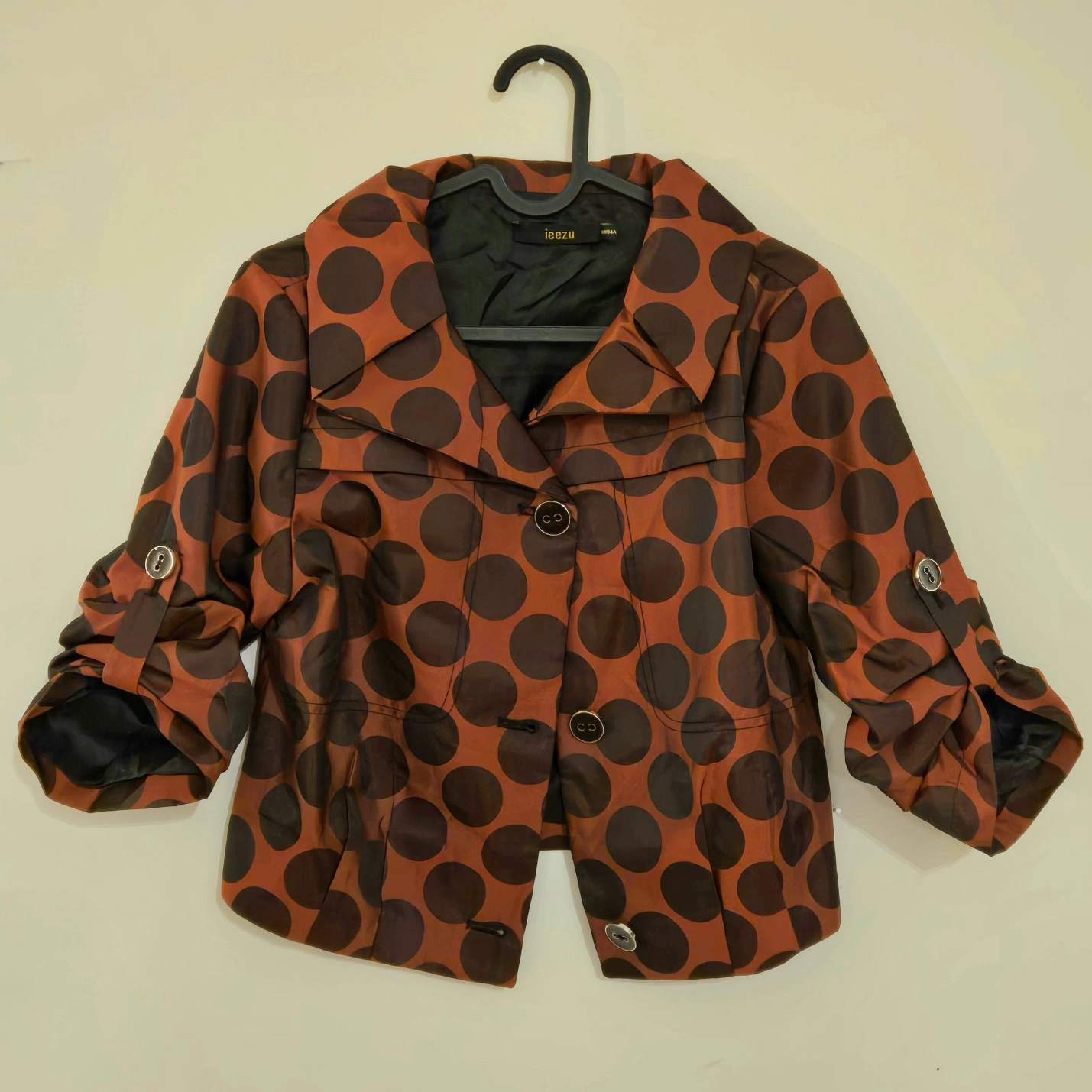 Burgundy and black polka dot jacket with a collared neckline and button closure.