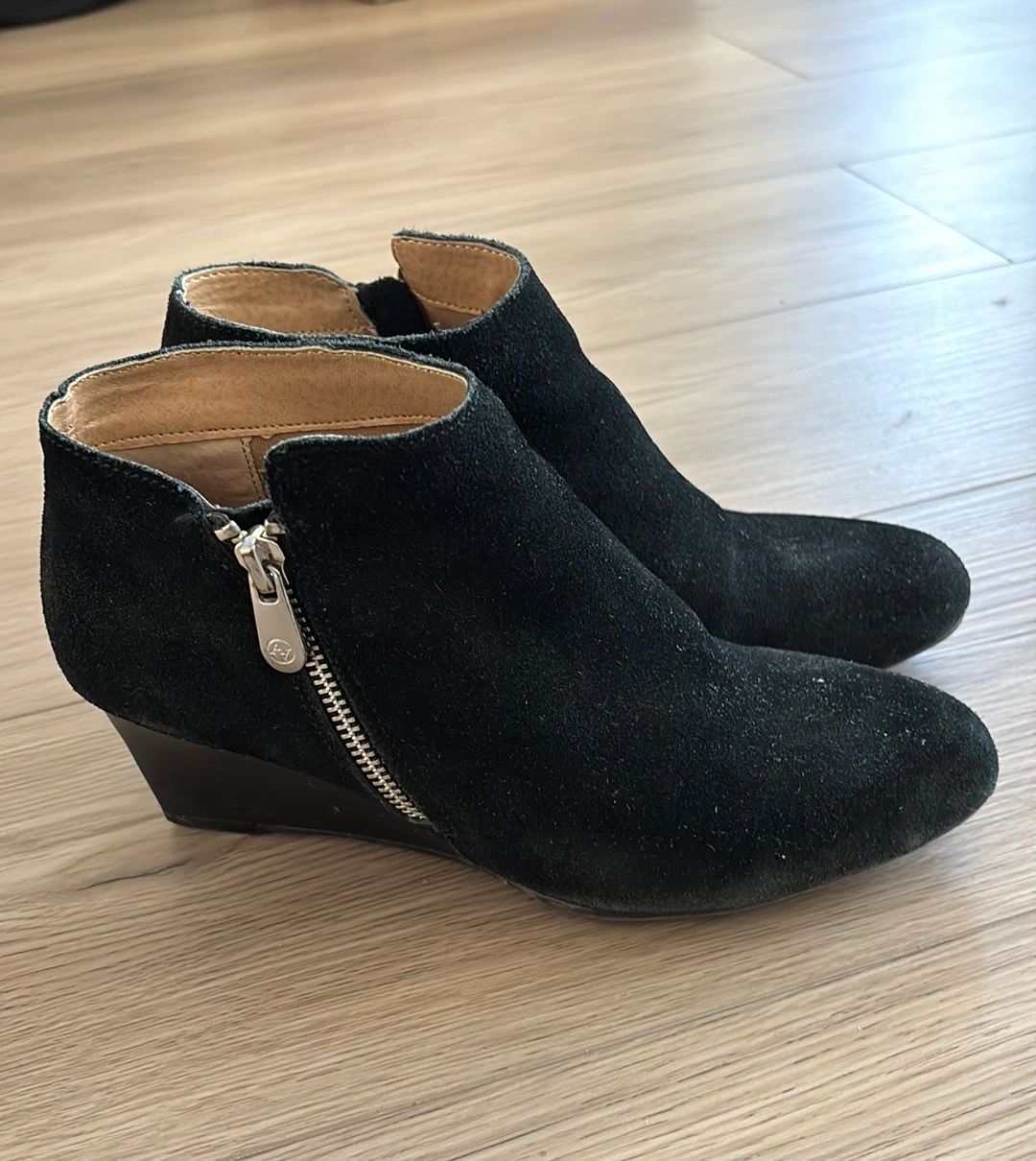 Black suede booties with a wedge heel and side zipper. Size 6. In excellent condition Very comfy