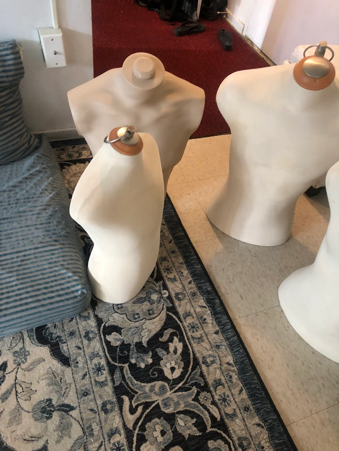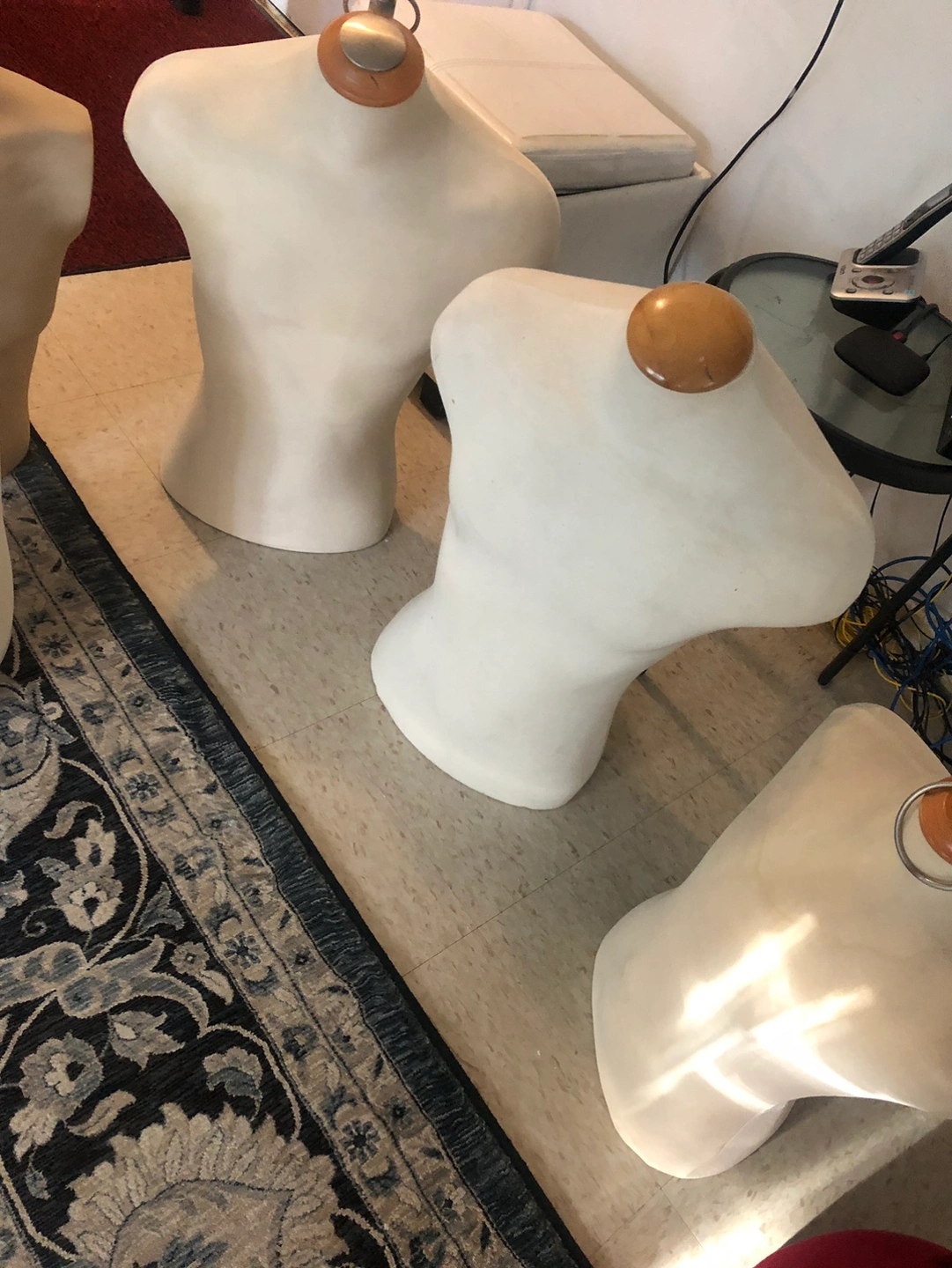 Set of six mannequins, including 5 white plastic mannequins, and 1 red fabric mannequin.
