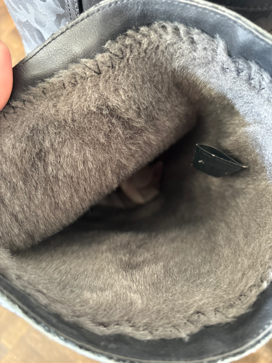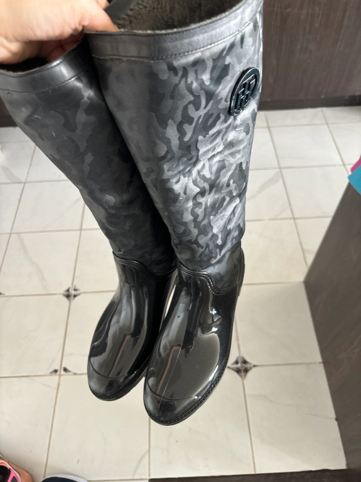 Black rain boots with a camouflage pattern. They are lined with a fuzzy material for warmth.