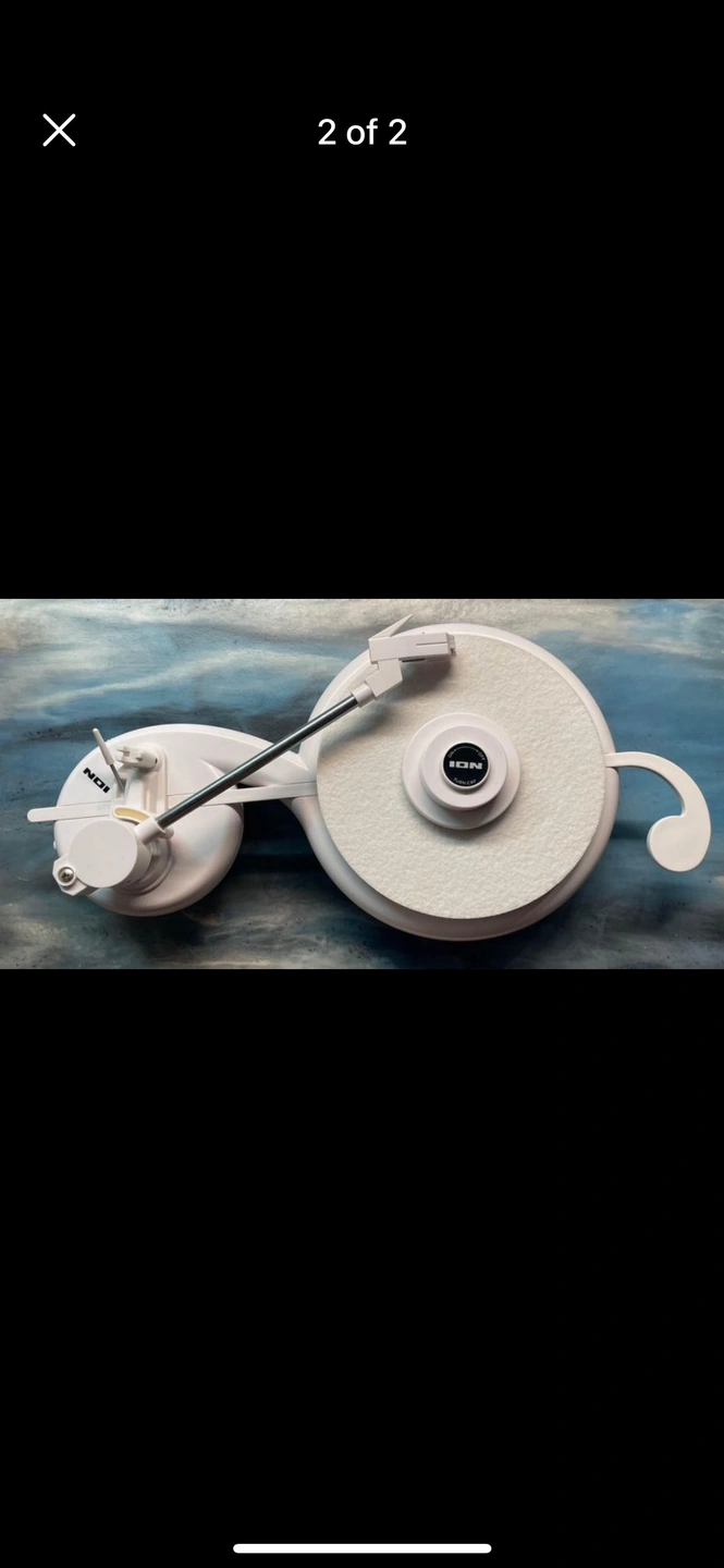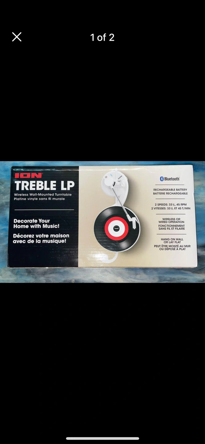White Wall-Mounted Turntable with built-in speakers. Plays 33 1/3, 45 RPM records. Bluetooth connectivity. Can be used on a wall or on a table. Includes power supply and USB cable. Comes with a stylus brush. Has a built in speaker and is designed for the modern listening experience. Enjoy music from vinyl records anywhere in your home!