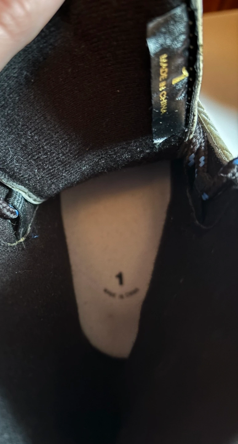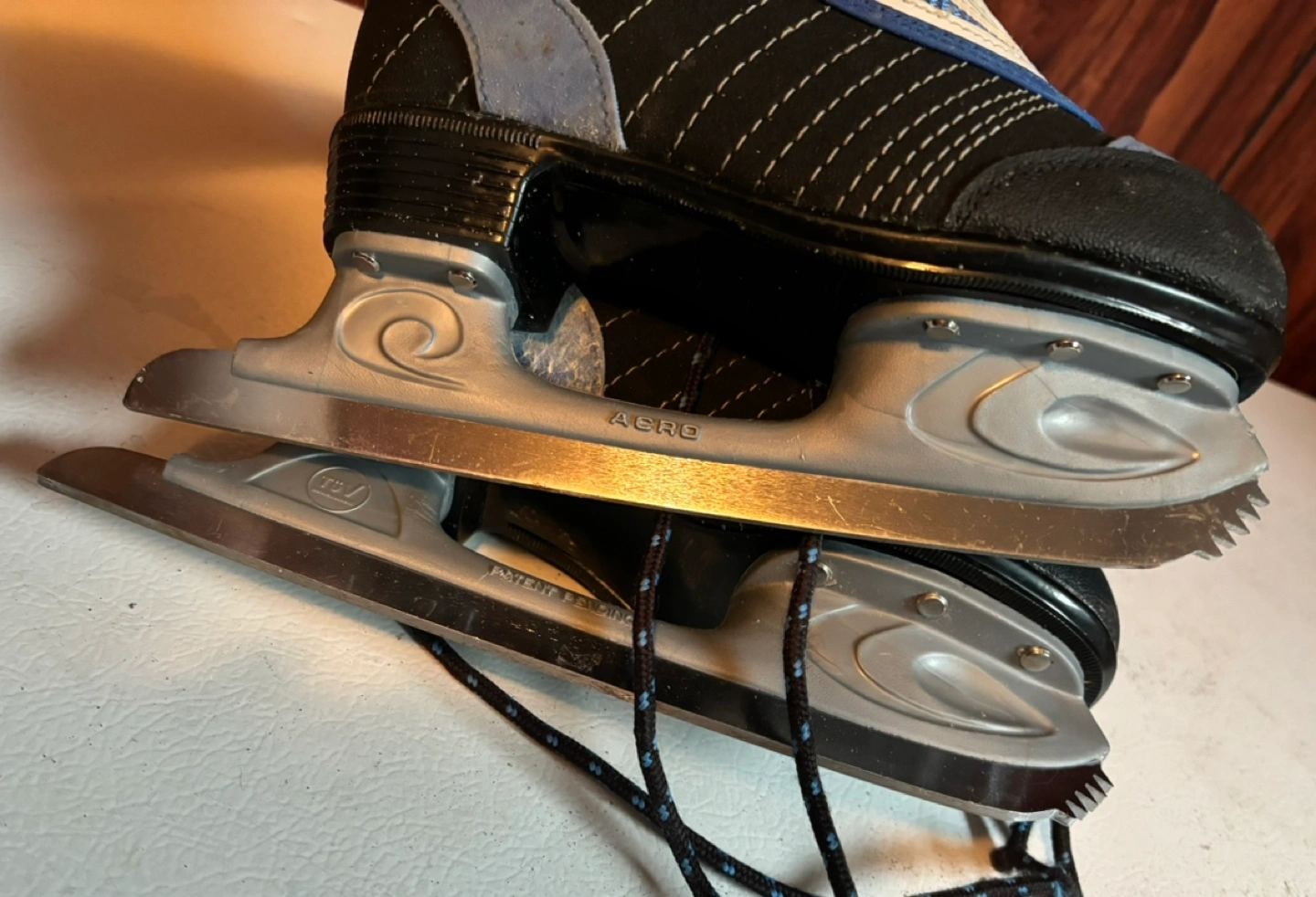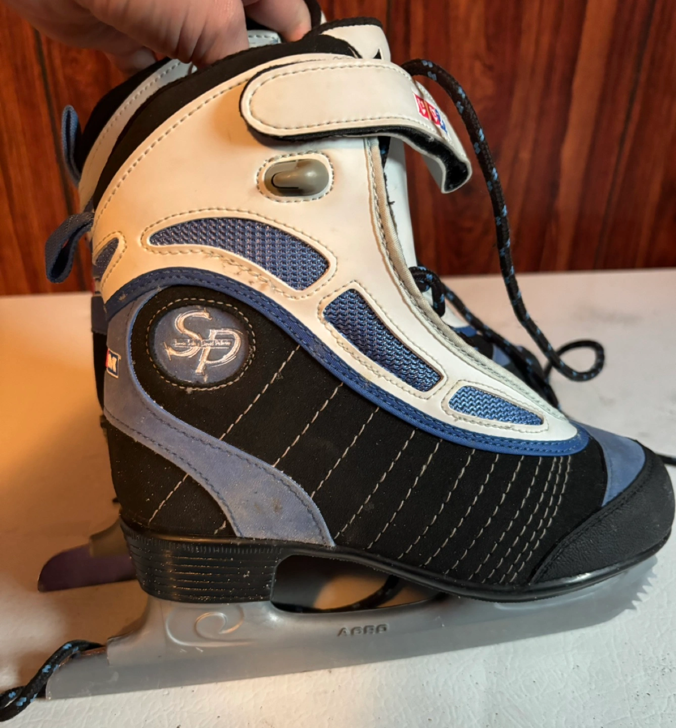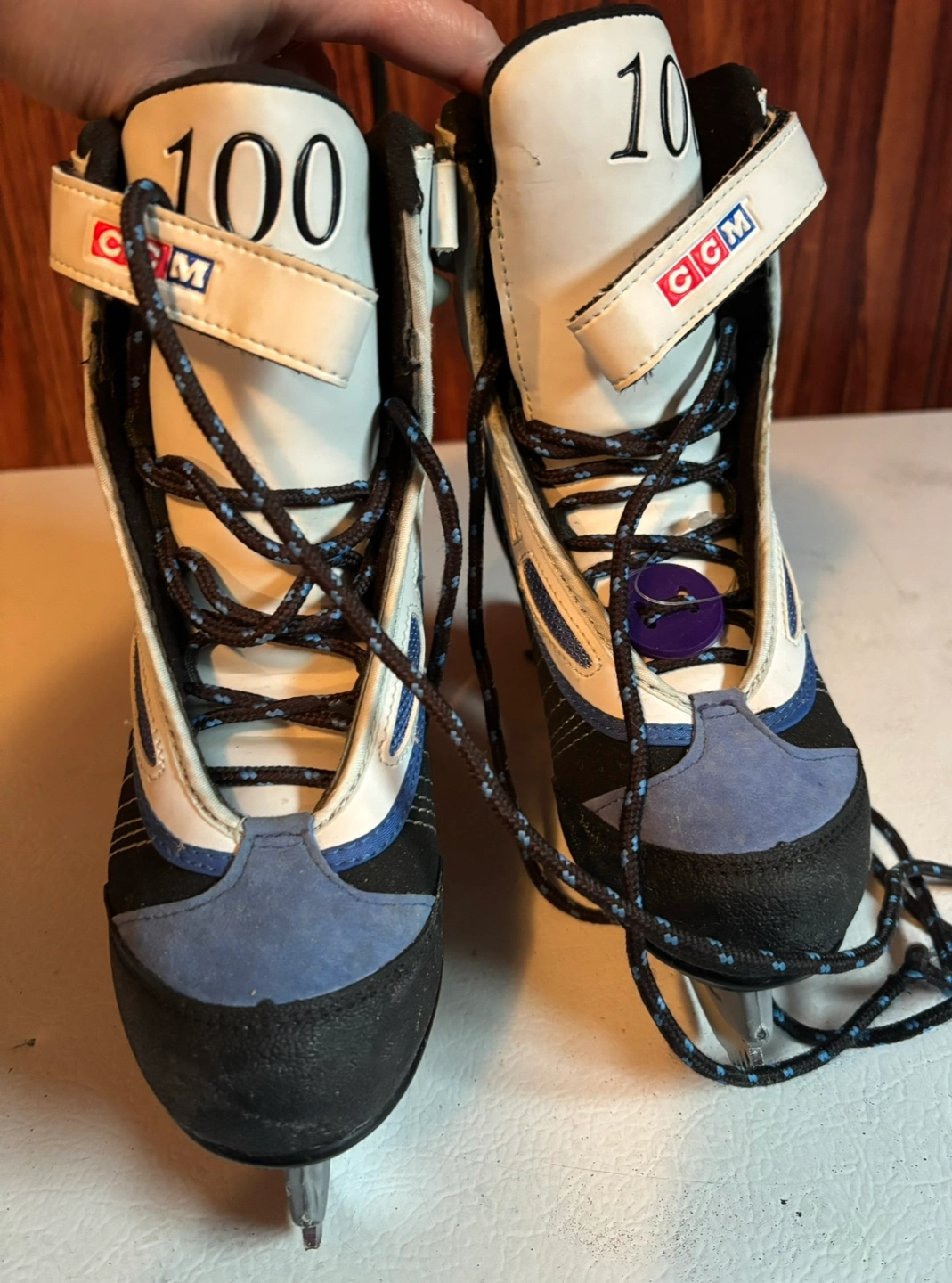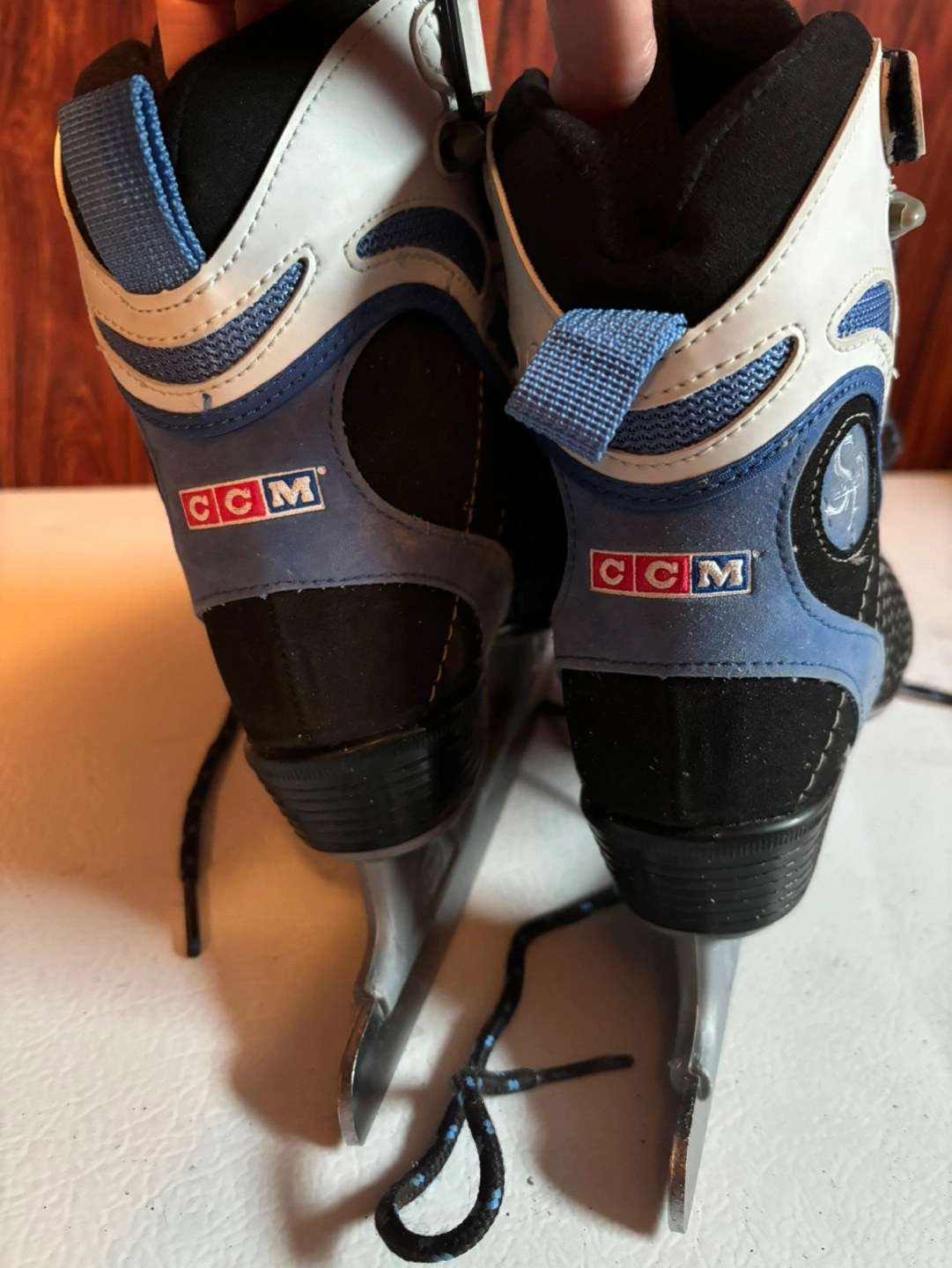 Kids CCM Hockey Skates in Size 1 with a blue and white design. These skates are in good condition and are ready to hit the ice!