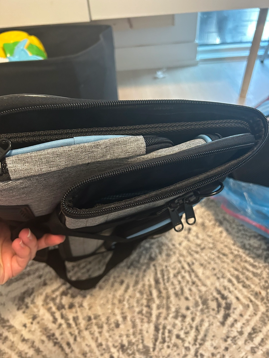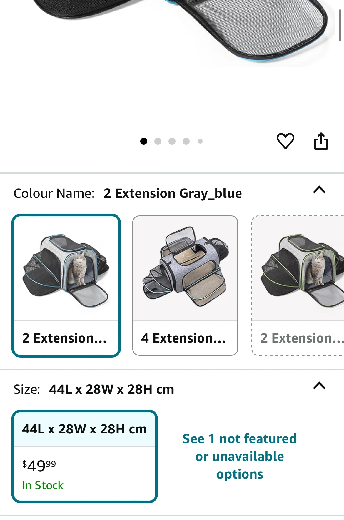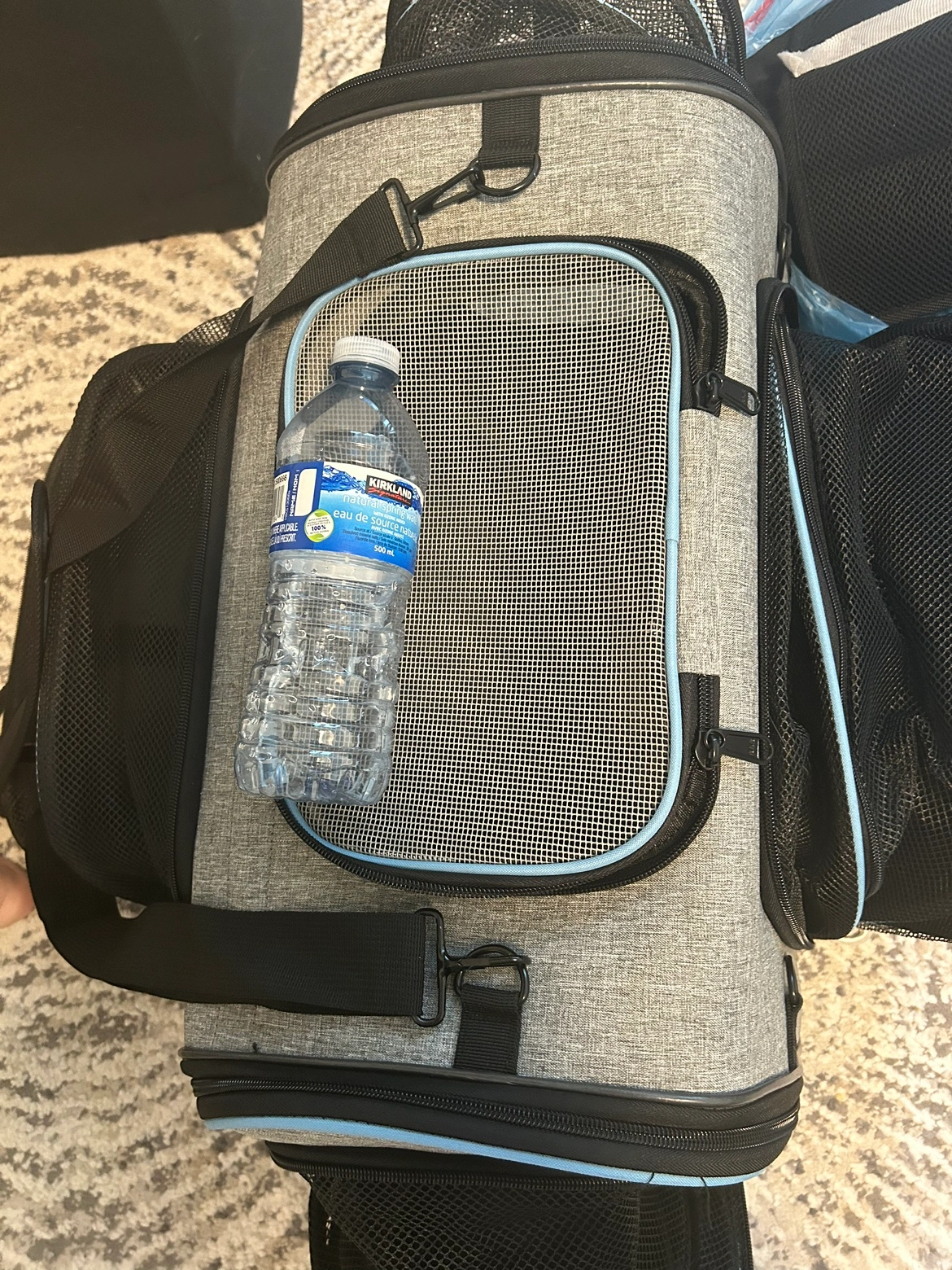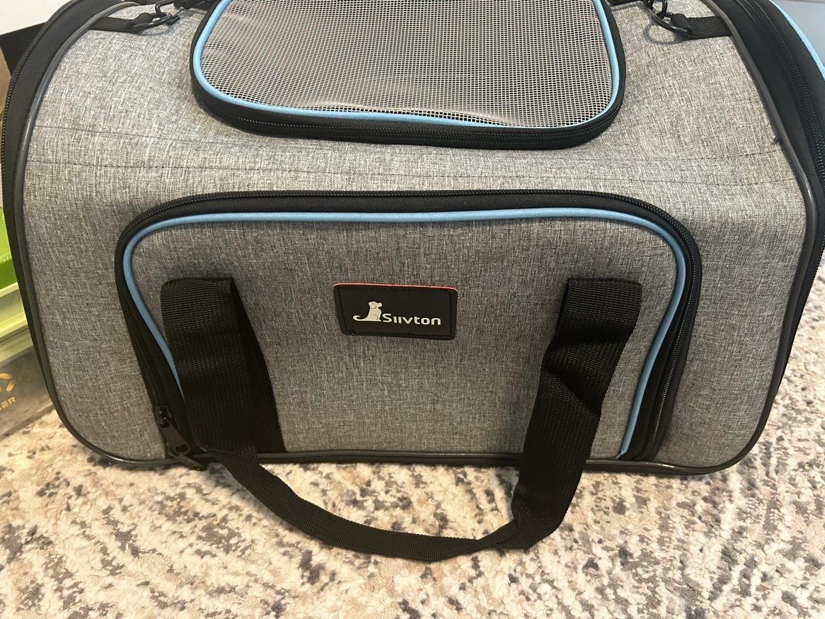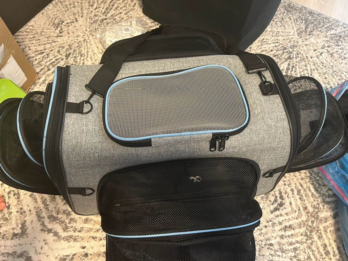 Pet carrier with front pocket and two side pockets. All 4 sides can be expanded to let more room for your furry friend. It has a handle for carrying by hand and a shoulder strap. Can fold up for storage.