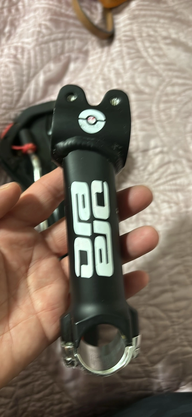 Black bike seat and stem. The seat is a Selle Royal brand and the stem is a D.G.C. brand. Both are in good condition.