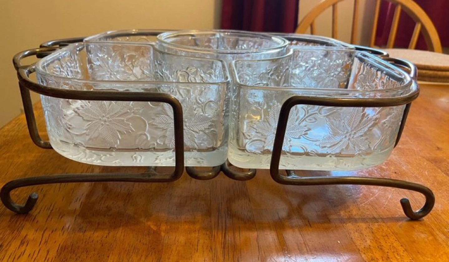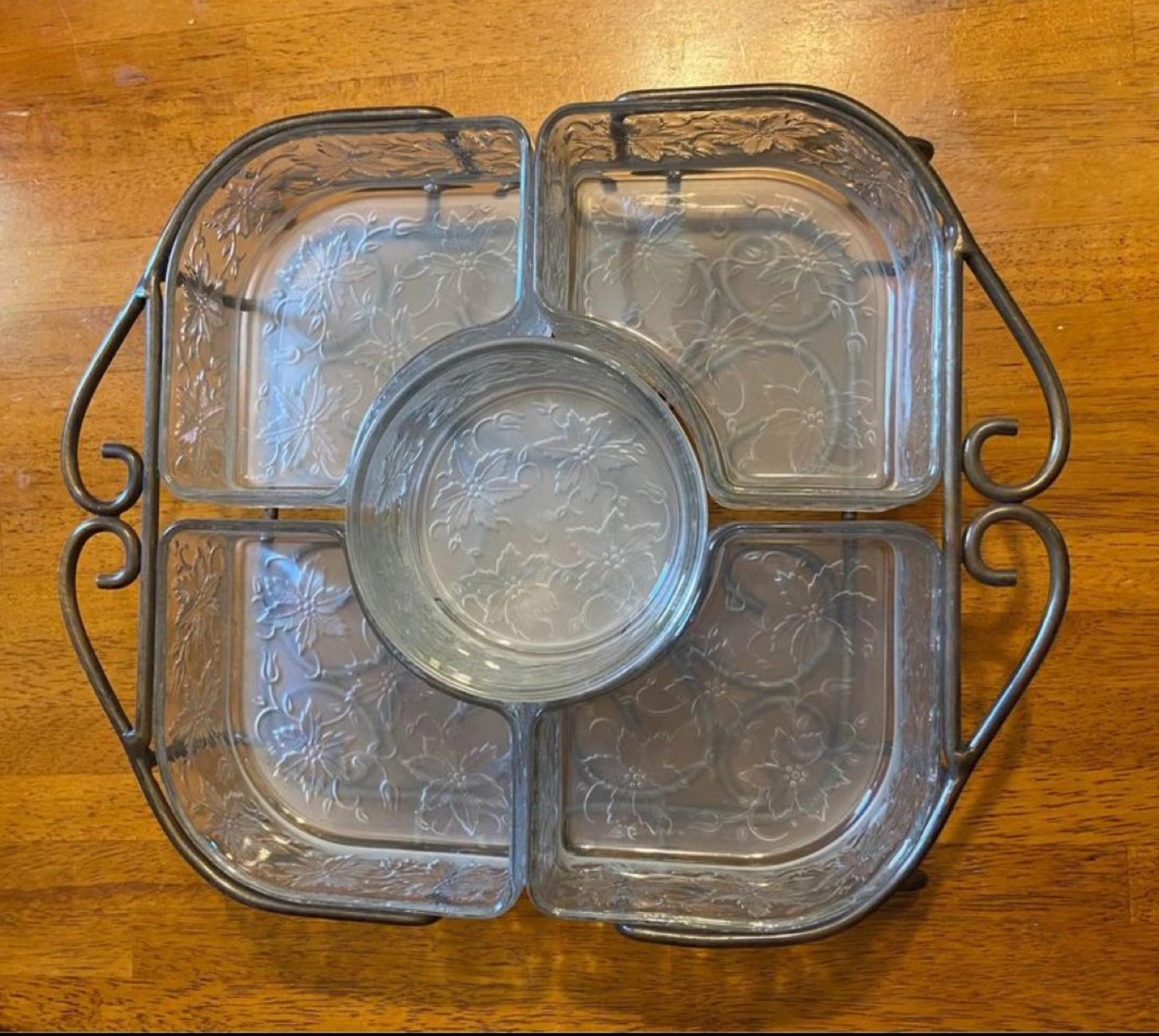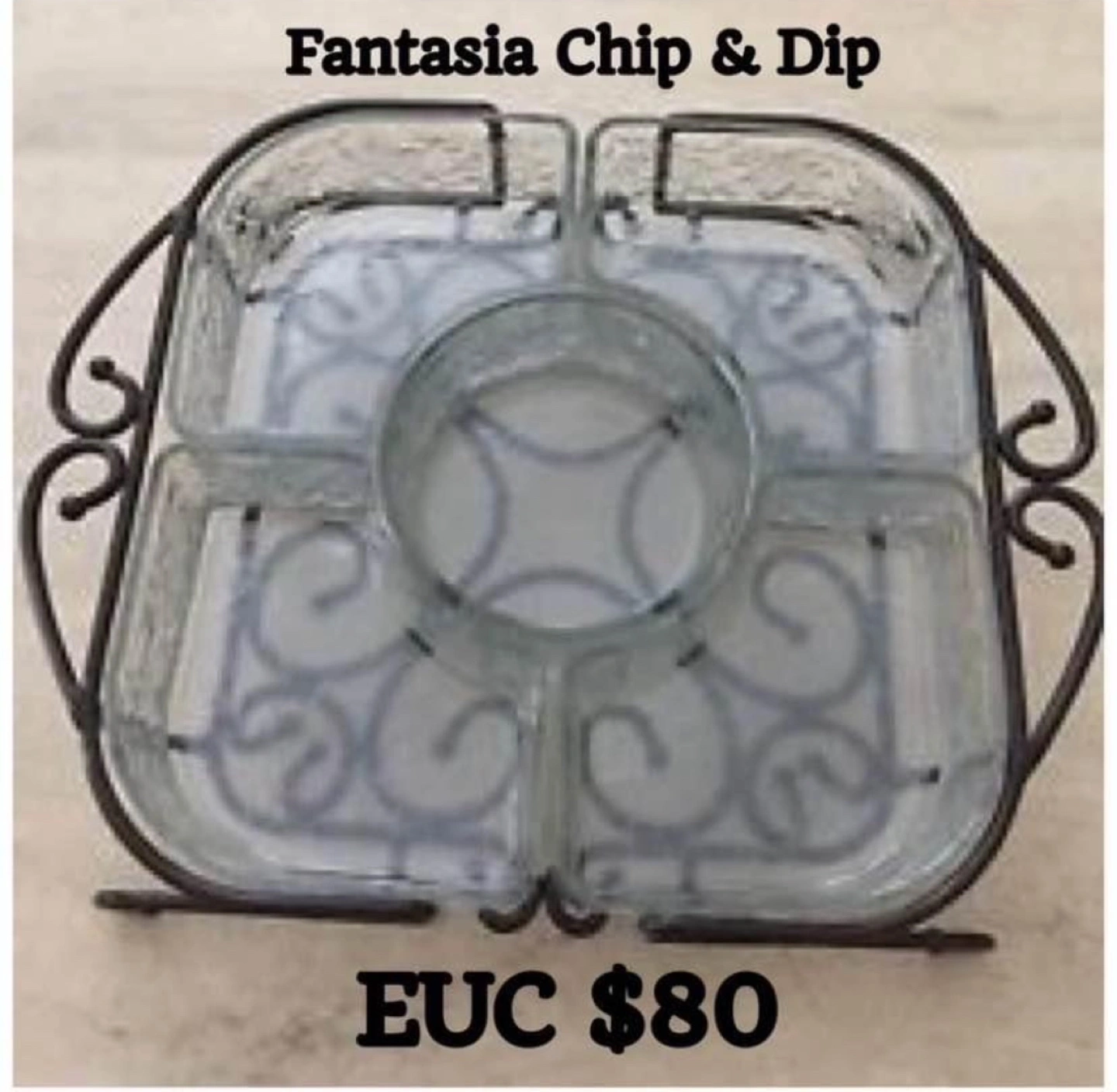 This is a beautiful Retired Princess House - Fantasia Chip & Dip Serving set. 5 glass serving dishes with a metal stand. It has an etched floral design on the glass. The metal stand has a pretty scroll design. This is great for parties or entertaining. The dishes are all removable. The center bowl has a 12 inch diameter. It would make a nice gift for someone who enjoys entertaining.