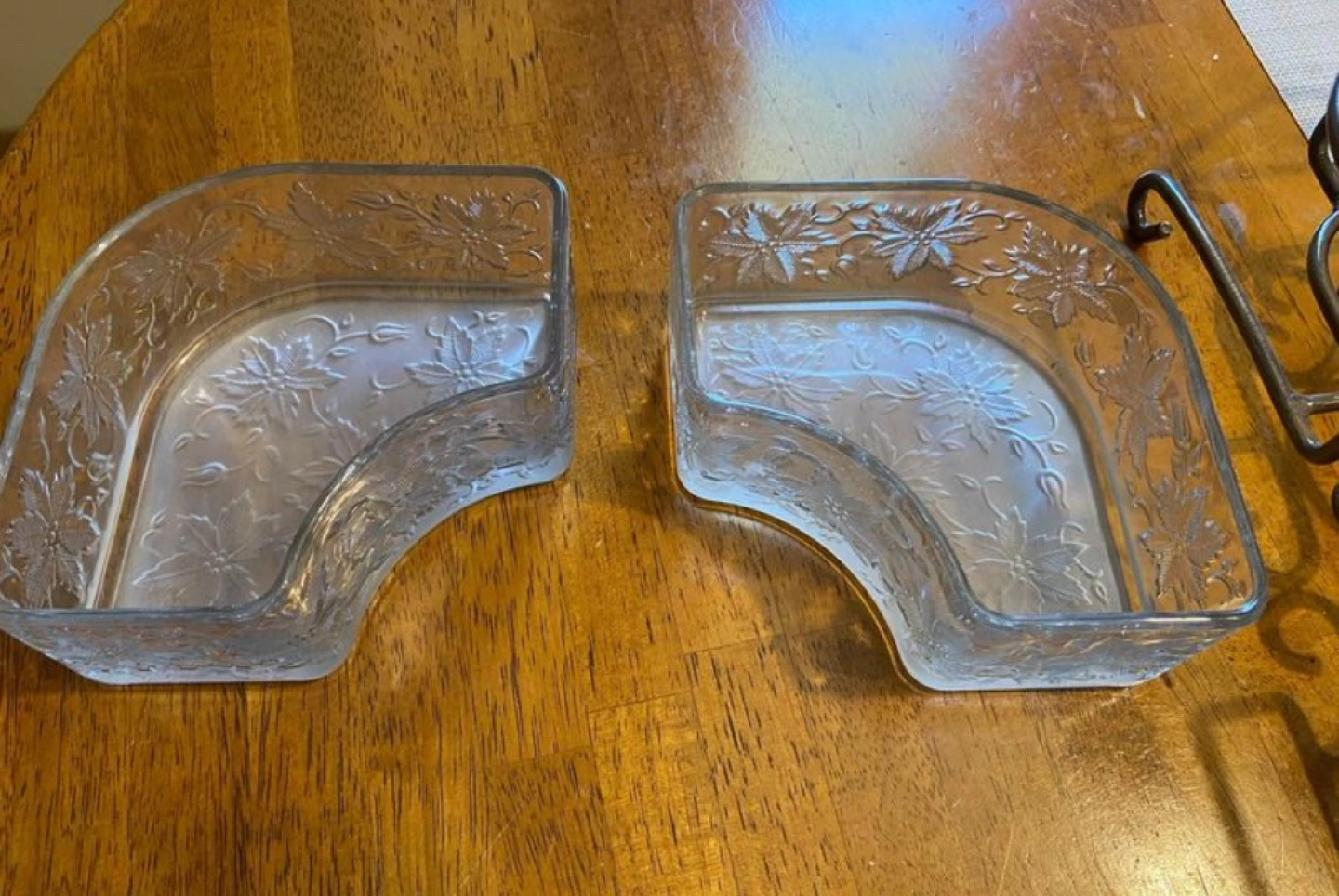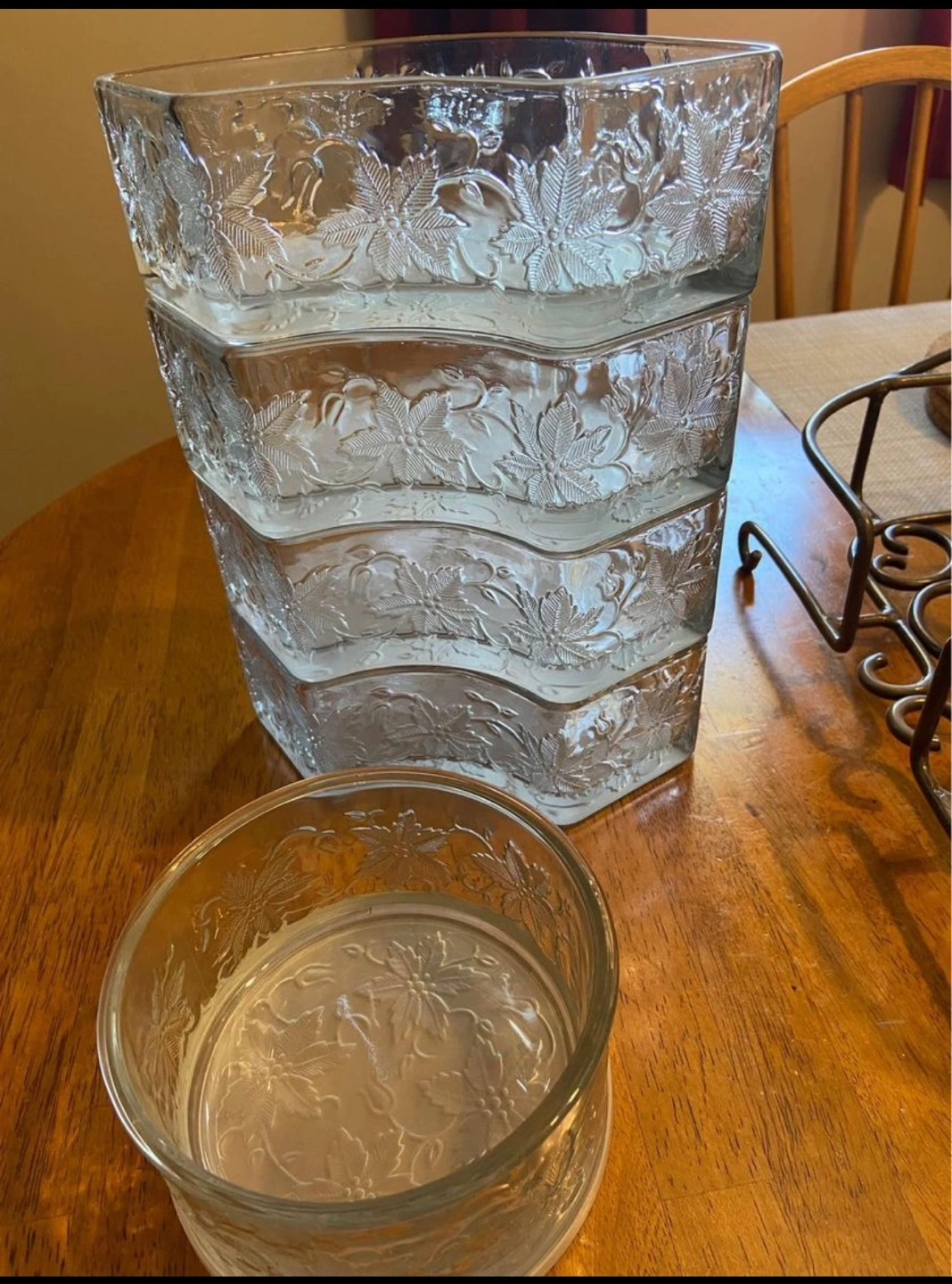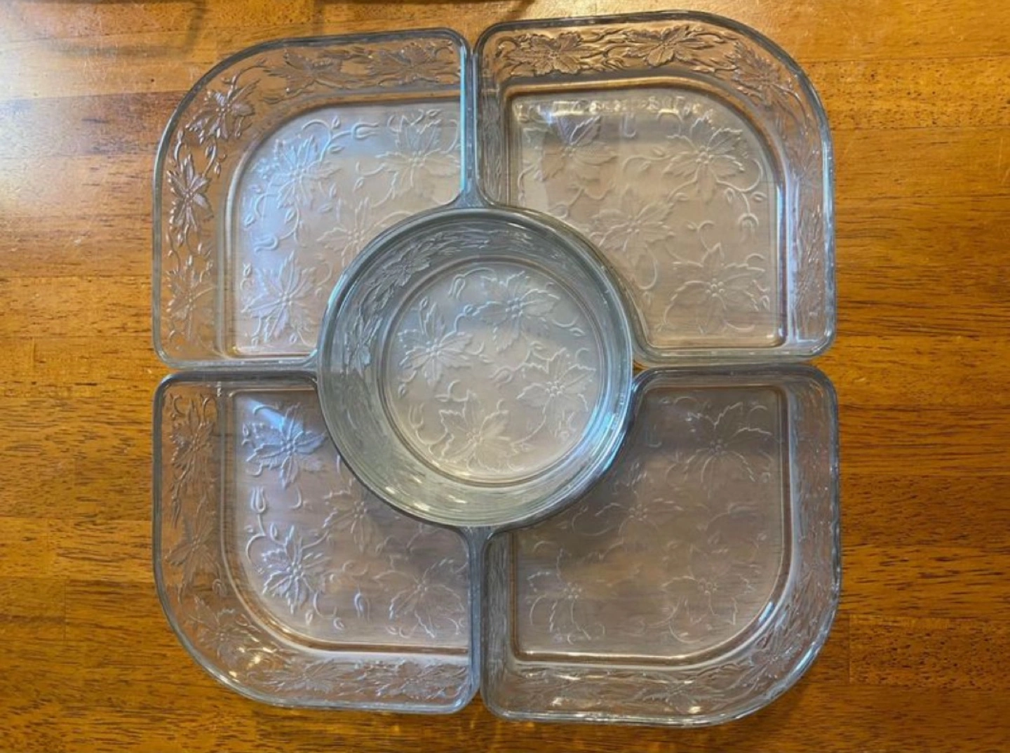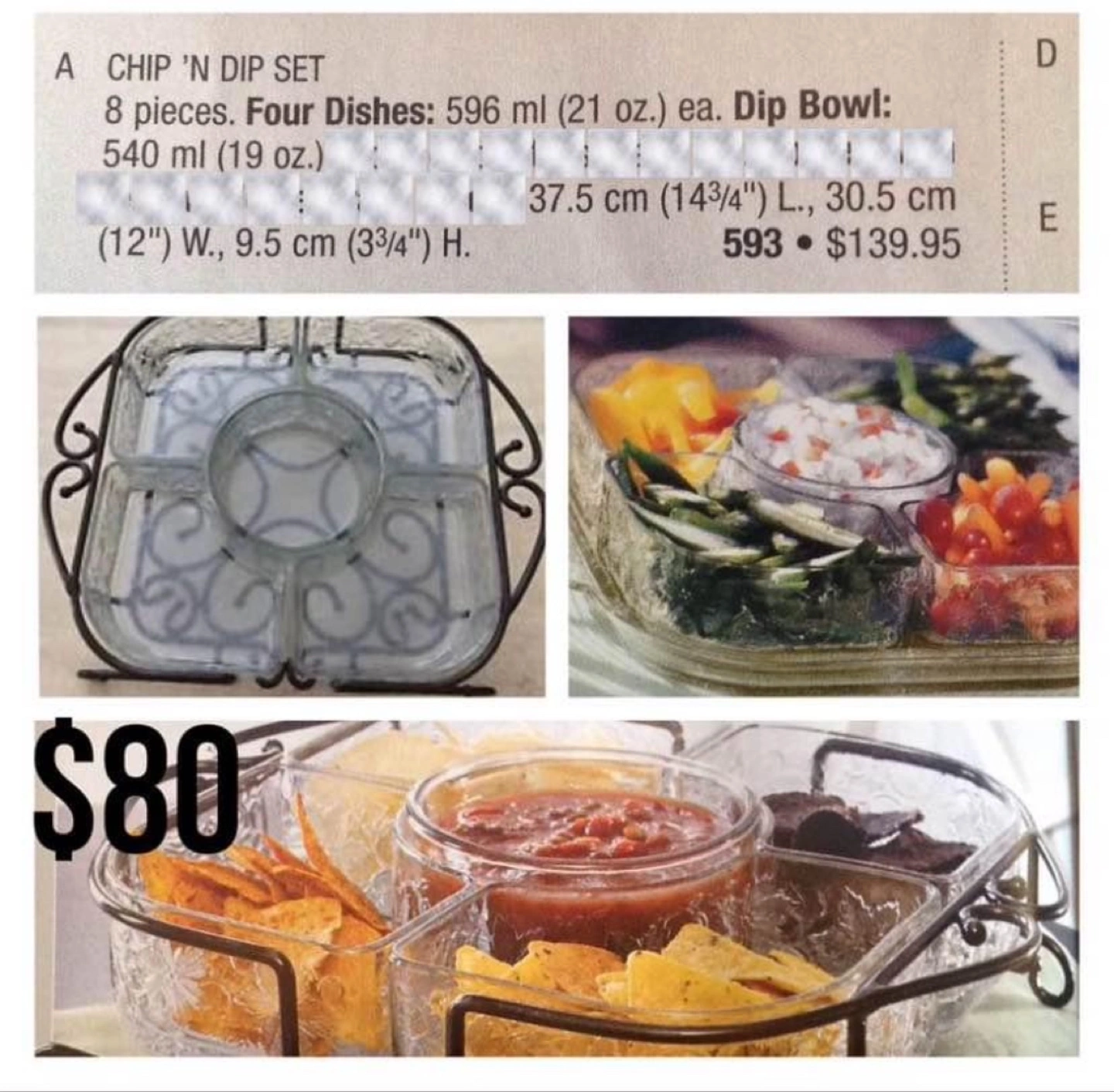 This is a beautiful Retired Princess House - Fantasia Chip & Dip Serving set. 5 glass serving dishes with a metal stand. It has an etched floral design on the glass. The metal stand has a pretty scroll design. This is great for parties or entertaining. The dishes are all removable. The center bowl has a 12 inch diameter. It would make a nice gift for someone who enjoys entertaining.