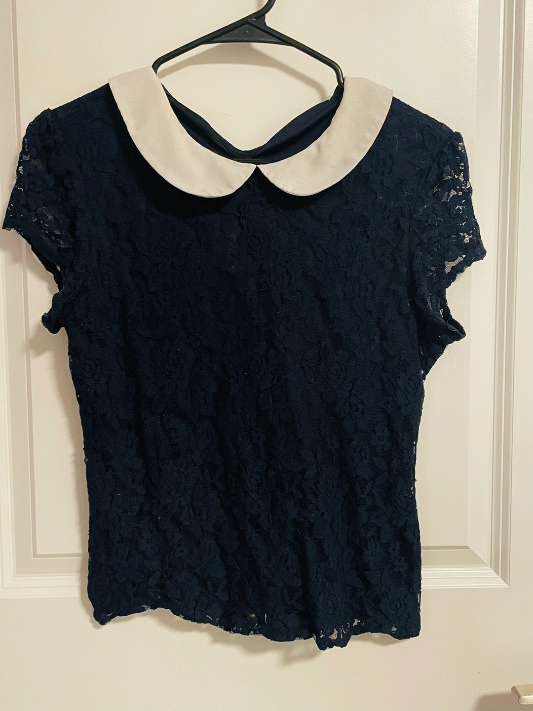 Short-sleeved, black lace top with a white collar. It is fitted and would look great dressed up or down! Its says large but its more like small to medium.