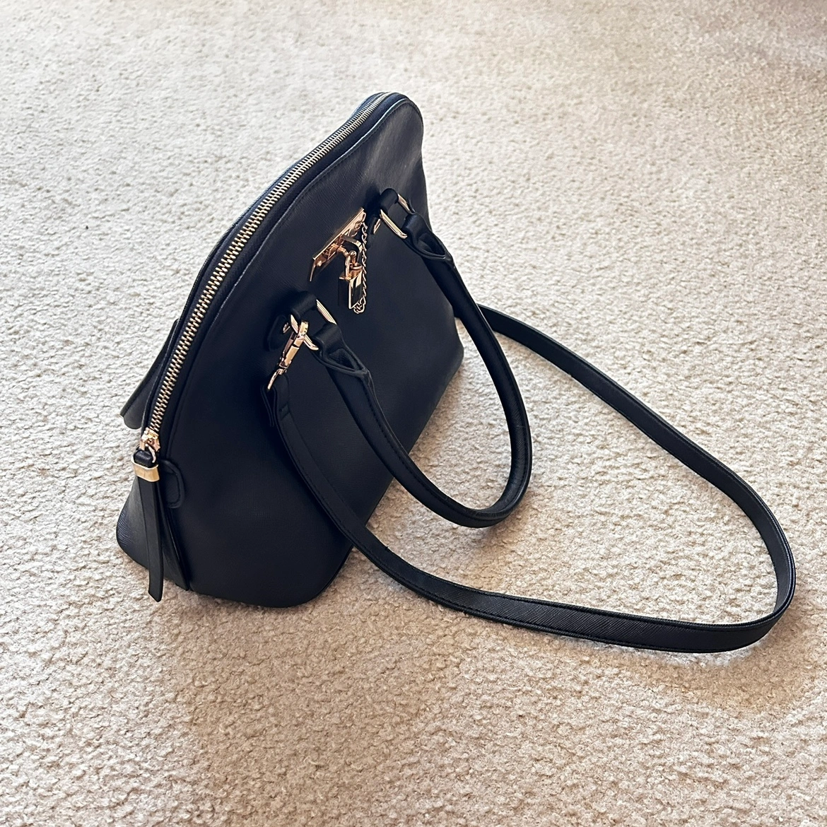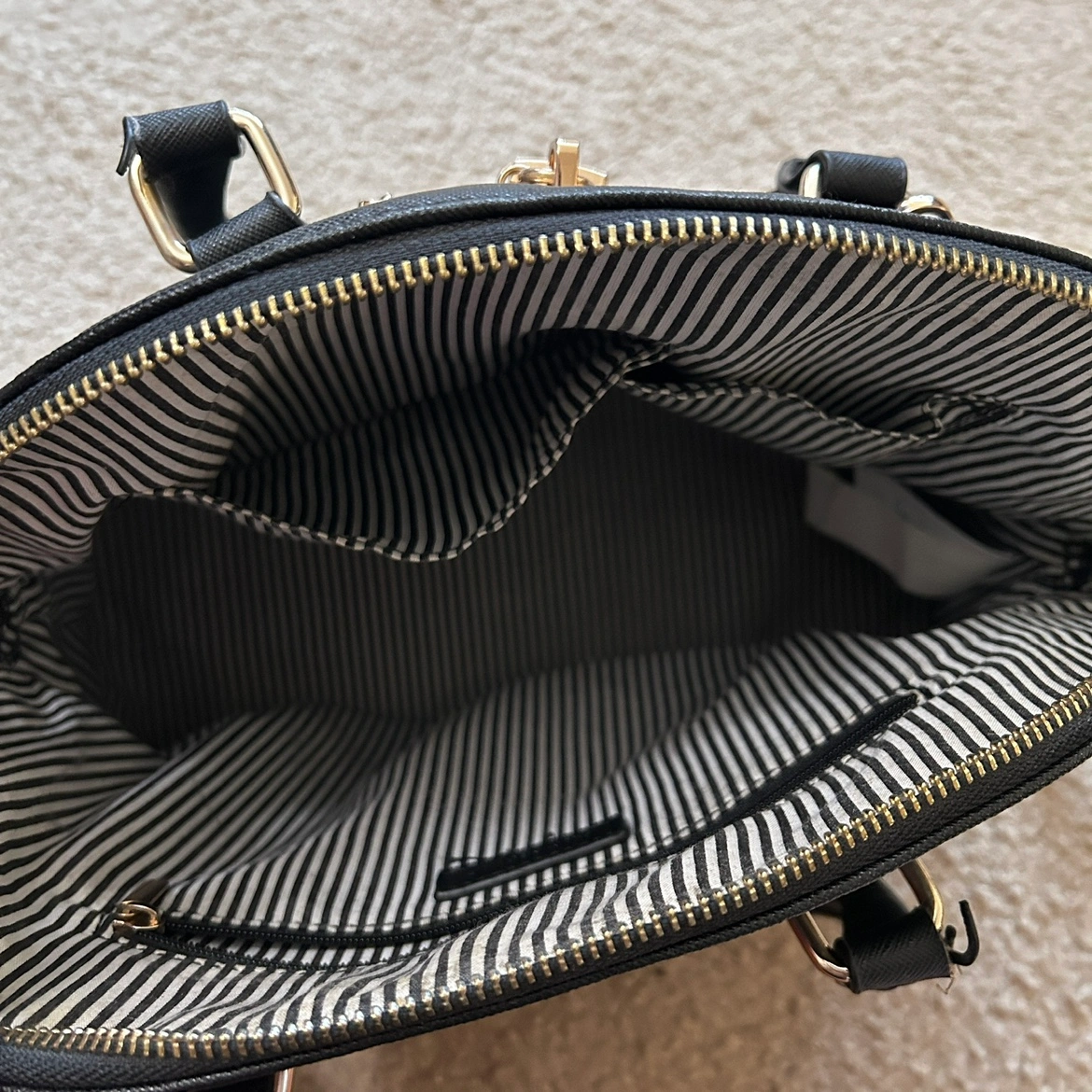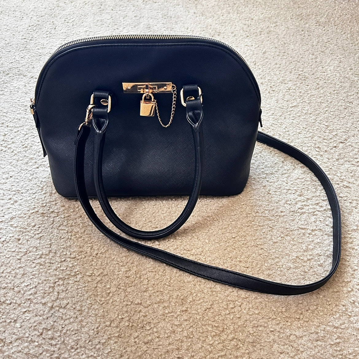 Black handbag with a gold lock, top zipper closure and removable strap. Has interior multiple pockets. Cute for work, school or going out.