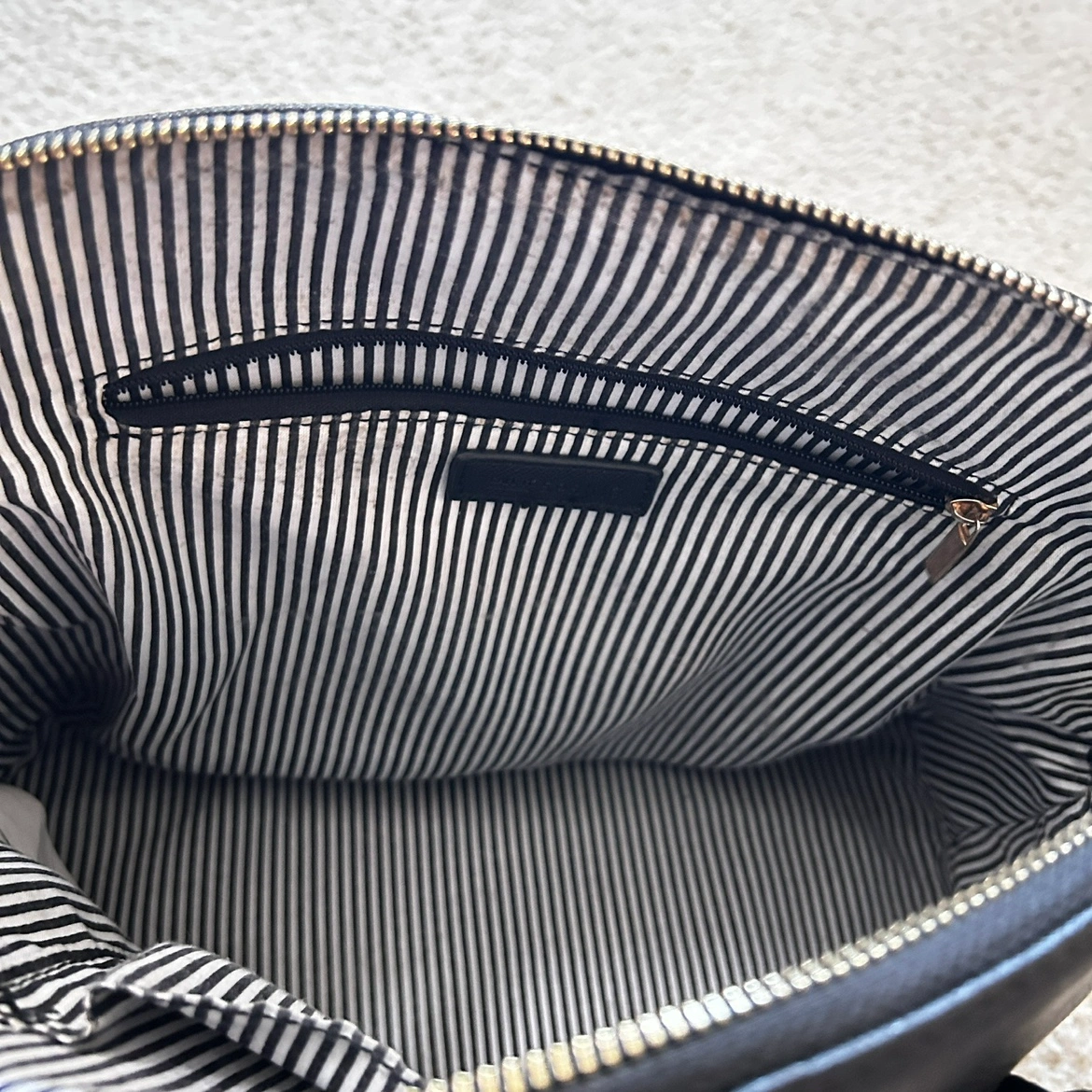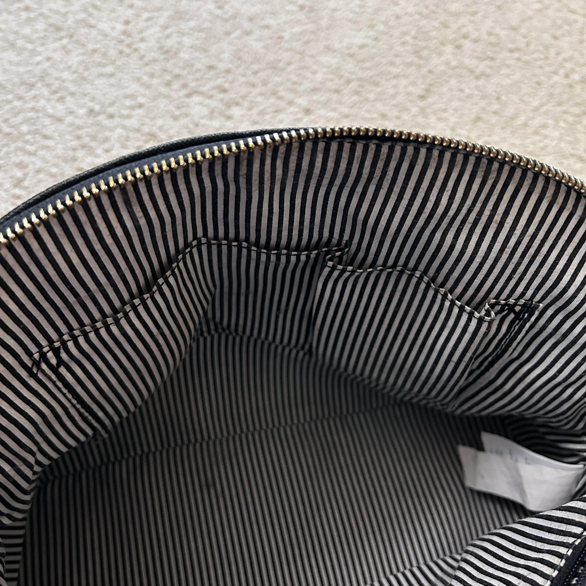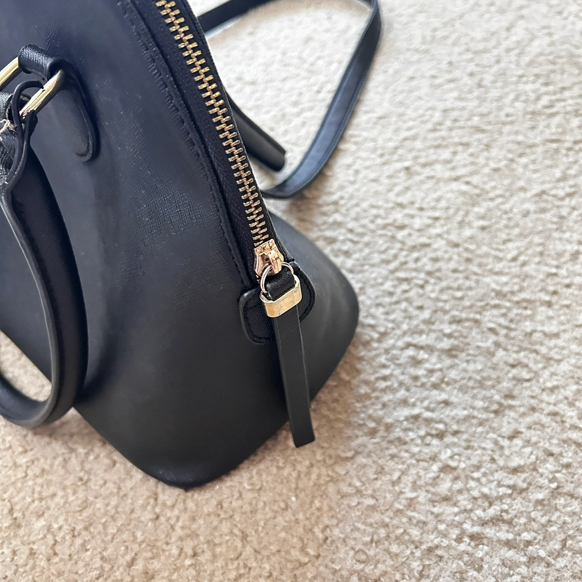 Black handbag with a gold lock, top zipper closure and removable strap. Has interior multiple pockets. Cute for work, school or going out.