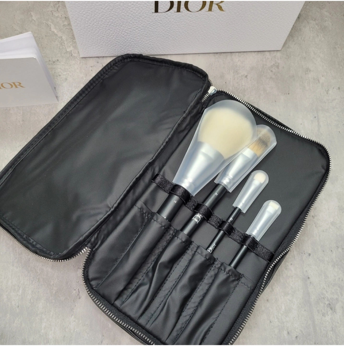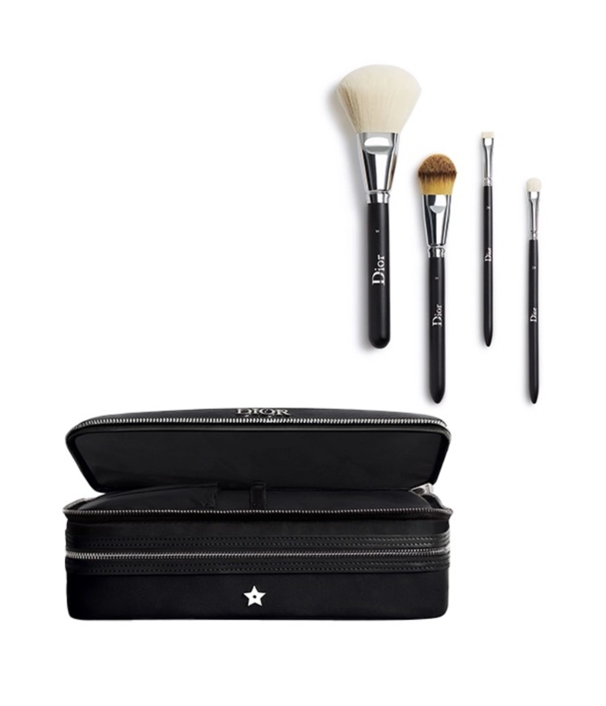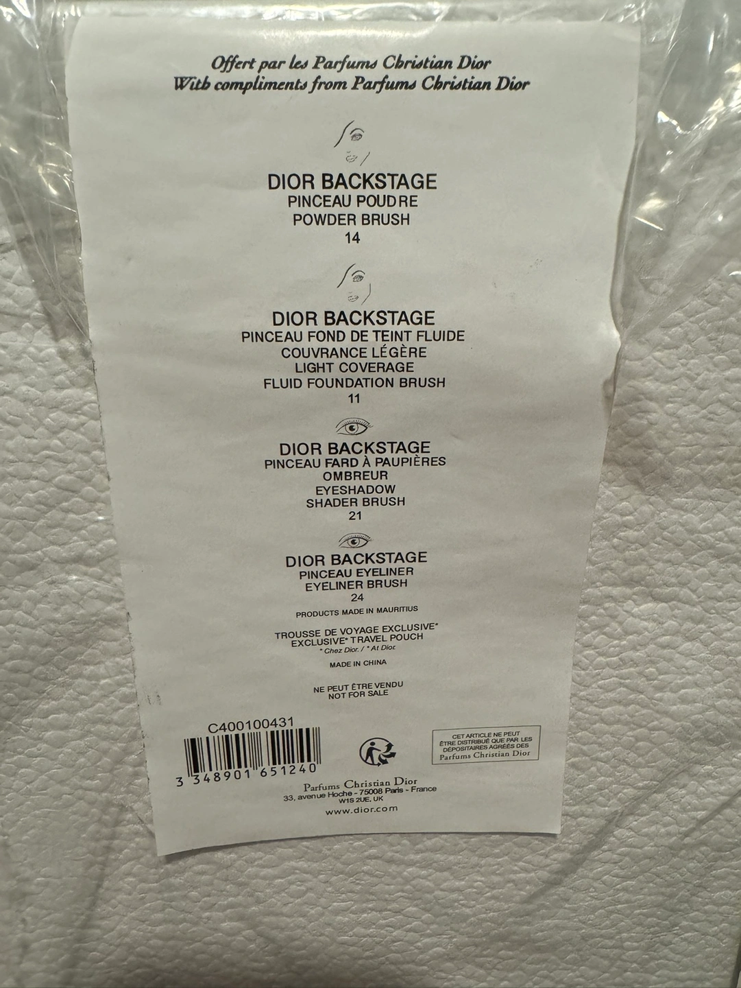 DIOR BACKSTAGE PLATINUM GIFT BRUSH SET 14 Essential Brushes Face and Eyes Limited Edition DIOR BEAUTE VIP Gift and come with gift box. 100% Brand New & Authentic. **This set will be given as a Platinum customer. Very Rare. Made Exclusively Gift for the DIOR Beauty Collection A Vanity makeup case bag, silver tone logo, 2 zipper. Measurements (approximately): 10" x 6" x 3.5" 4 Dior backstage brushes: 14 (Powder Brush), 11 (Fluid foundation Brush), 21 (Eyeshadow - Shader Brush) 24 (Eyeliner Brush)