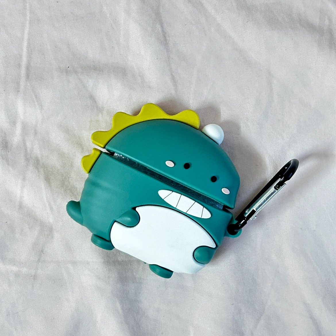 Green dinosaur Airpods case with a carabiner. The case is made of silicone and has a white interior. The case is designed to fit the standard Airpods. NEW.