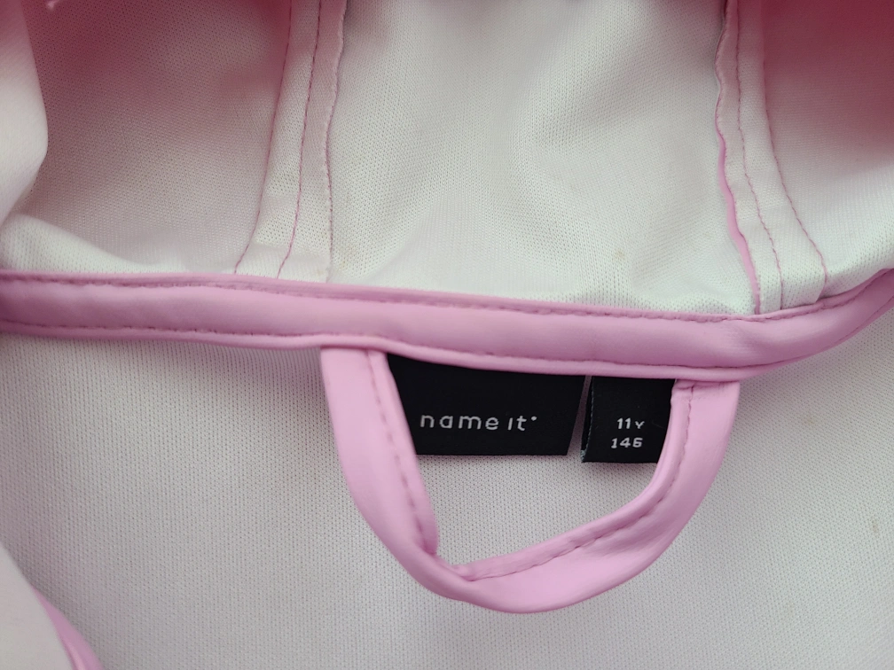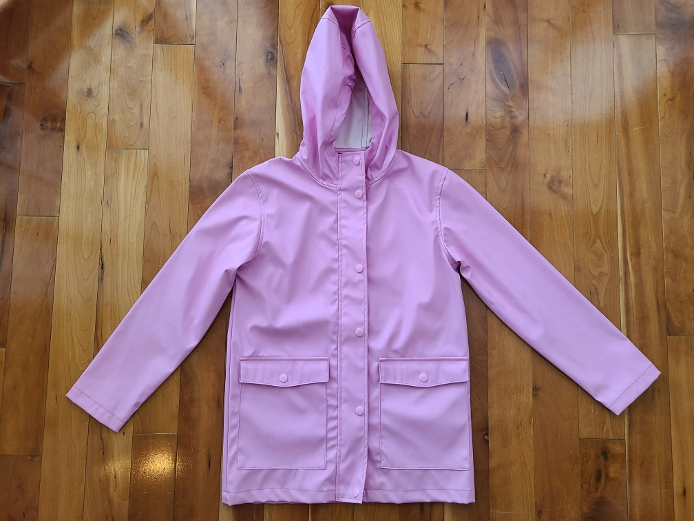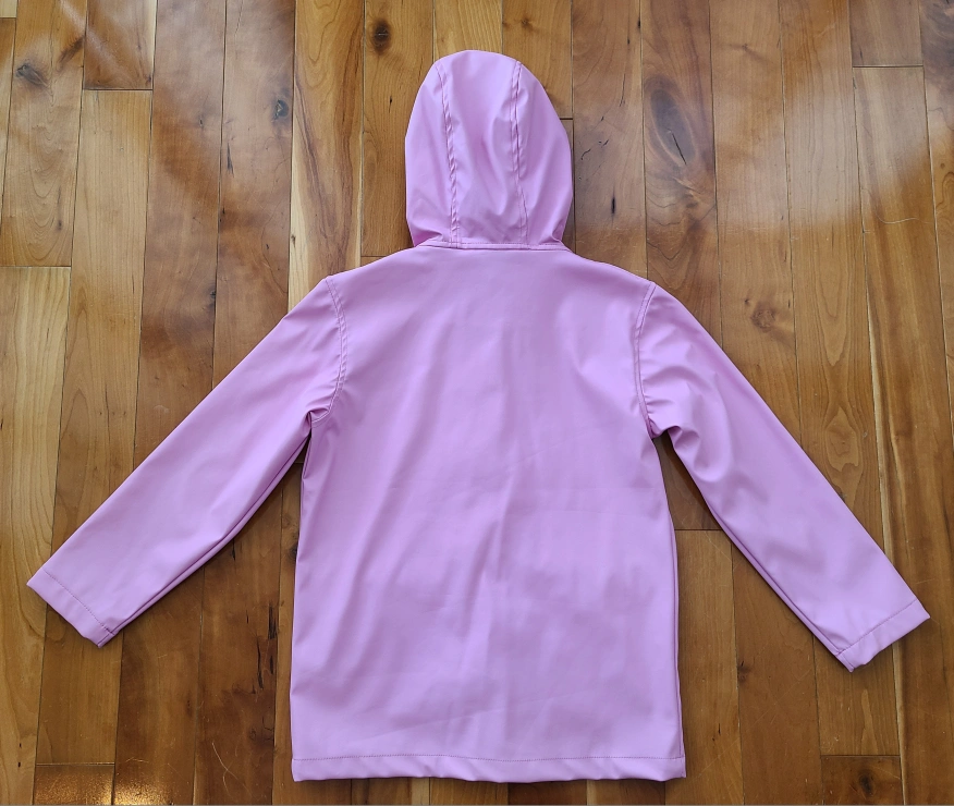 Girls' size 11y/146 pink rain jacket with hood and front pockets.