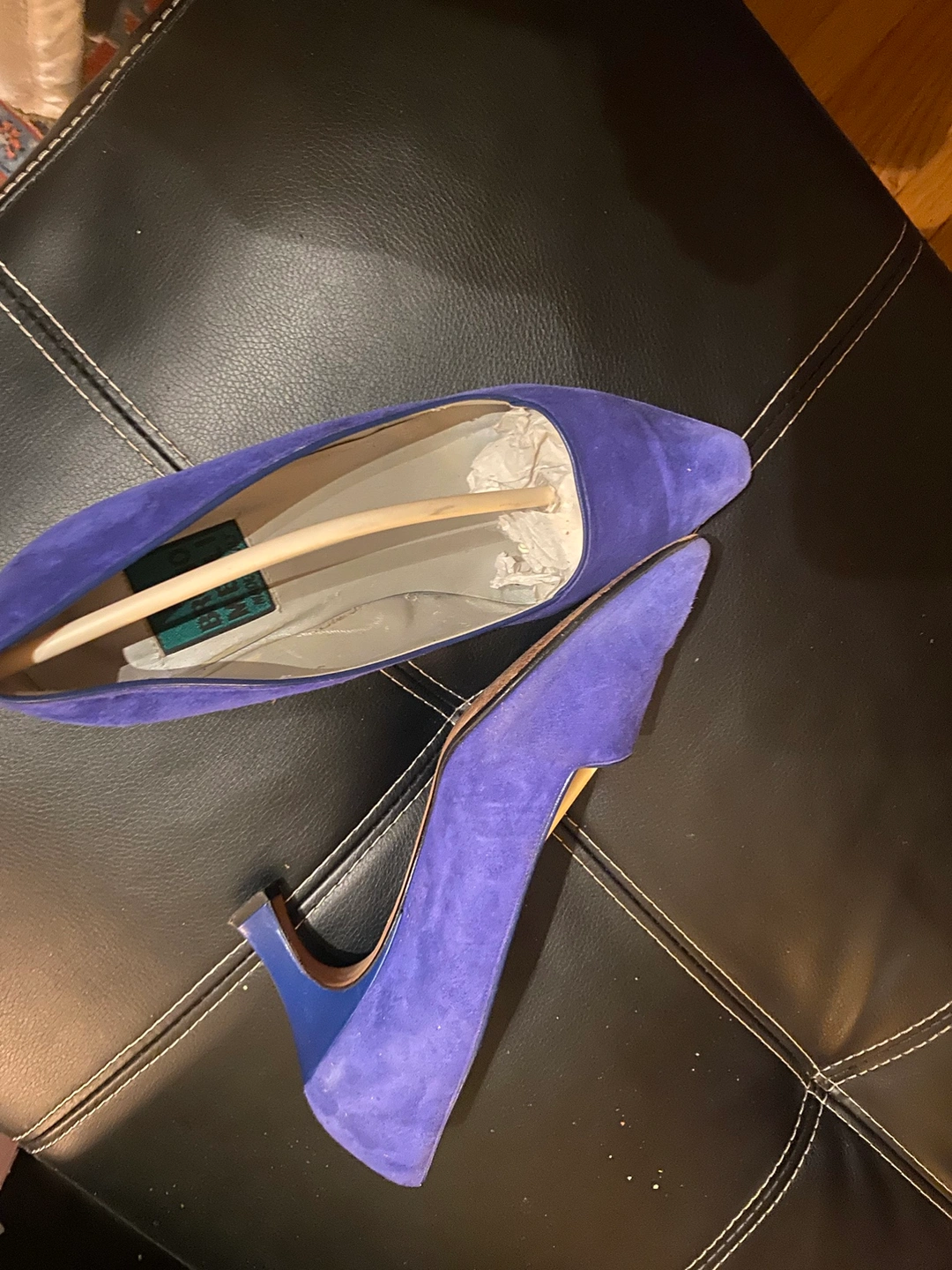 Pair of blue suede pumps with a pointed toe. They are in perfect condition in spite of terrible picture. They have a medium heel height. Made in Italy. Plus a purse same colour