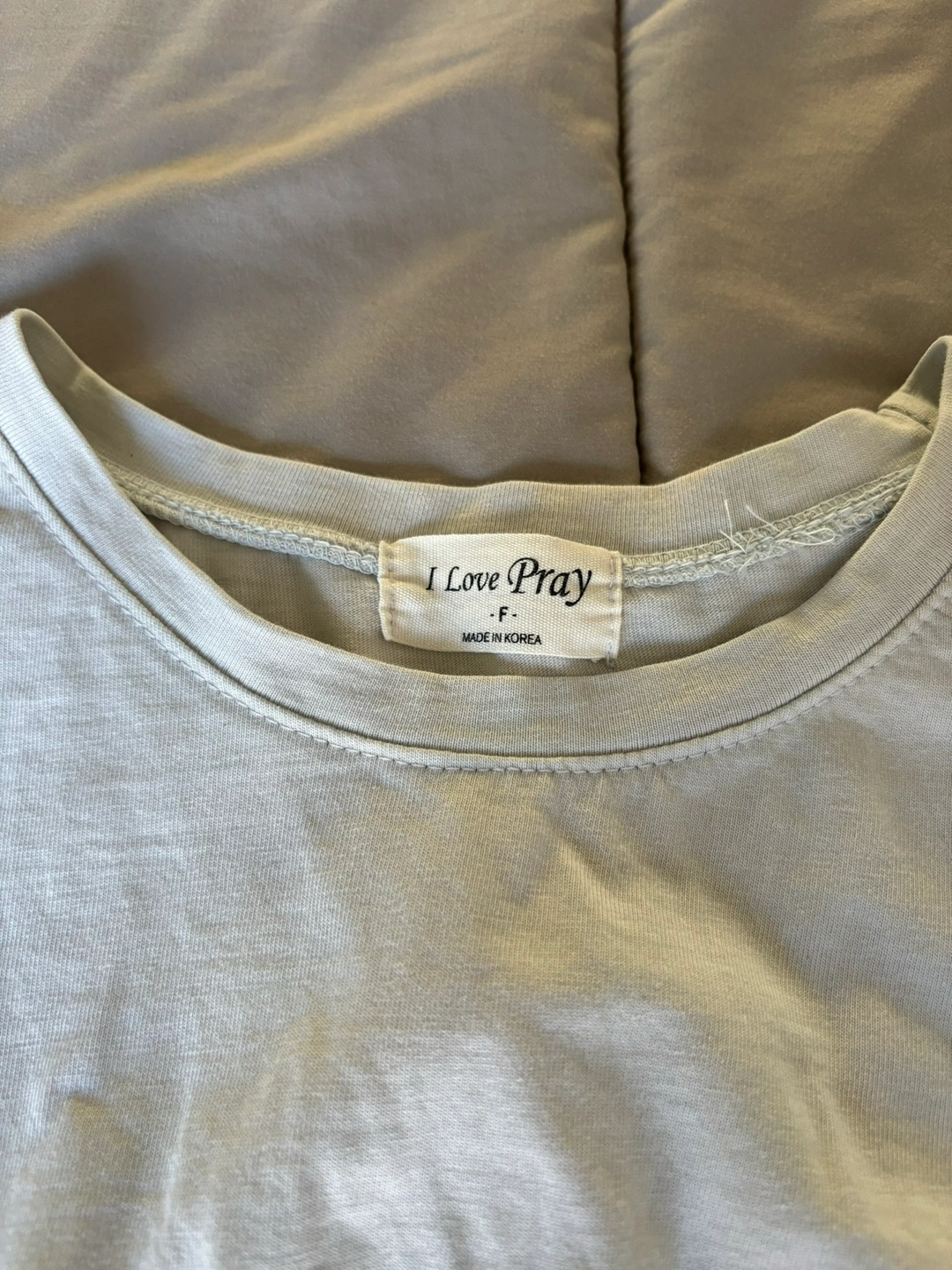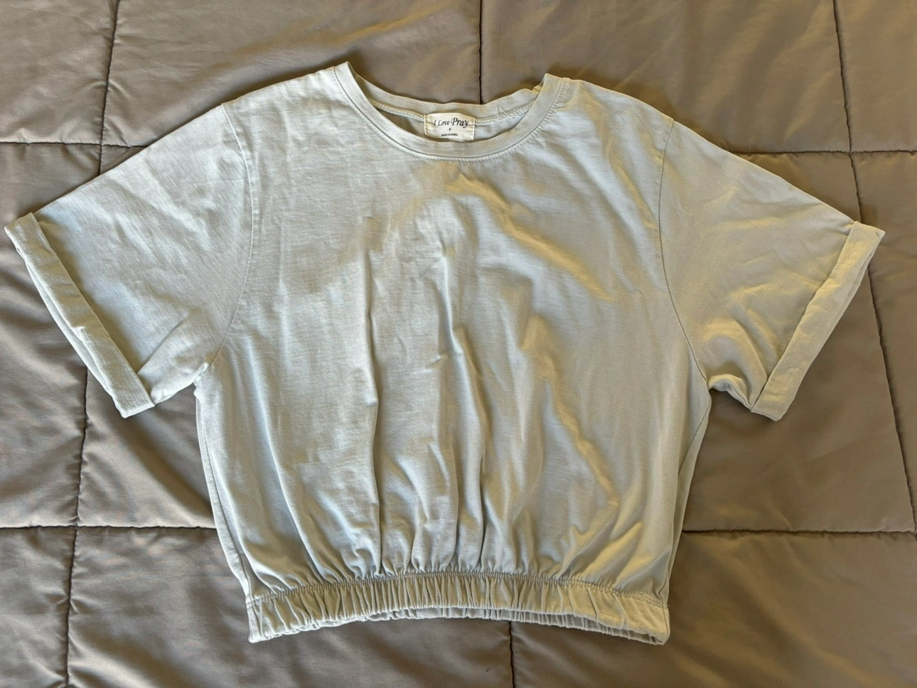A light green-grey, short-sleeved, cropped t-shirt with a gathered waist. The shirt has a round neckline and is made by a Korean brand Looks really gorgeous Smoke, pet, children free home Cash only. Delivery available not included in the price Tyndall Avenue and Thorburn Avenue