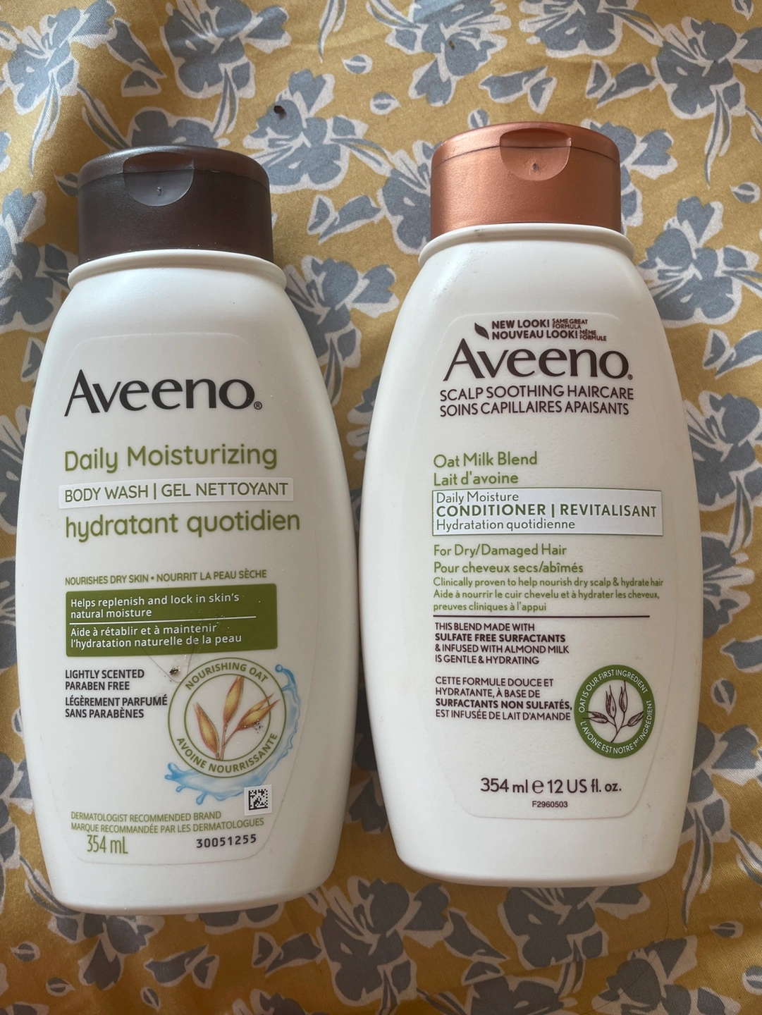 Two Aveeno bottles, one is a body wash and the other is a conditioner. Both are 354mL.