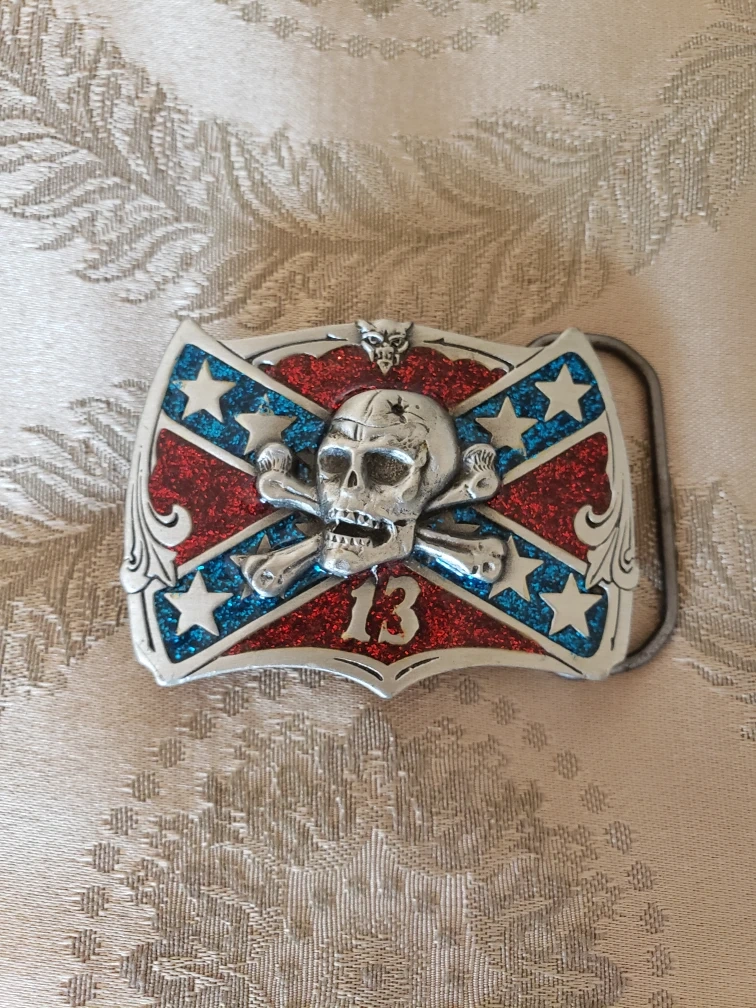 The Great American Buckle Co. Belt Buckle. The buckle features a skull and crossbones with a Confederate flag and a number 13. The back of the buckle states it is made of pure pewter and has a serial number. It also states "Copyright 1981". price $20