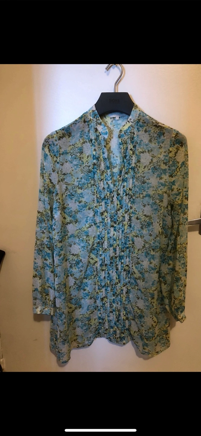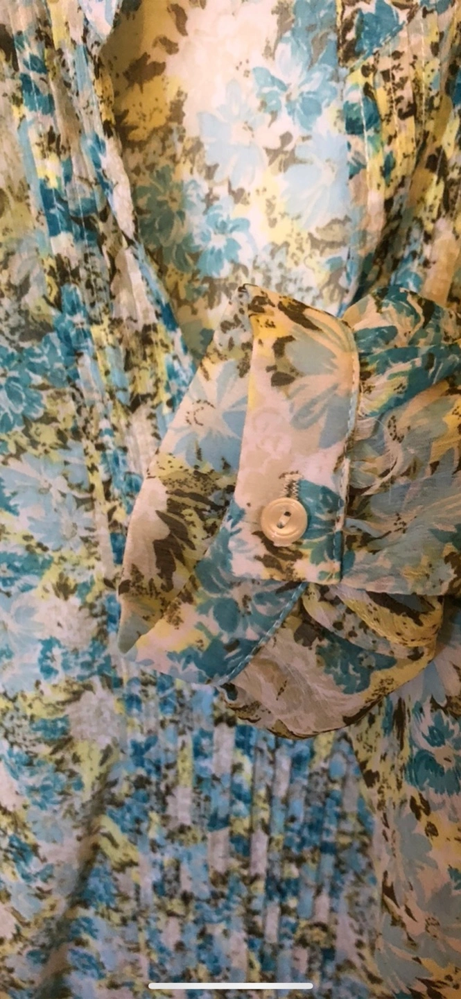 A lightweight floral patterned blouse with long sleeves and a V-neck. The blouse is semi-sheer and has a loose fit. It has a button up front.