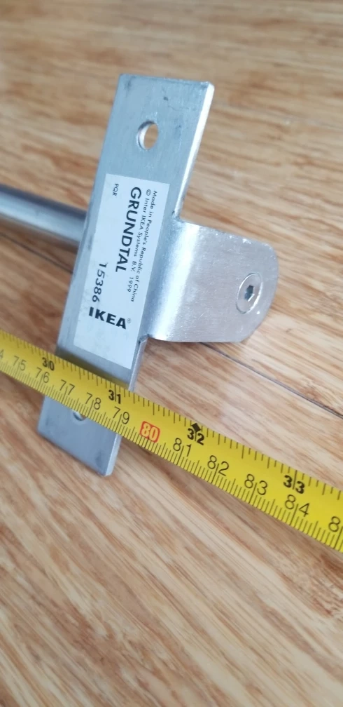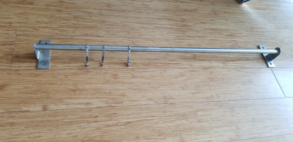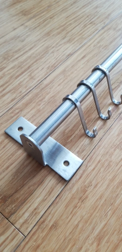 Stainless steel rail with 3 hooks. The rack measures 31.5" in length. Wall mount to hang utensils,accessories or towels.