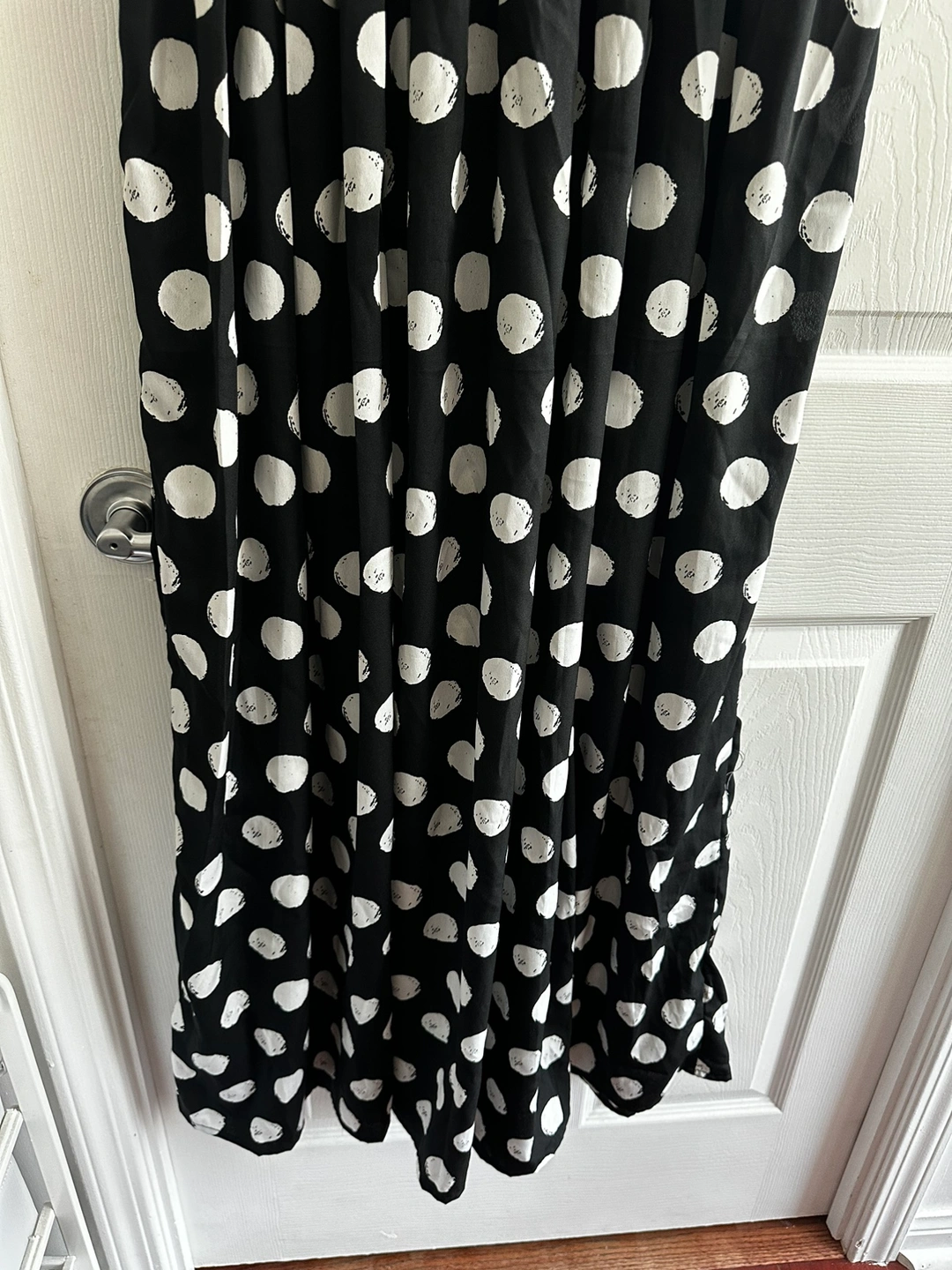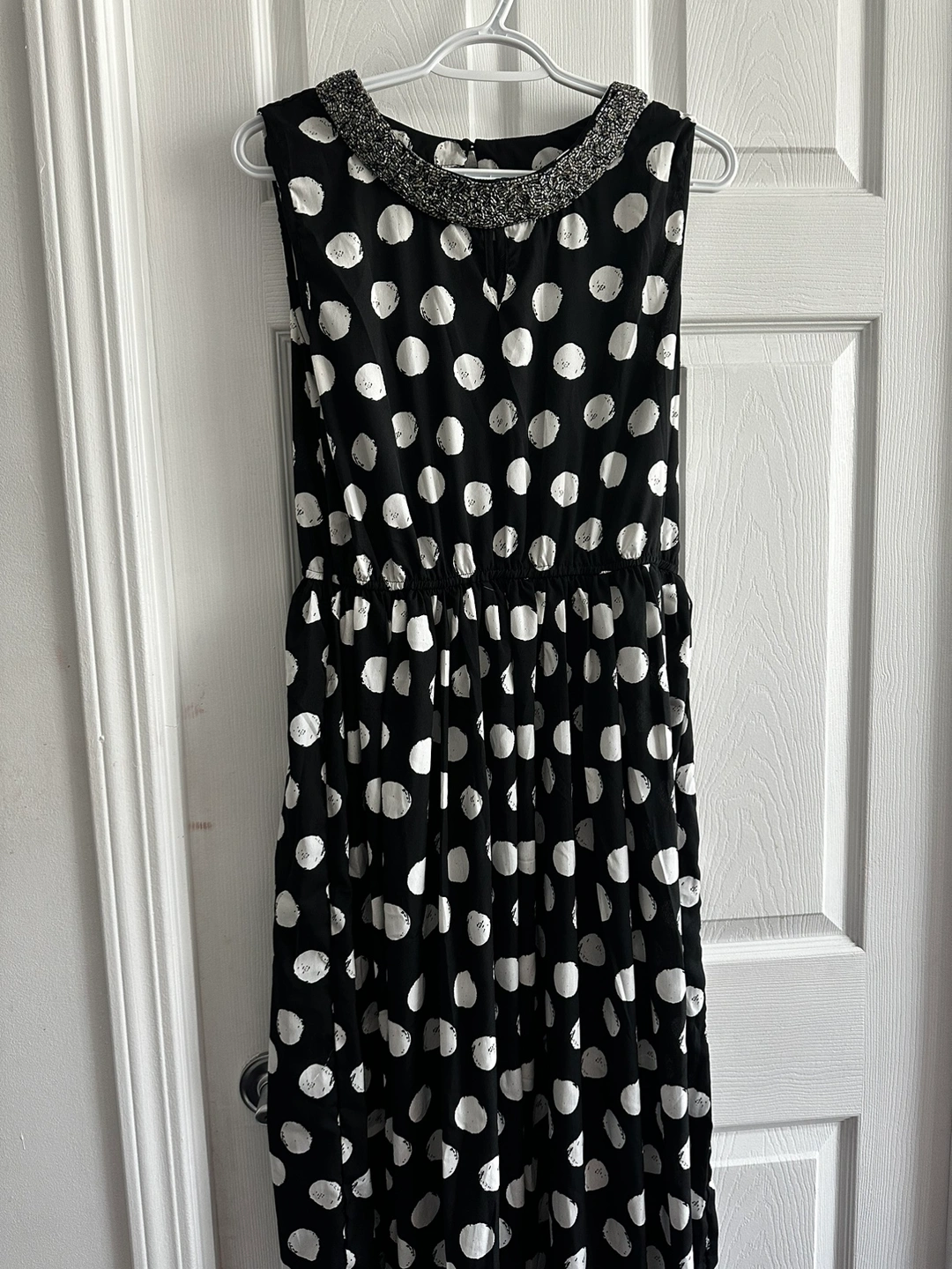 A beautiful black maxi dress with large white polka dots. It features a beaded neckline and is sleeveless. The dress is gathered at the waist, giving it a flowy and flattering fit.