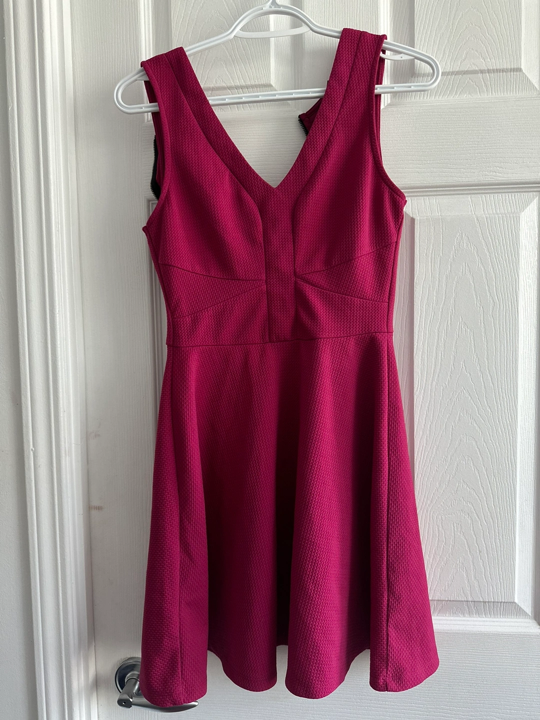This is a sleeveless, pink dress with a v-neckline and a back zipper. It has a fitted bodice and a flared skirt. It is in a size small.