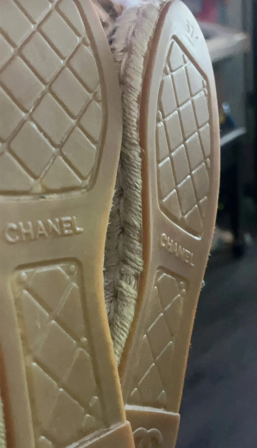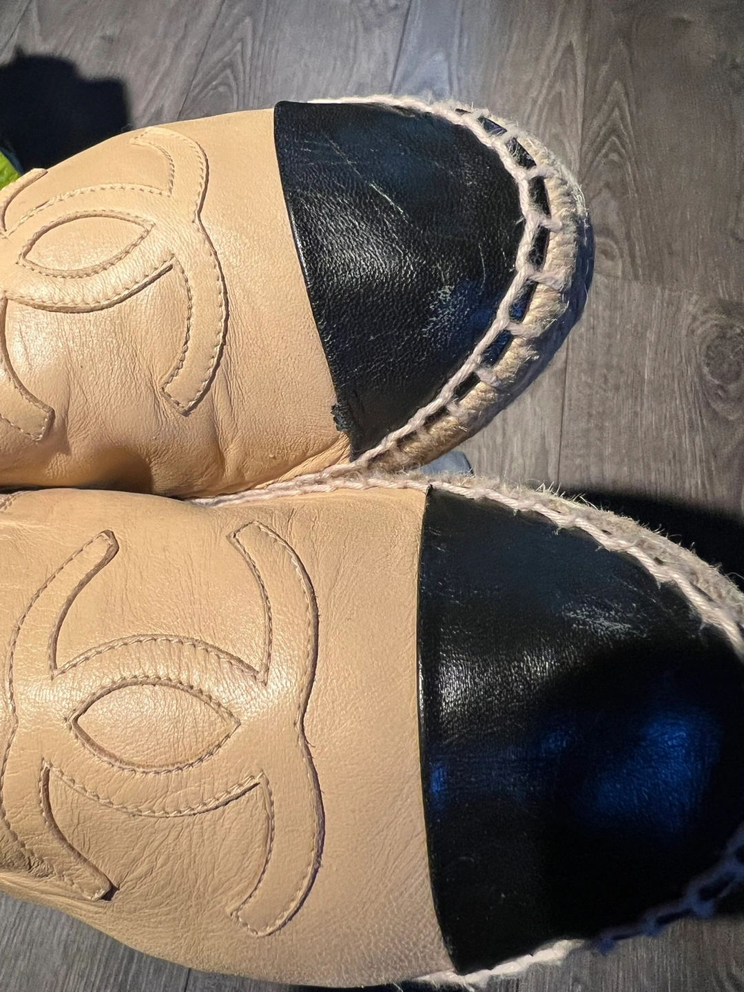 Beige and black leather espadrille shoes with a size 37. With Serial # M G29762. Made in Spain 🇪🇸. With an interlocking CC logo leather. In a great condition. Comfy to wear. Call out: just with minimal creases/stretched on heel part (L shoe). Dust bag and box are not available. For pick up near Dufferin and Eglinton intersections. Only serious inquiries. TIA 😊